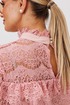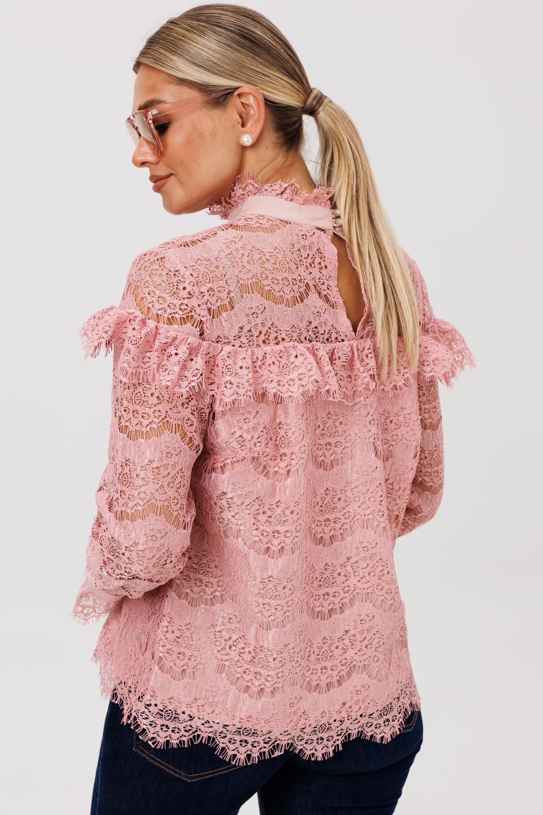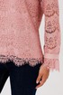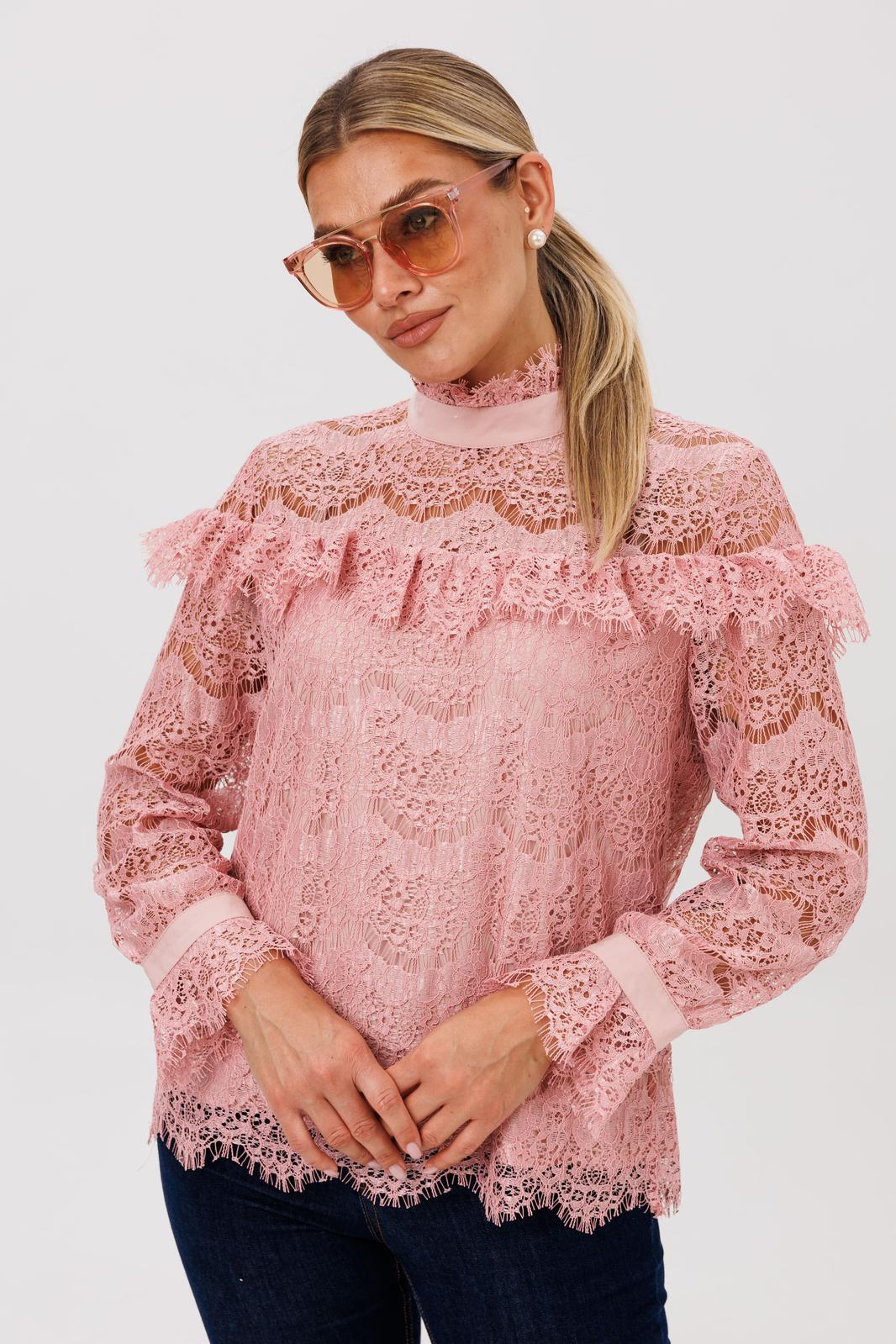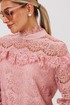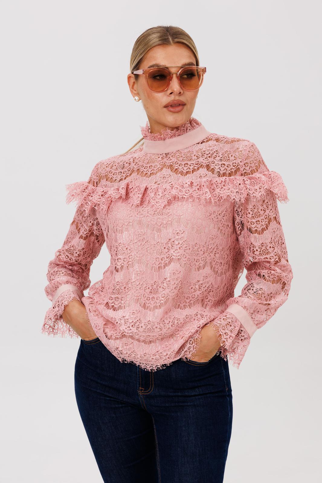 Кокетливая блуза с нотками романтизма выполнена из плотного кружевного полотна. Её прямой силуэт украшен изысканными конструкторскими деталями: отрезные кокетки по переду и спинке мягко подчеркнуты воланом, а воротник-стойка и королевские манжеты на рукавах декорированы ажурной кружевной отделкой. Застёжка на пуговицы, расположенная по задней стойке, добавляет модели особый шарм.