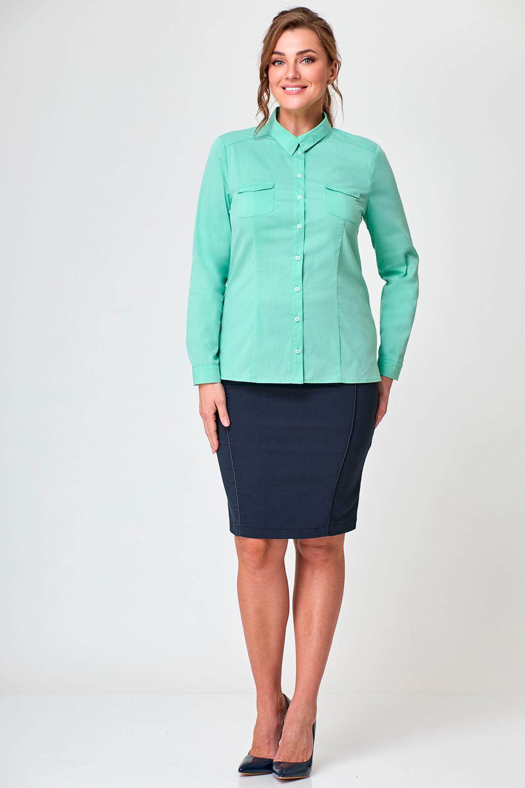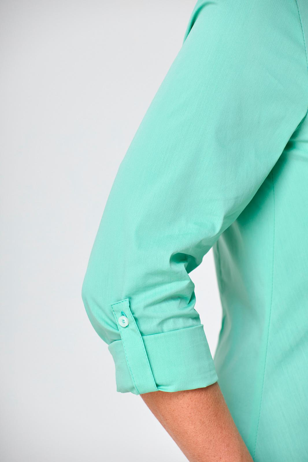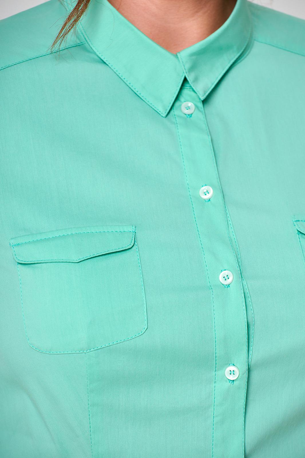 Блузка классического покроя. Полочки с нагрудными вытачками от низа, накладными карманами с закруглёнными краями. Спинка с талевыми вытачками и цельнокроеной кокеткой, переходящей на полочку. Воротник на стойке, застежка на пуговицы на цельнокроеной планке. Рукава втачные с манжетами на пуговицы, рукав регулируется патой на пуговицу.