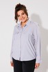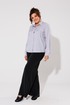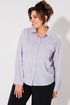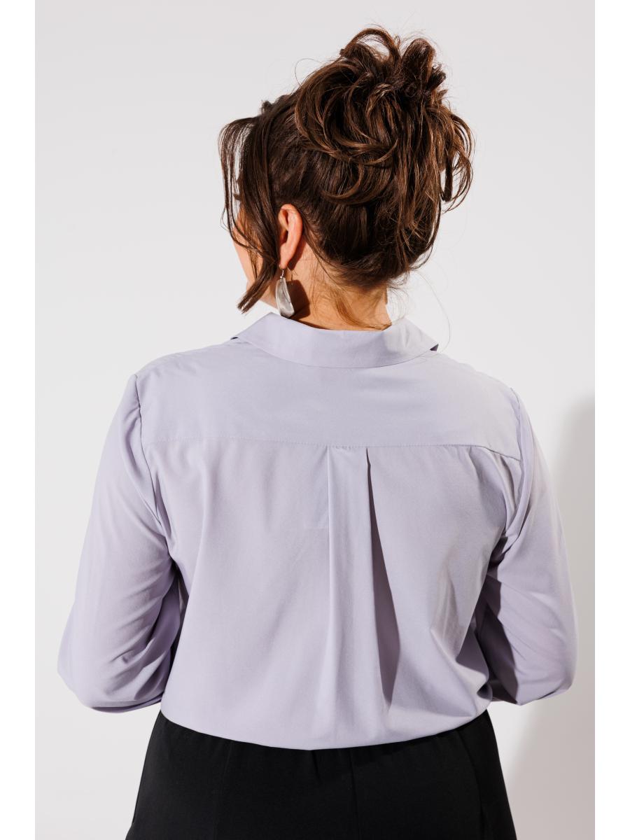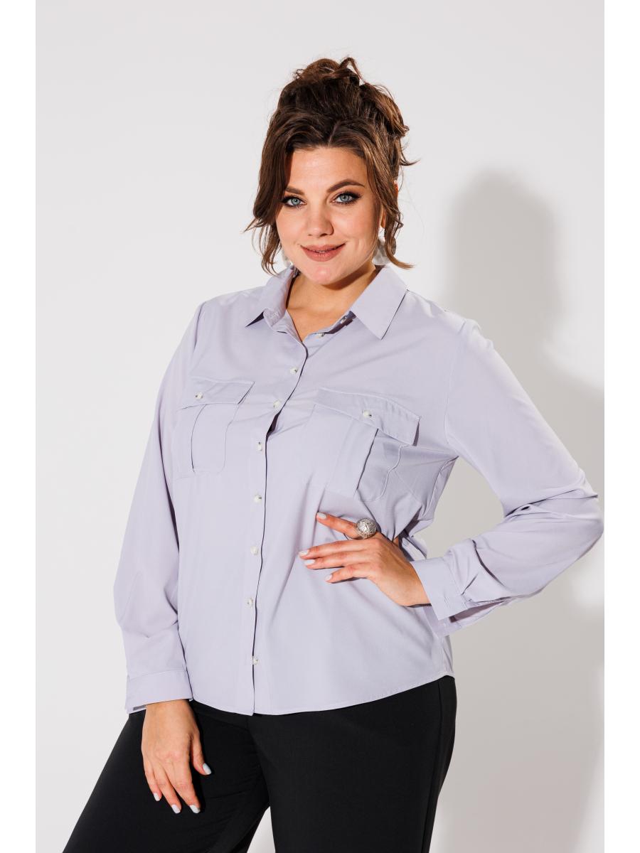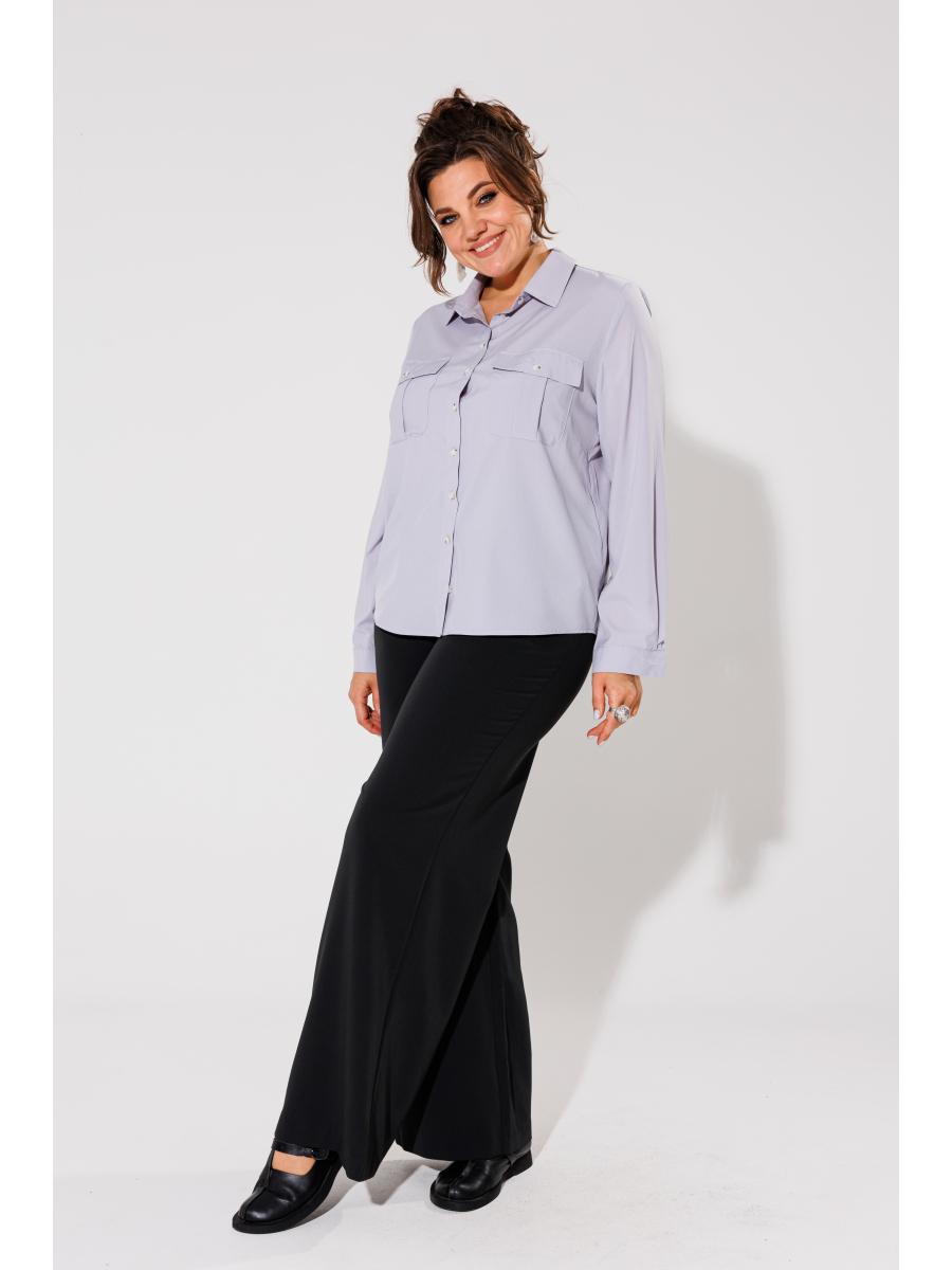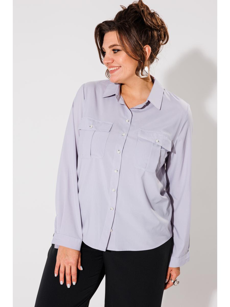 Блуза свободного прямого силуэта, средней длины, по переду выполнены накладные карманы с клапаном, по спинке двойная отрезная кокетка, заложенная складка по шву притачивания кокетки создаёт дополнительный комфорт обладательнице изделия. Воротник рубашечного типа, на отрезной стойке, застёжка центральная на петли и пуговицы.