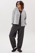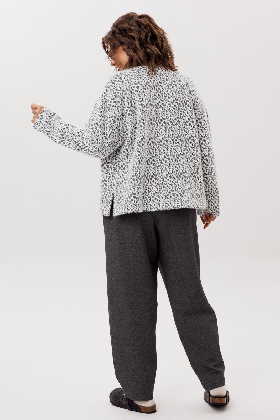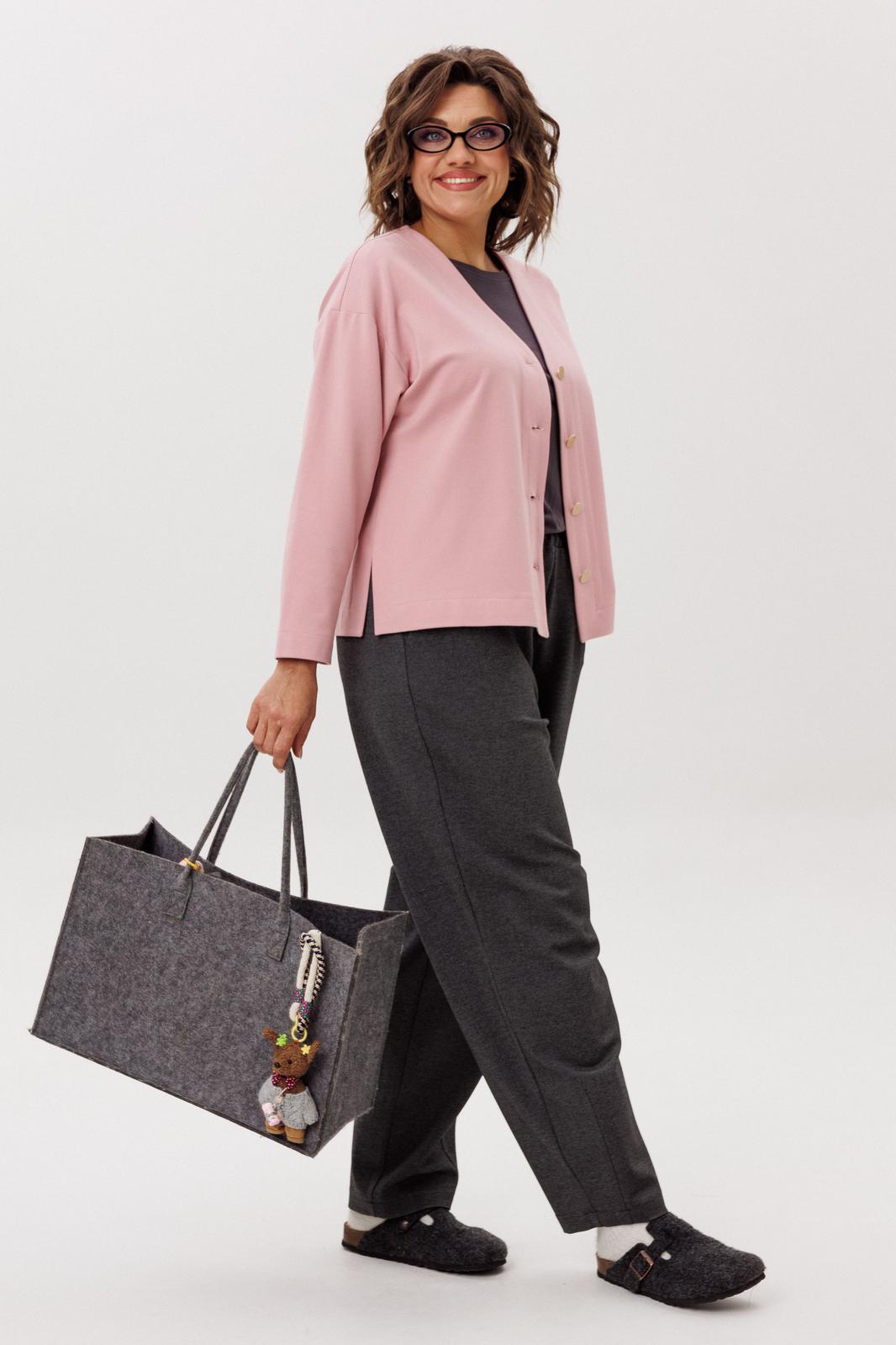 На модели в брюках цвета дымчатый тузсобран лук с пушистым жакетом 1661, розовым жакетом 1661.1 и жакетом 1778.