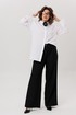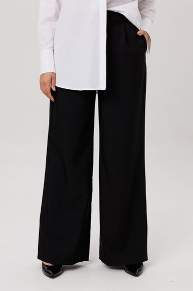 Идеальная посадка достигнута за счет эластичной резинки по спинке, которая мягко облегает фигуру, подчеркивая линию талии и обеспечивая комфорт в течение всего дня. Широкие штанины визуально удлиняют ноги, добавляя образу женственности и грации.