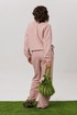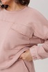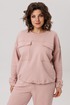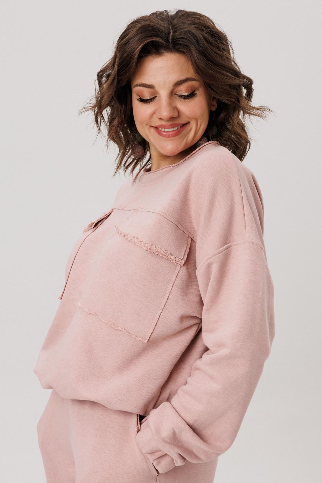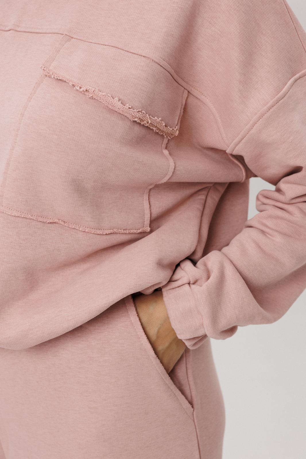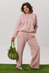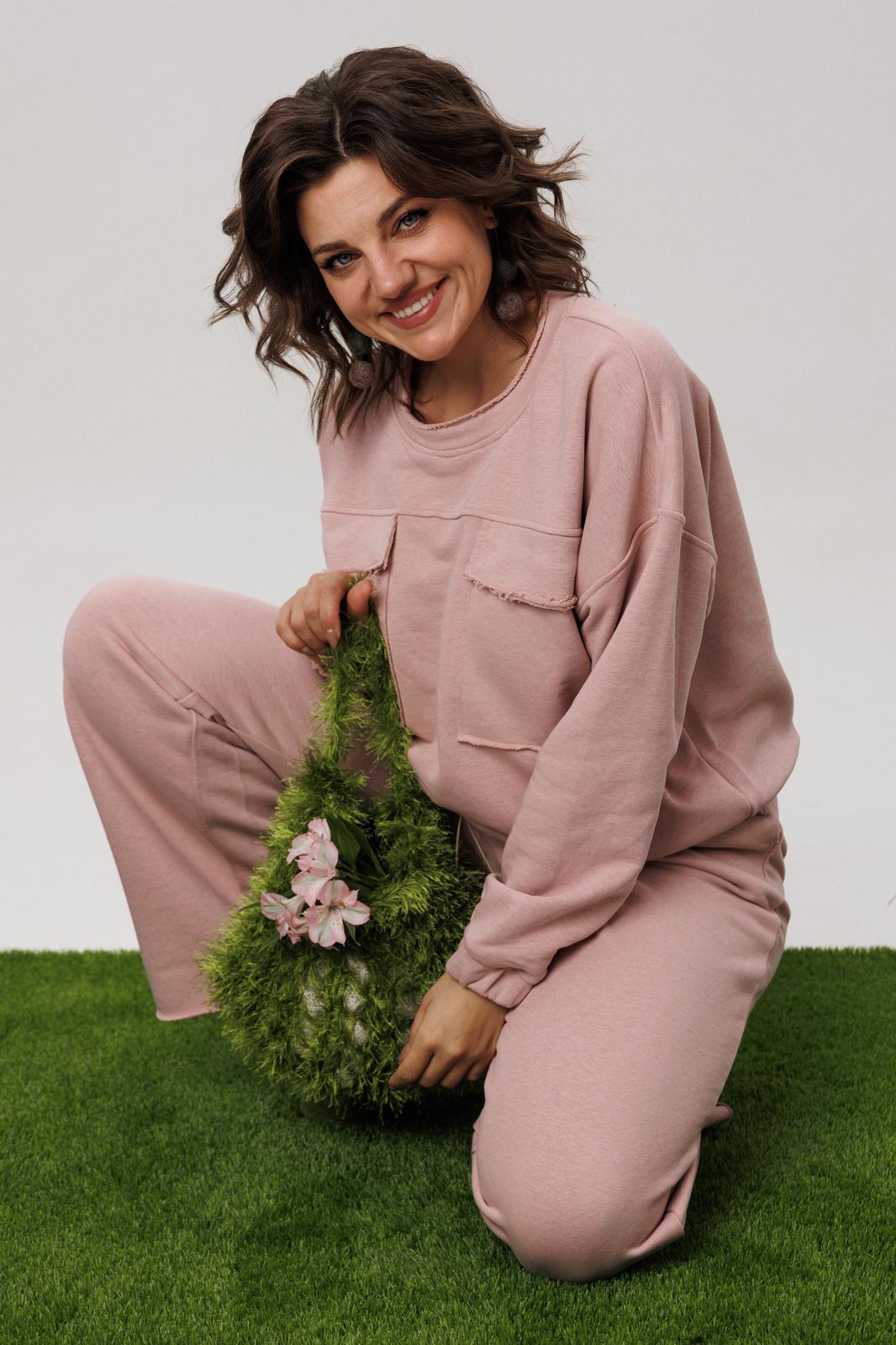 Верхняя часть костюма, выполненная в виде объемного свитшота, представляет собой мастерское сочетание расслабленных линий и продуманных деталей. Удлиненная линия плеча и длинные рукава струятся мягкими складками, завершаясь аккуратной манжетой. Фронтальная часть оформлена изящной отрезной кокеткой, а накладные карманы с клапанами, добавляюют образу тактильной выразительности. Низ свитшота, оформленный на кулиске, позволяет вам самостоятельно регулировать степень свободы и объем, делая силуэт именно таким, как вам хочется сегодня.