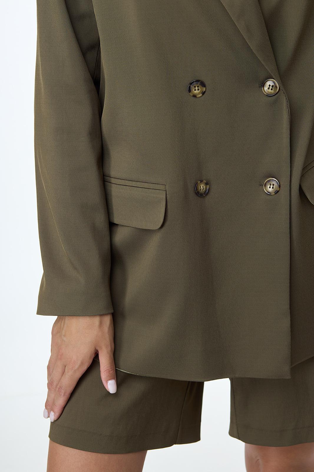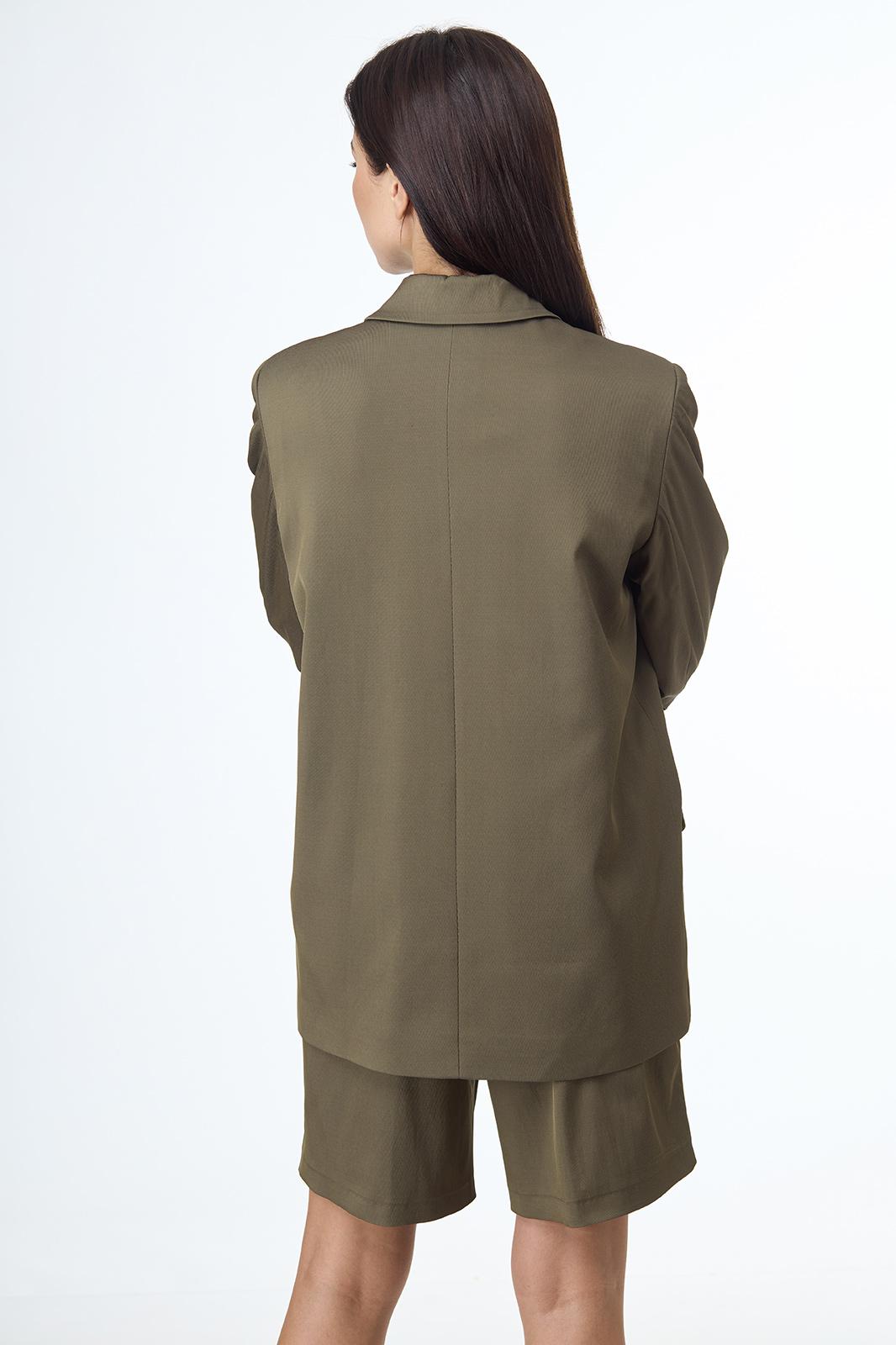 Жакет прямого силуэта, двубортный с отложным воротником и лацканами. По переду функциональные карманы с клапанами. Втачные рукава. Спинка со средним швом. Выполнен на подкладке.