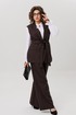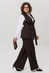 Этот элегантный костюм, состоящий из жилета и брюк, воплощает в себе утонченность и уверенность. Полуприлегающий силуэт жилета мягко подчеркивает линии фигуры, создавая гармоничный баланс между строгостью и женственностью. Однобортная застёжка на петли и пуговицы придает образу аккуратность и завершенность, а отложные лацканы воротника добавляют ноту классической сдержанности.