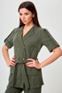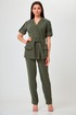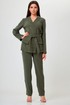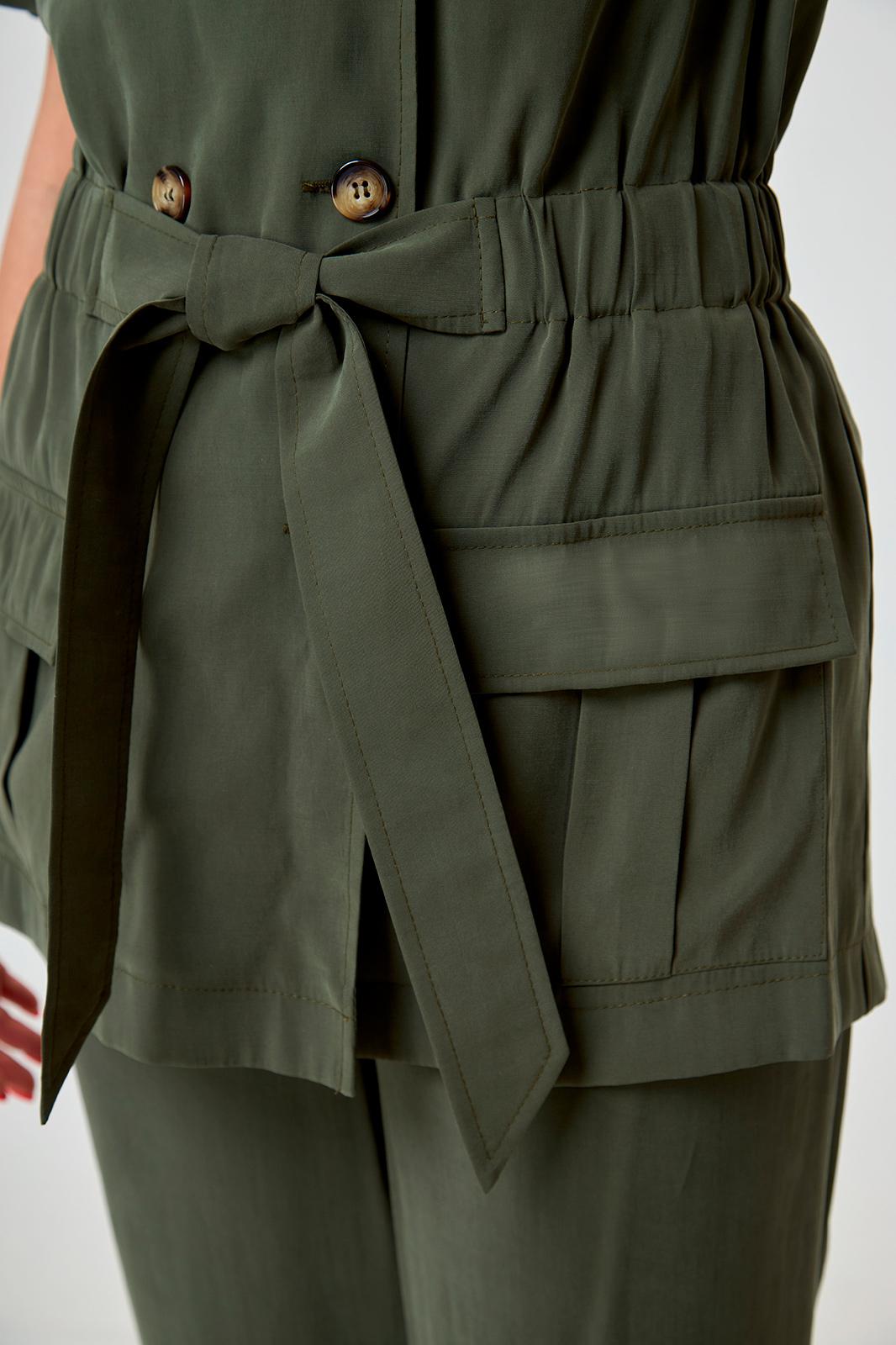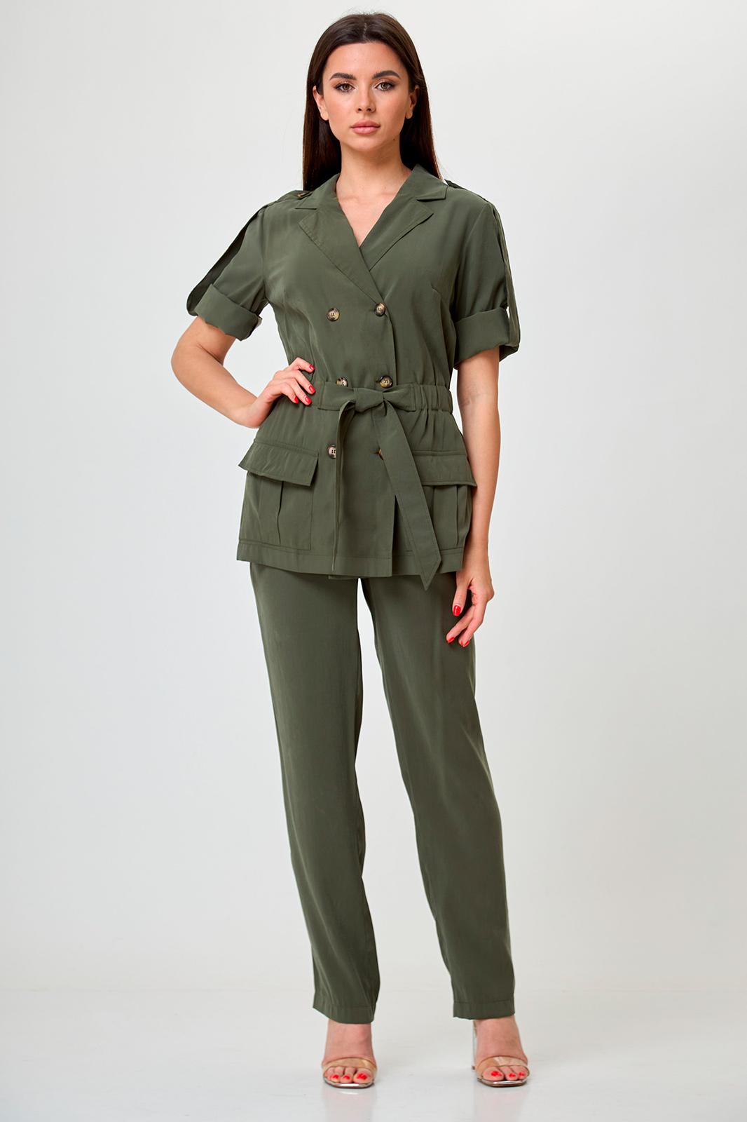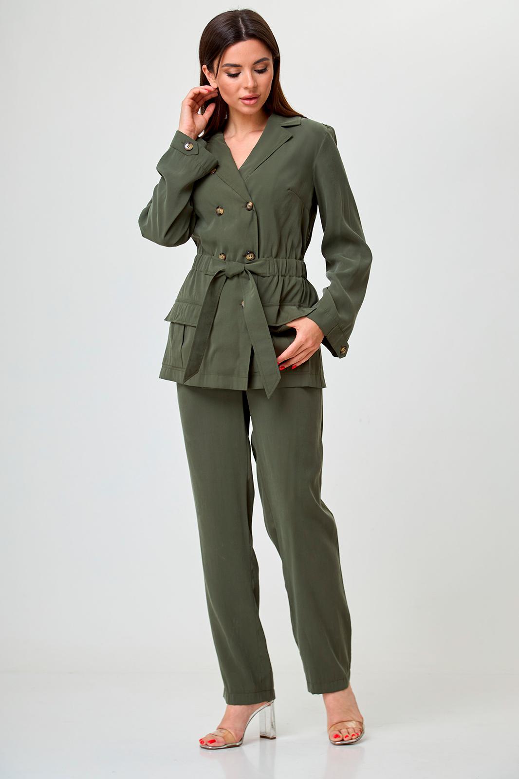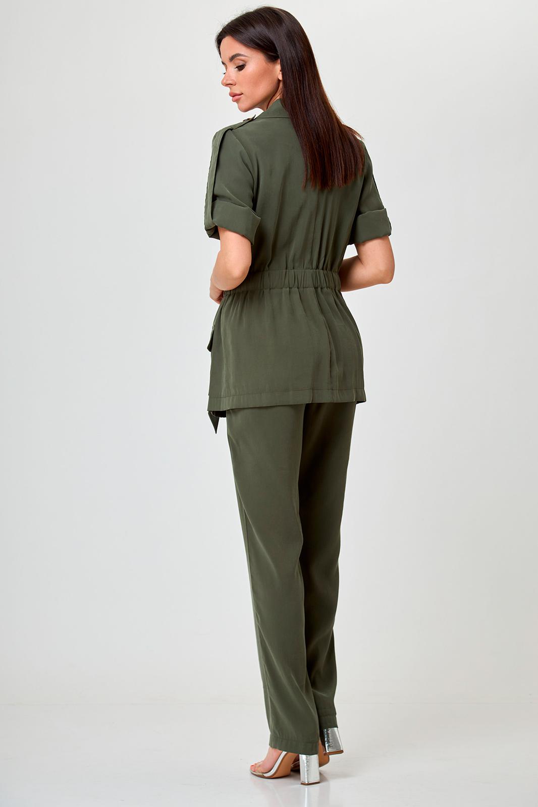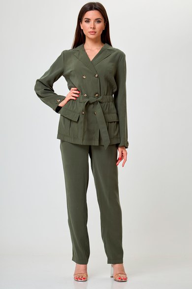 Брючный костюм в стиле сафари - это минималистичный образ с продуманными деталями кроя: двубортный жакет без подкладки свободного, спокойного силуэта с втачными длинными рукавами и патами для регулирования длины. Отложной воротник с бортами, накладные карманы с клапанами, в области талии эластичная лента с завязывающимся поясом.