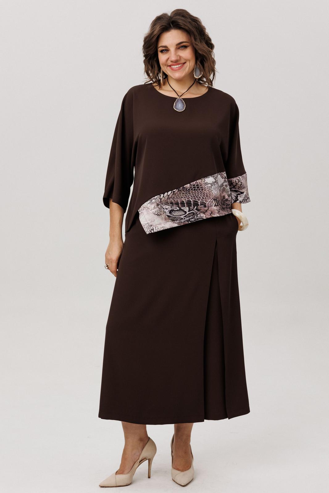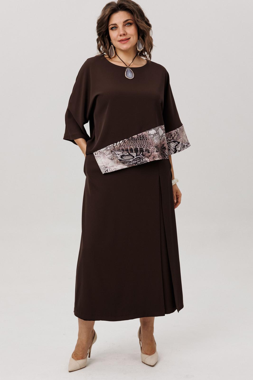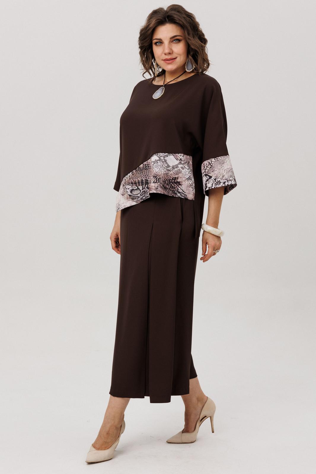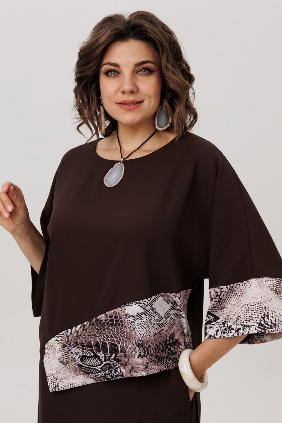 Сочетание строгого силуэта и лёгкой небрежности в цвете «древесная змея». Его основу составляет блузон шоколадного оттенка, оживлённый тонким змеиным узором. Он свободно обрисовывает фигуру, смягчая линии цельнокроеными рукавами. А его главная деталь - фигурный, словно волной очерченный низ, который придаёт статичному крою неожиданную динамику.