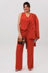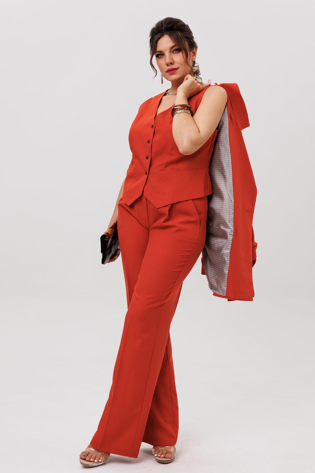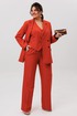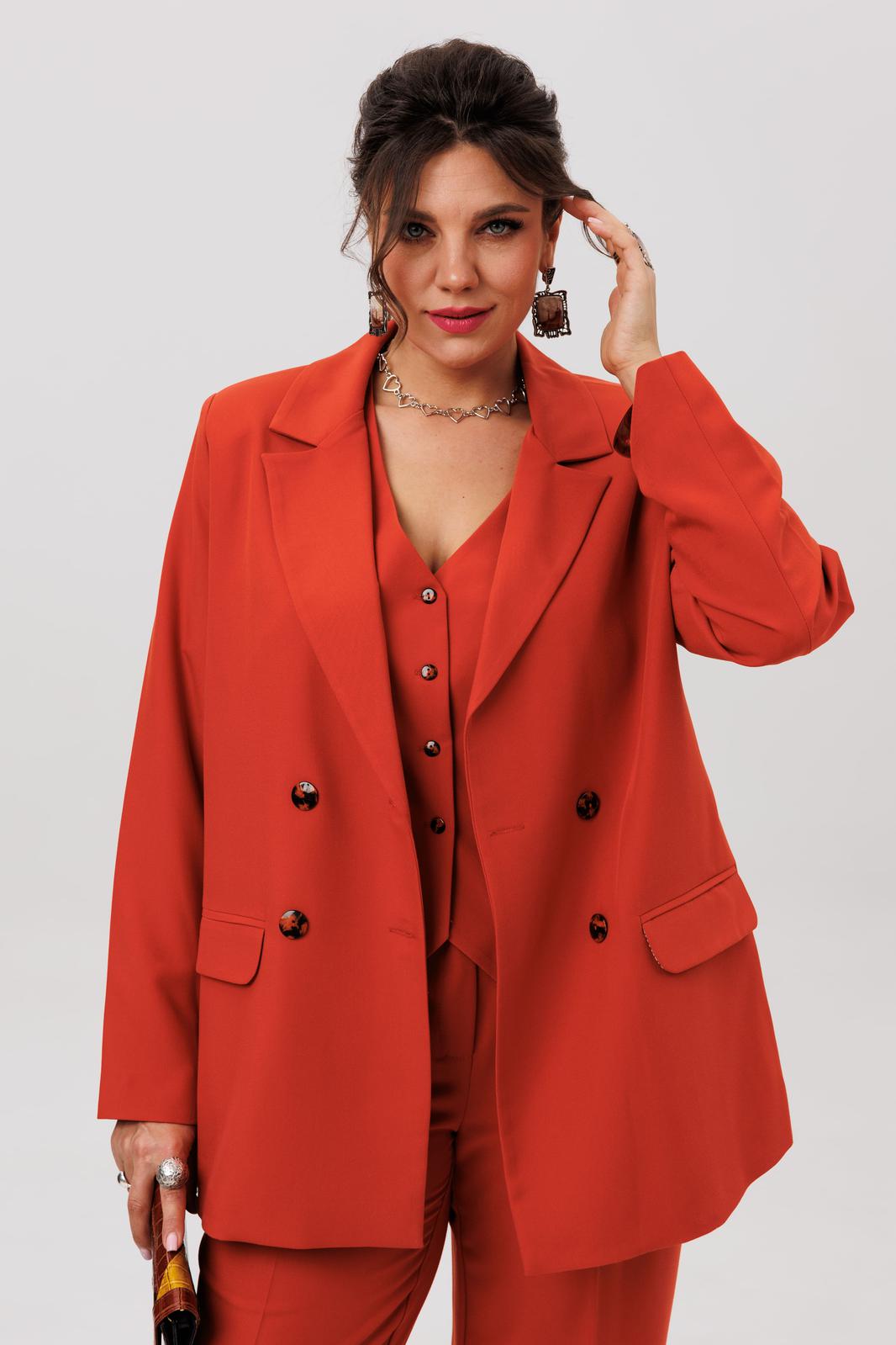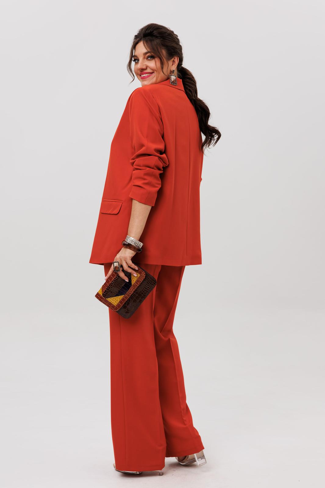 Этот костюм цвета «пряный оранжевый» - воплощение безупречного вкуса и современной женственности. Это не просто ансамбль, а капсула для вдохновения: двубортный жакет свободного прямого кроя с четкими лацканами и функциональными карманами задает тон уверенной элегантности.