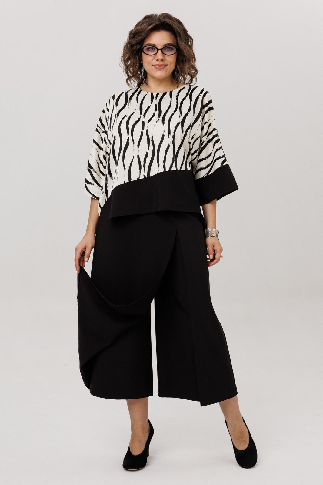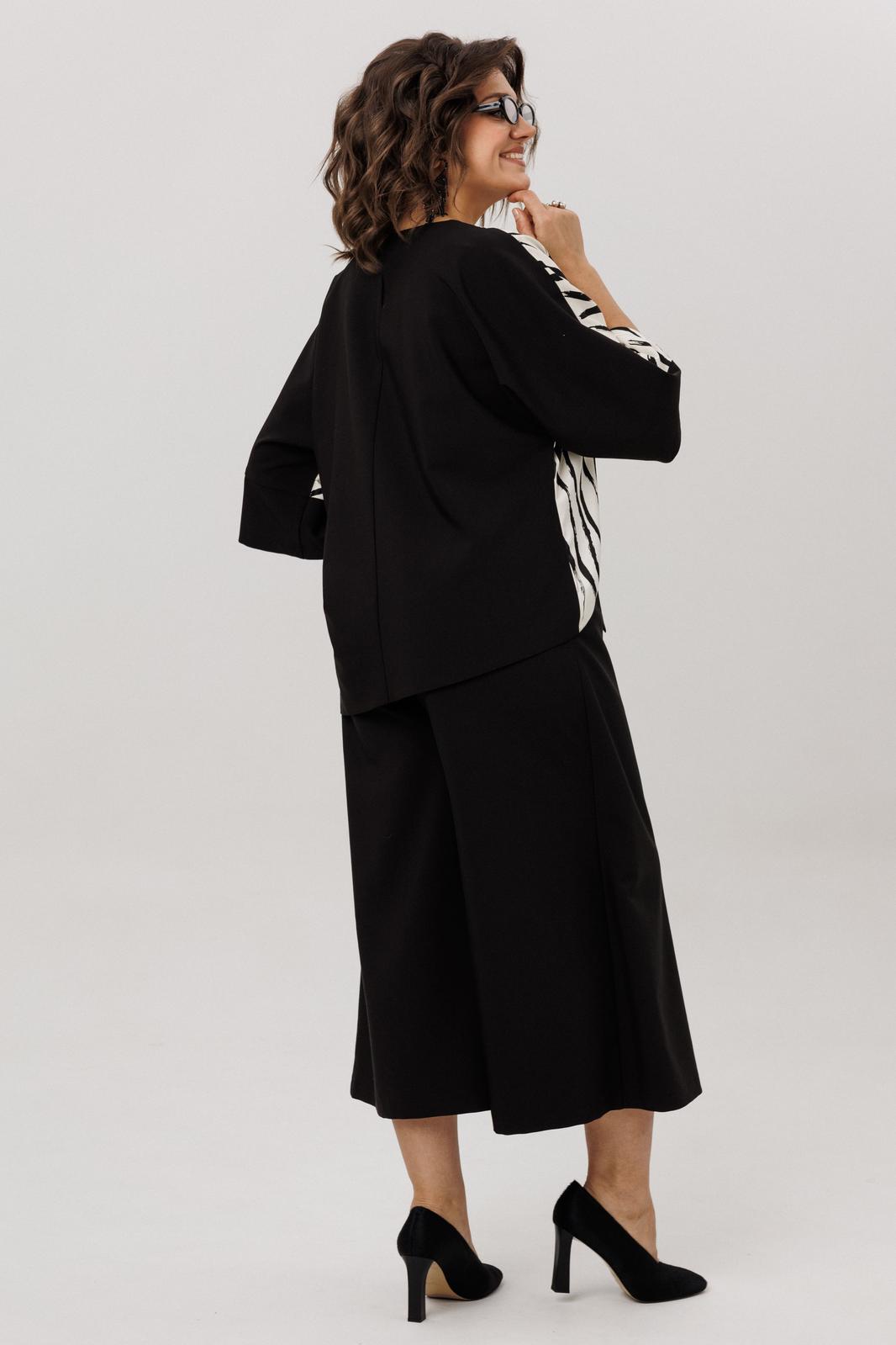 Низ костюма это юбка-брюки-кюлоты на высокой талии, струящиеся и расклешённые. Модель на запах с мягкими складками создаёт ощущение простора и лёгкости, а скрытые, фигурные карманы в швах берегут чистоту линий.