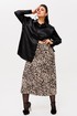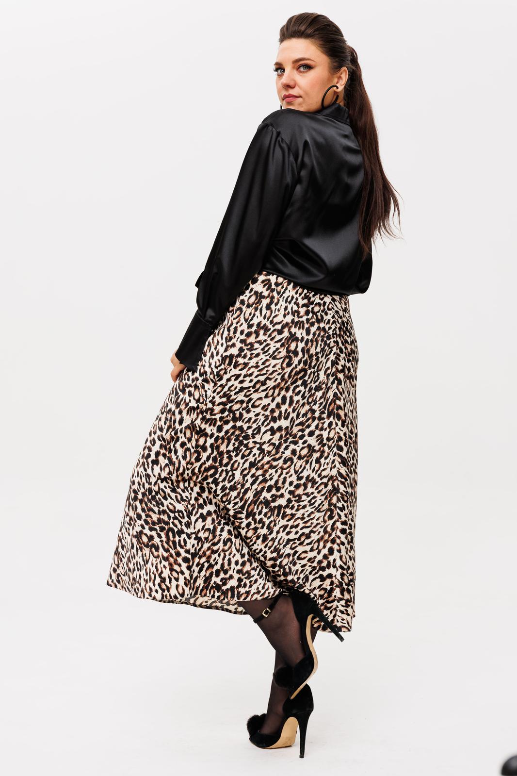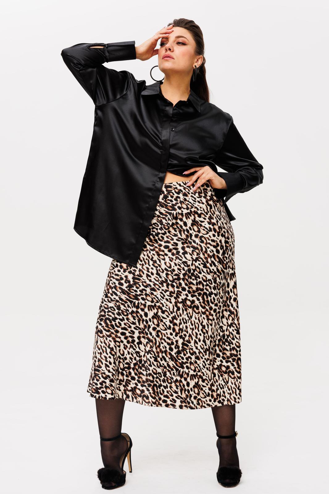 На модели в цвете «леопардовый шик» созданы образы с юбкой 1291, топом 1429, брюками 1737 и рубашкой 1203.