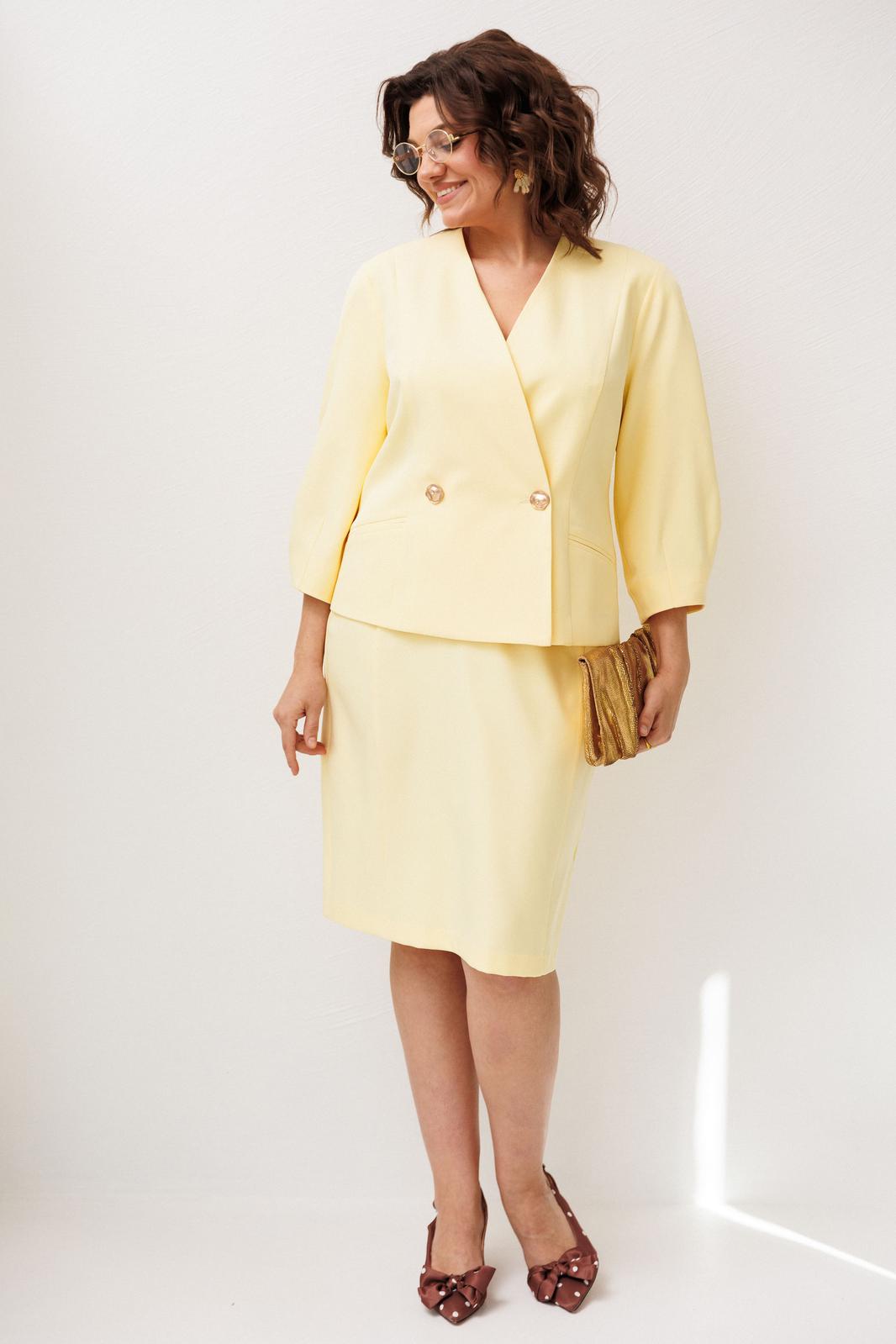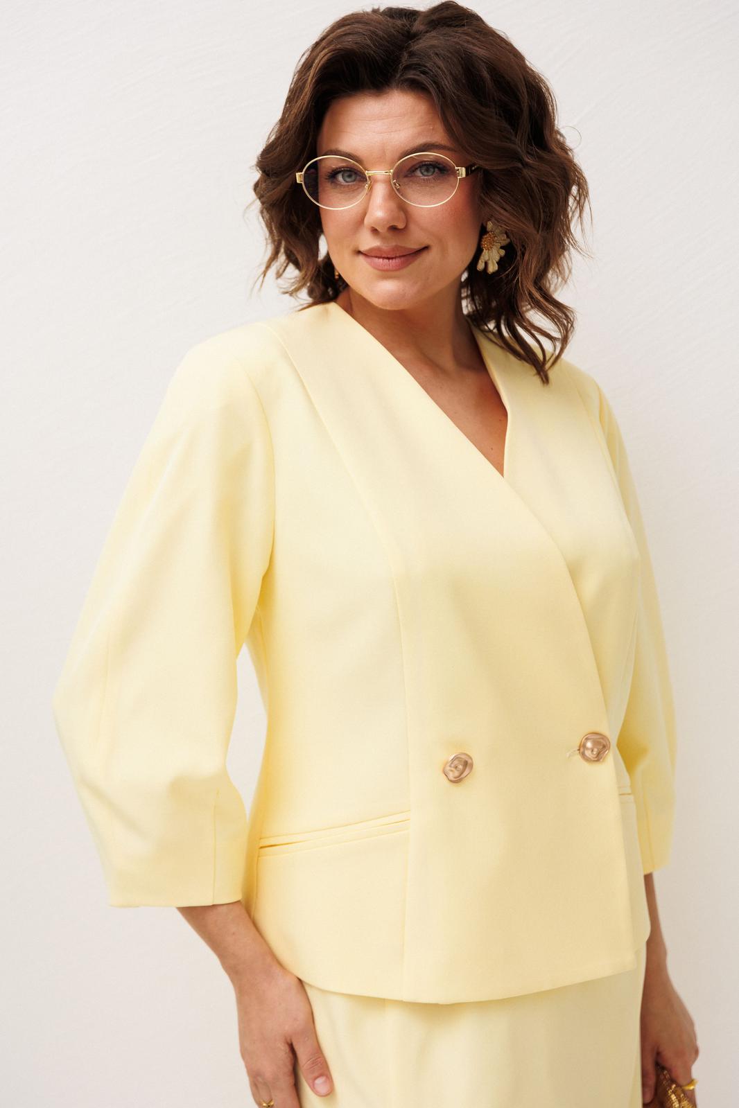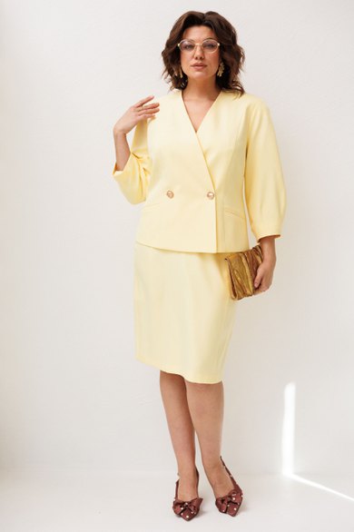 Костюм в нежном желтом оттенке «иволга» звучит спокойно и благородно, создавая образ, в котором сочетаются женственность, лёгкость и уверенная элегантность.