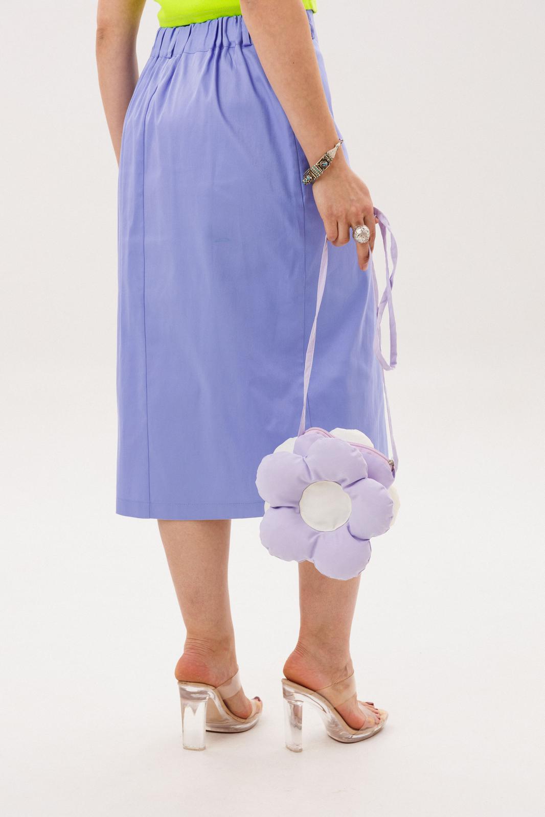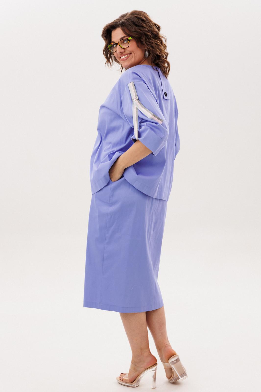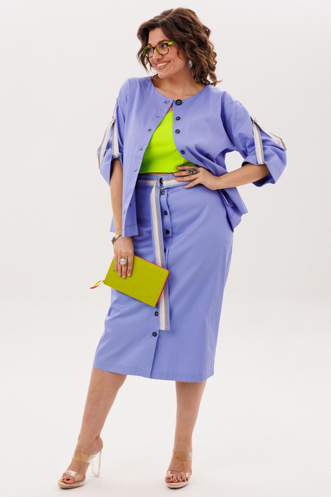 Главный акцент - игра контрастов: глубокий, насыщенный «джасаранский фиолетовый» цвет костюма служит идеальным фоном для салатового топа с асимметричным верхним краем. Эта смелая цветовая пара звучит как гимн солнечной весне и сочному лету, наполняя повседневность свежестью и жизнерадостной энергией.