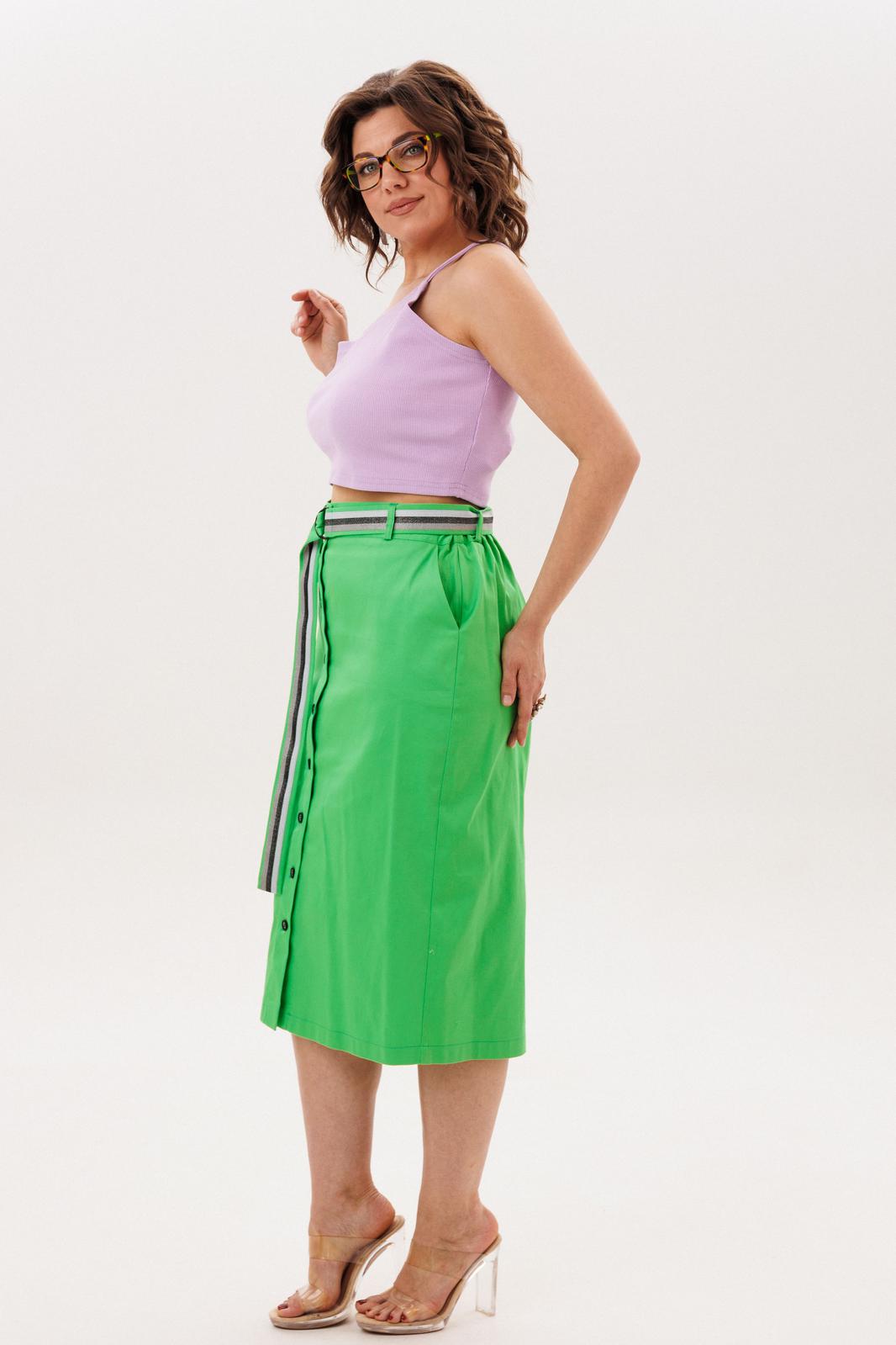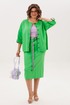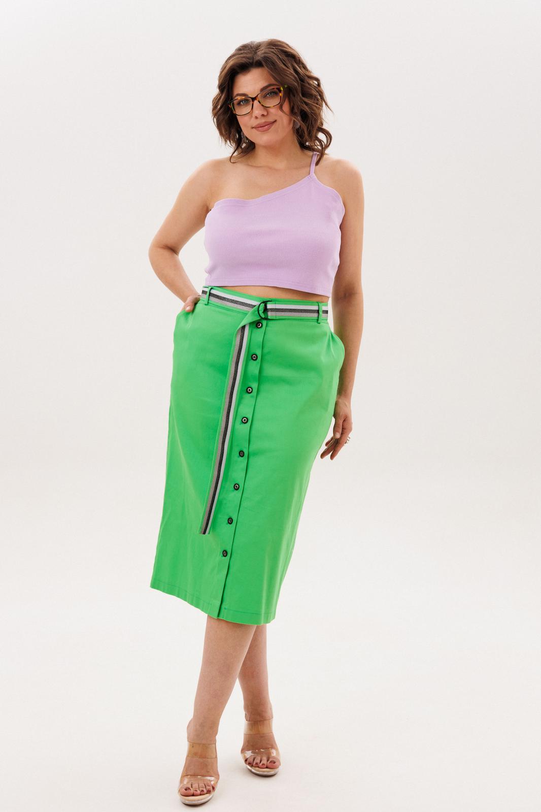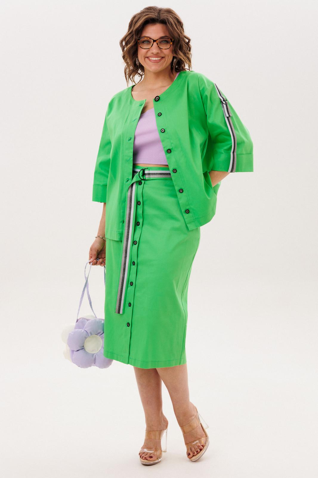 Главный акцент - игра контрастов: глубокий, насыщенный «летний зеленый» цвет костюма служит идеальным фоном для лавандового топа с асимметричным верхним краем. Эта смелая цветовая пара звучит как гимн солнечной весне и сочному лету, наполняя повседневность свежестью и жизнерадостной энергией.