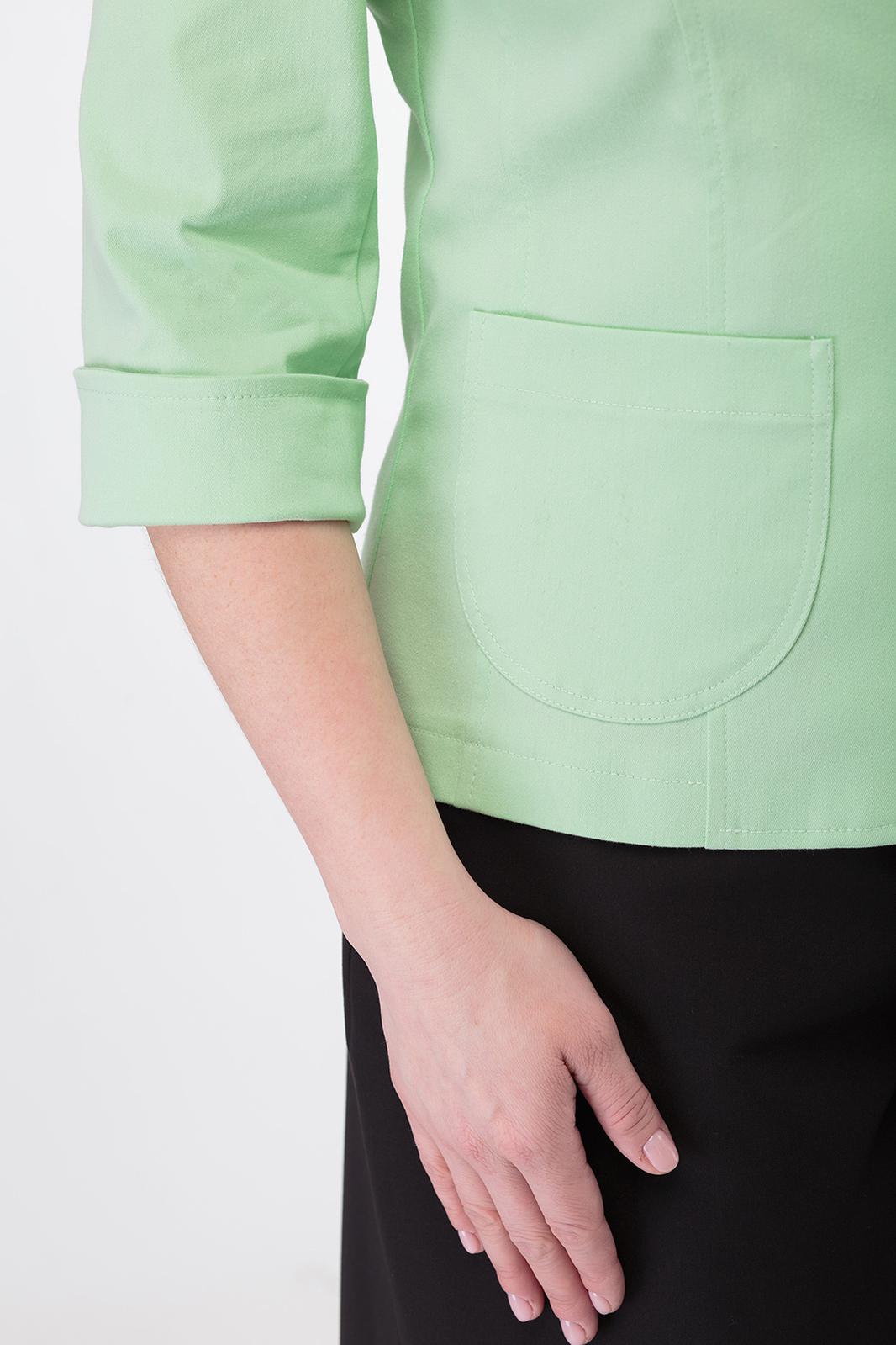 Полуприлегающий силуэт жакета со стройными рельефами, отложной воротник с бортами. Центральная застежка на пуговицы. Накладные карманы. Втачной рукав 3/4 длины с отворотом. Спинка с рельефами и средним швом.