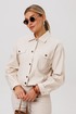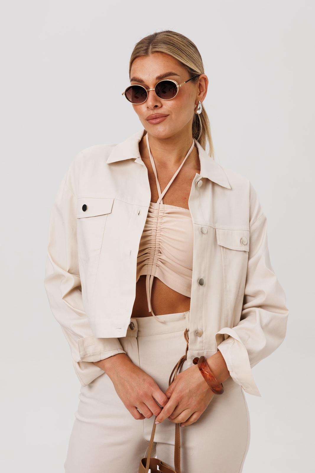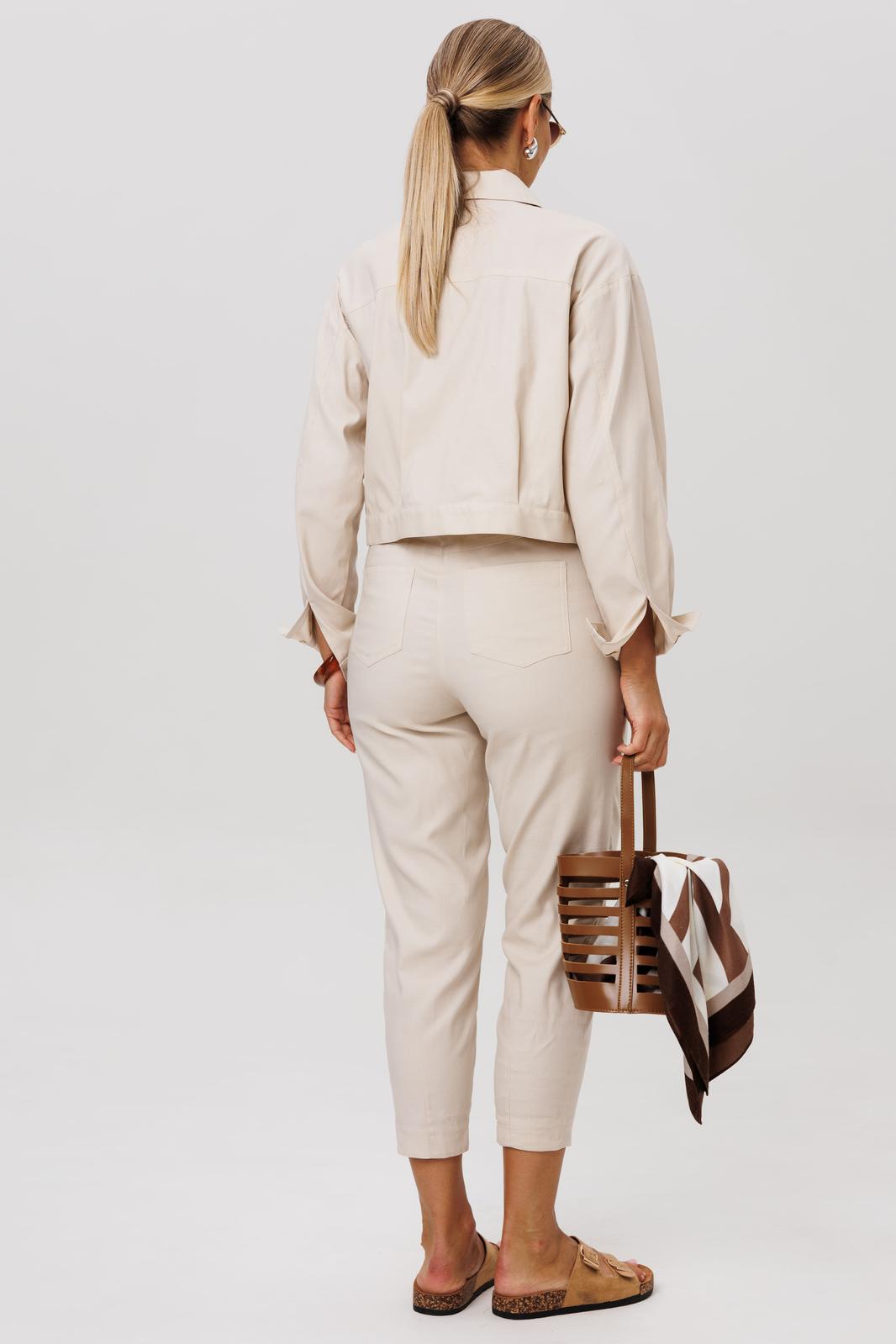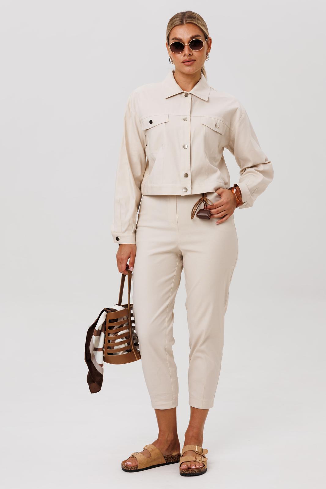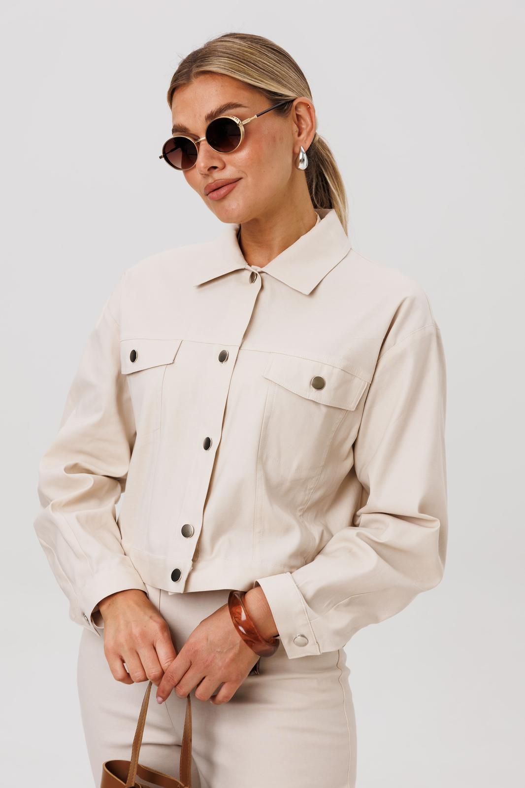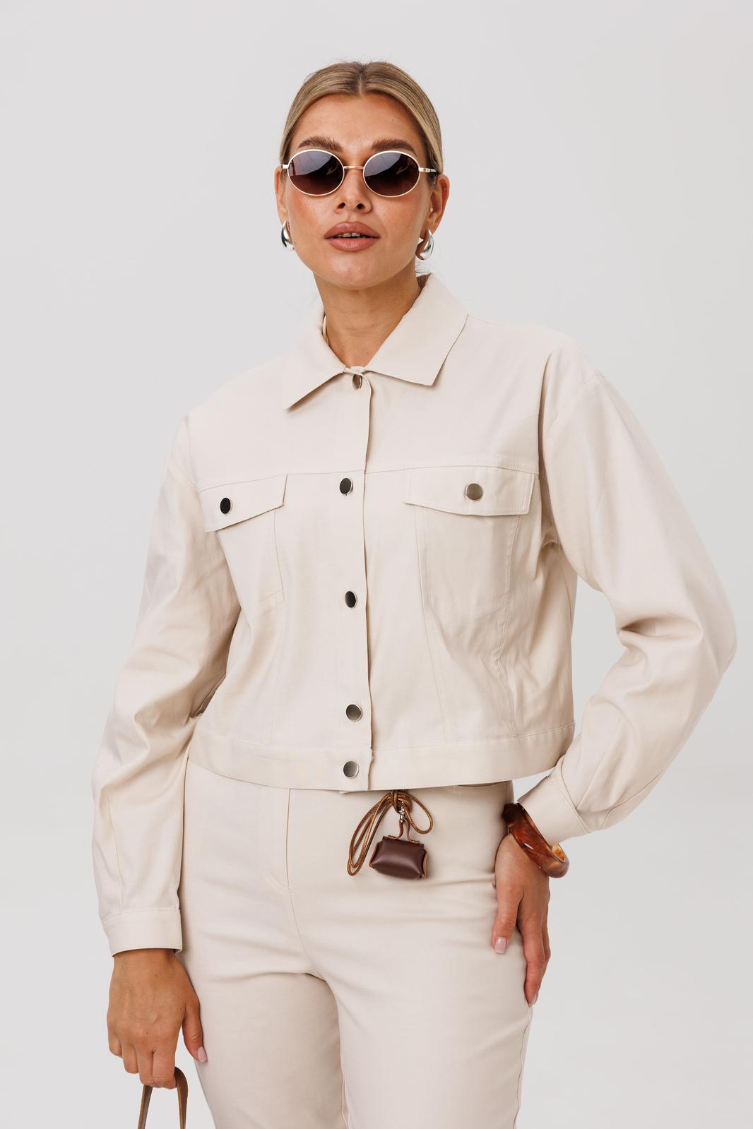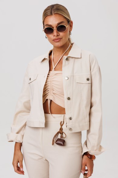 Жакет укороченный, прямого кроя. Переднюю часть украшают нагрудные карманы с декоративными клапанами. Застёжка на петли и кнопки добавляет модели характер, а спинку завершает изящная кокетка. Длинные рукава заканчиваются манжетами, а горловина обработана аккуратным воротником.