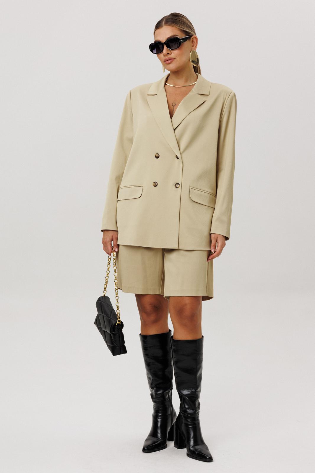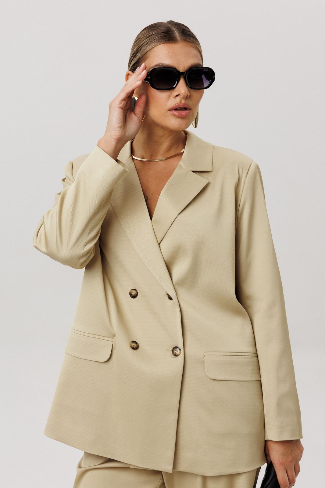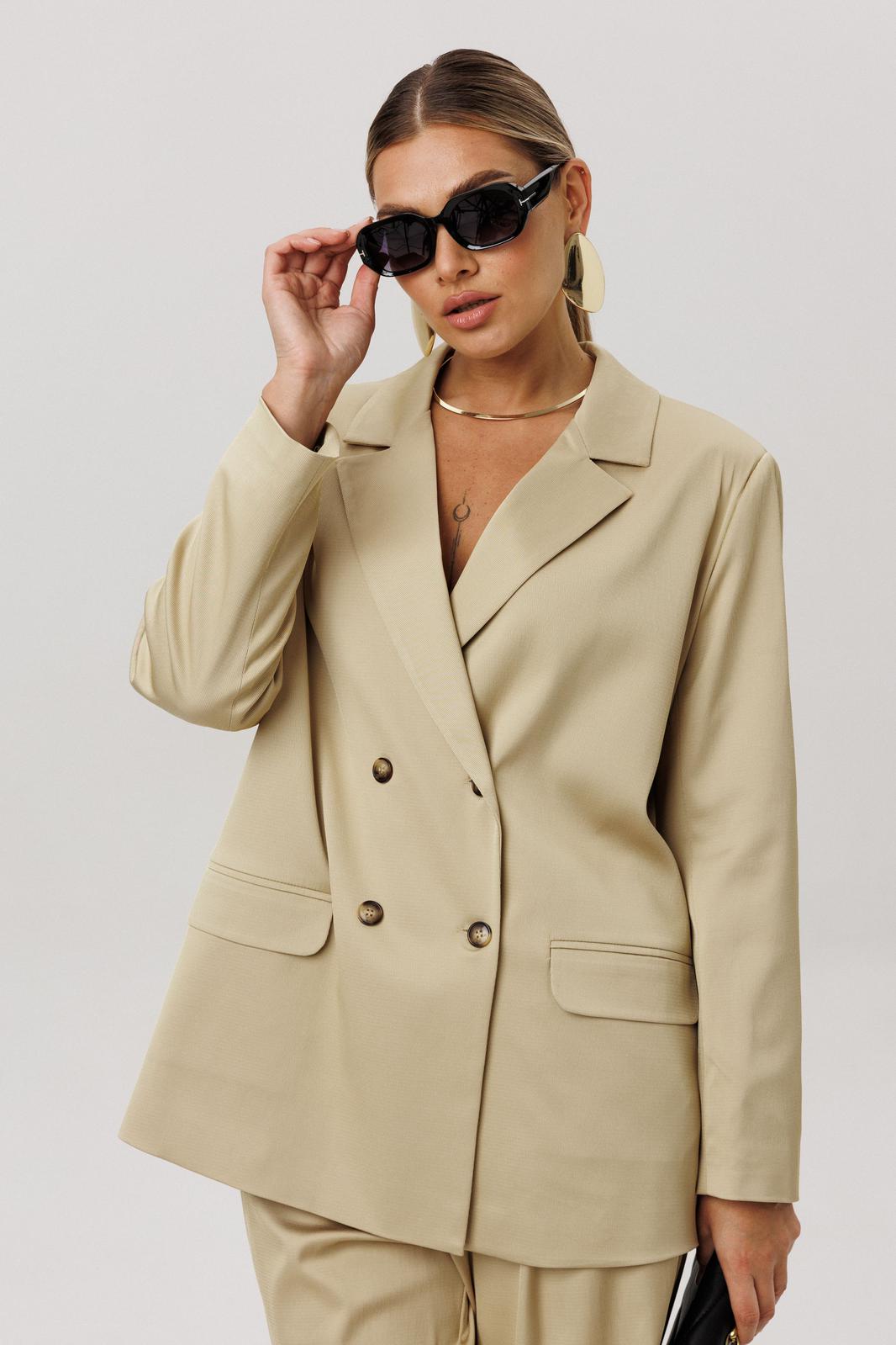 Двубортный жакет прямого силуэта с отложным воротником и лацканами актуален всегда: встреча с друзьями, поход на работу, деловая встреча или свидание.