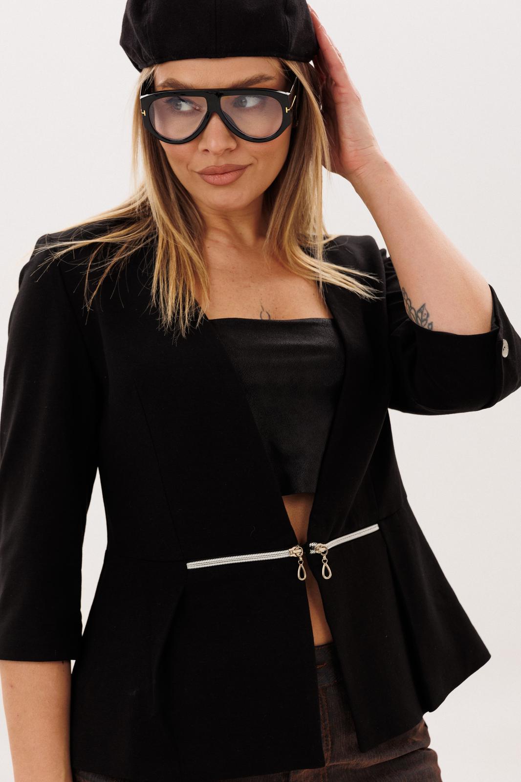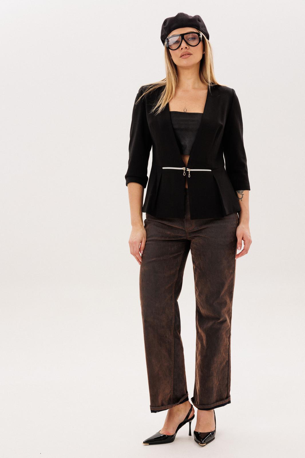 Жакет «молния», в котором сочетаются мягкая женственность и продуманная архитектура силуэта. Полуприлегающий крой деликатно подчеркивает фигуру, а отрезная линия талии с баской на складках создает выразительную, но ненавязчивую форму, добавляя образу легкости и утонченности. Декоративные молнии в талиевых швах становятся тонким акцентом, который привлекает внимание, не нарушая общей лаконичности. Аккуратные вытачки по переду и спинке формируют красивую посадку, а лаконичный вырез горловины мягко вытягивает силуэт и делает образ более изящным. Укороченный двухшовный рукав со шлицей в локтевом шве, добавляет жакету аккуратности и комфорта в движении.