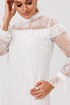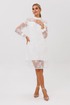 Это платье, сотканное из воздуха и тончайших нитей. Нежное кружевное полотно, подобно легкой дымке, обволакивает силуэт, заключая его в элегантные и строгие линии прямого кроя. Изысканность кроется в деталях: кокетки, украшающие лиф спереди и сзади, мягко ниспадают изящными волнами, подчеркивая линию плеч и даря образу трогательную, почти что хрупкую грацию.