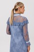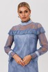 Каждый элемент продолжает повествование о романтике: втачные рукава, строгие и утонченные у манжет с изящной пуговицей, неожиданно раскрываются нежным кружевным веером-валоном у запястья. Высокая стойка воротника, обрамленная ажурной тесьмой, придает благородную четкость линиям шеи, а тайна скрыта за спиной — где ряд пуговиц, словно жемчужины, хранит ключ к этому прекрасному наряду.