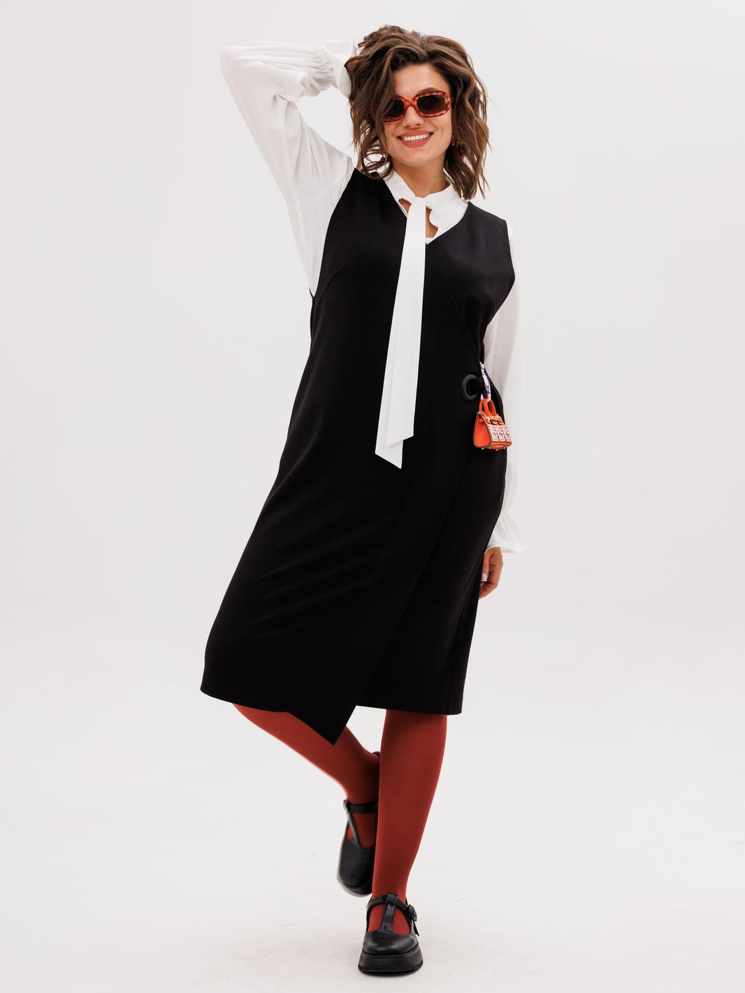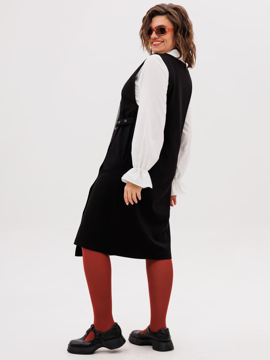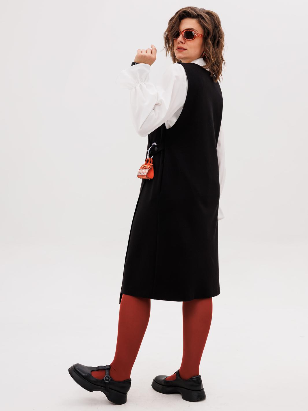Этот сарафан, выдержанный в строгом прямом силуэте, становится идеальной основой для современного гардероба. Его лаконичную геометрию мягко нарушает игра асимметрии — динамичный, неровный край низа плавно скользит по фигуре, создавая ощущение движения и художественной небрежности. Глубокий V-образный вырез горловины не только зрительно вытягивает шею, но и привносит ноту женственности и открытости, служа идеальным фоном для любимой блузки или тонкого джемпера.