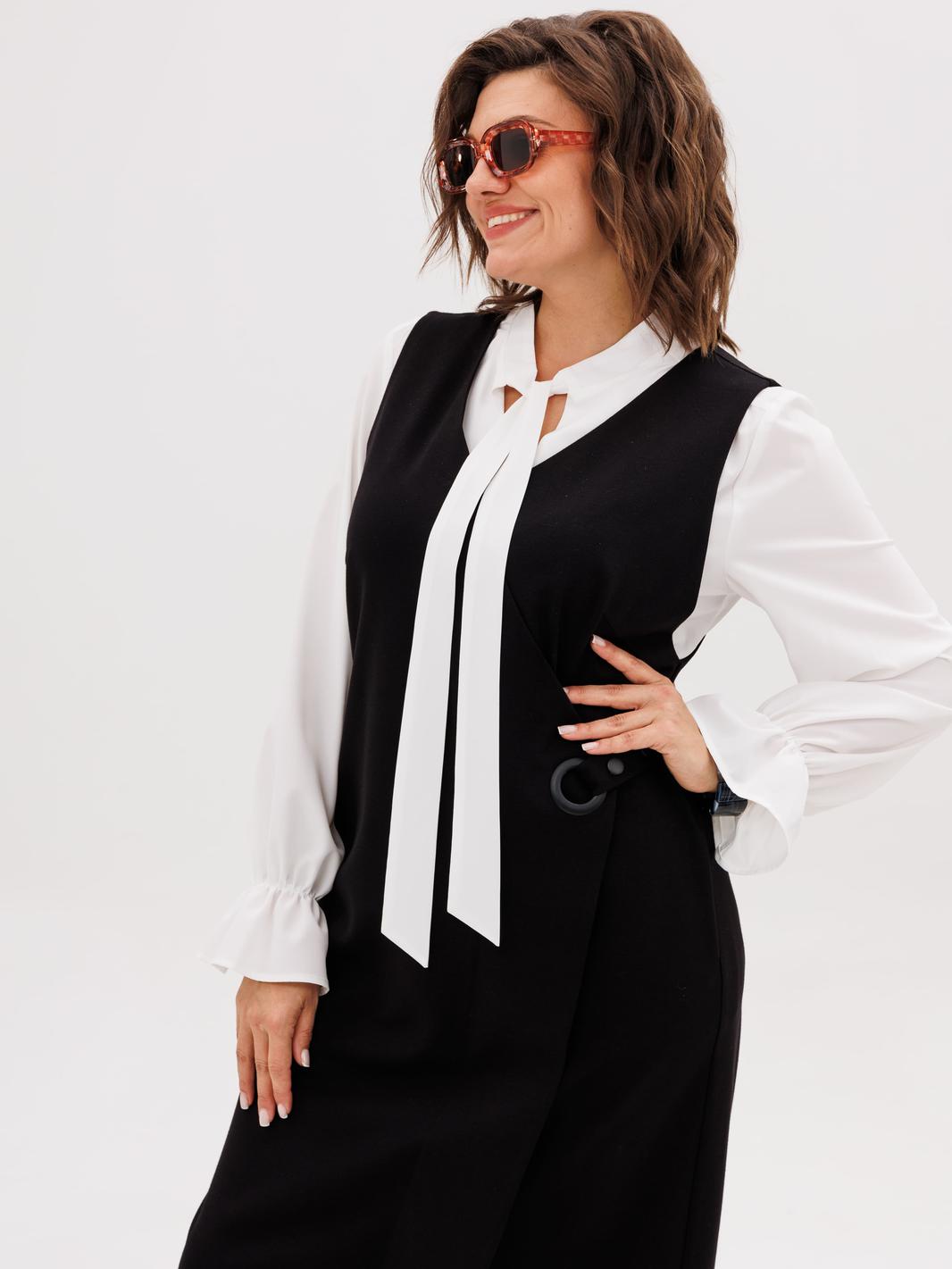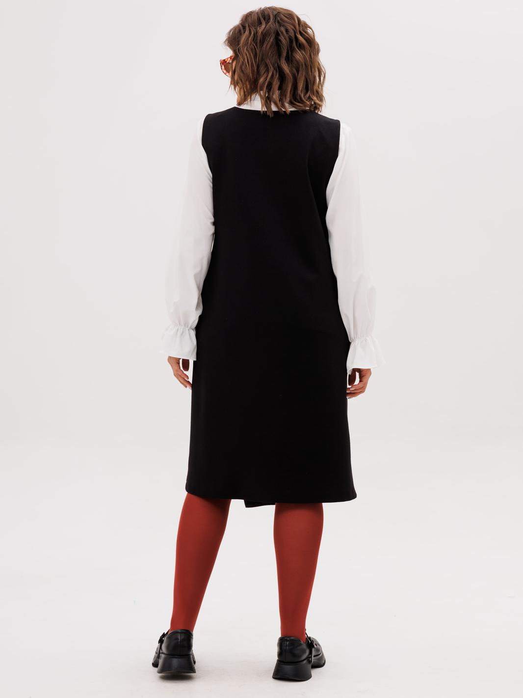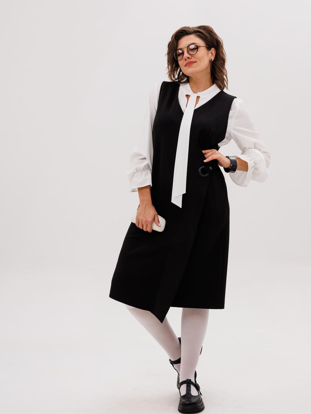 Этот сарафан, выдержанный в строгом прямом силуэте, становится идеальной основой для современного гардероба. Его лаконичную геометрию мягко нарушает игра асимметрии — динамичный, неровный край низа плавно скользит по фигуре, создавая ощущение движения и художественной небрежности. Глубокий V-образный вырез горловины не только зрительно вытягивает шею, но и привносит ноту женственности и открытости, служа идеальным фоном для любимой блузки или тонкого джемпера.