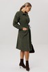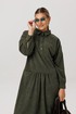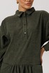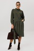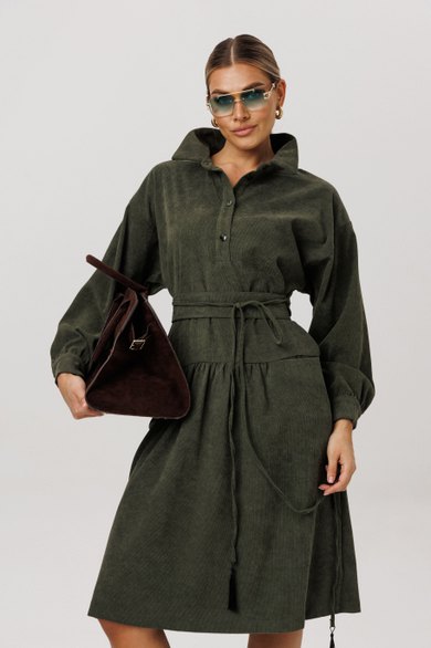 Длинный рукав с манжетой, спущенное плечо и волан со сборкой придают платью легкость и воздушность. Притачная планка на поясе выгодно подчеркивает талию, а пояс с кисточками привлекает внимание. Не оставит без внимания отложной воротник на стойке и застежка на пуговицы, подчеркивающие линии декольте.