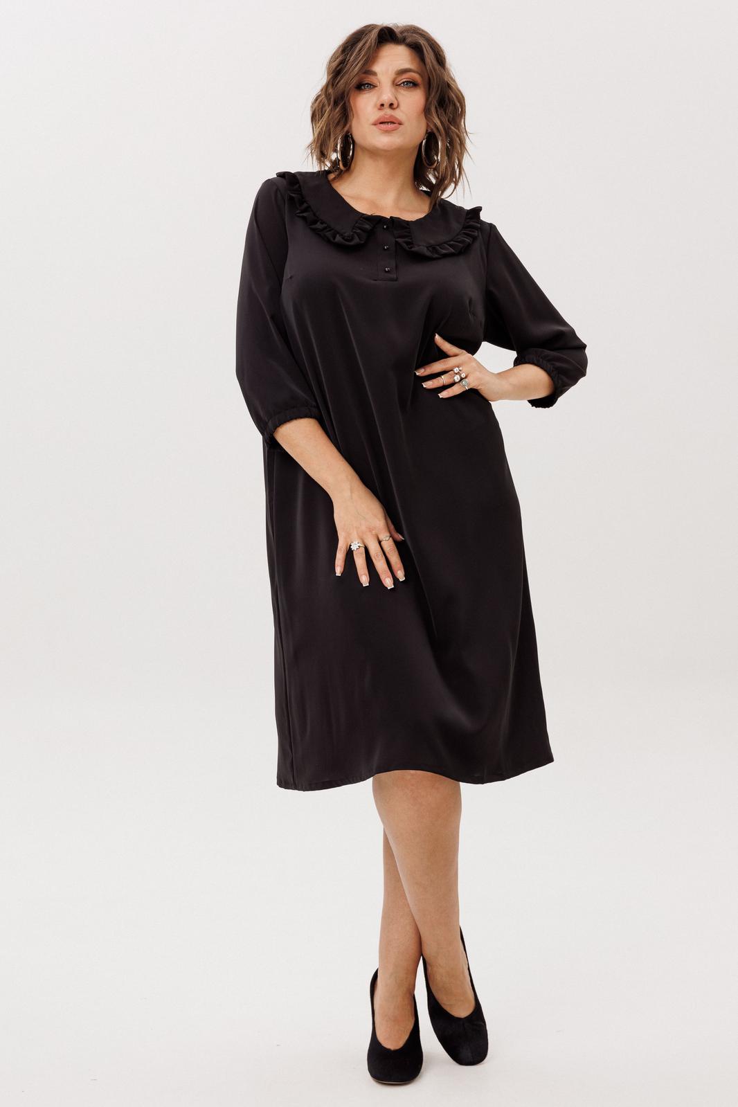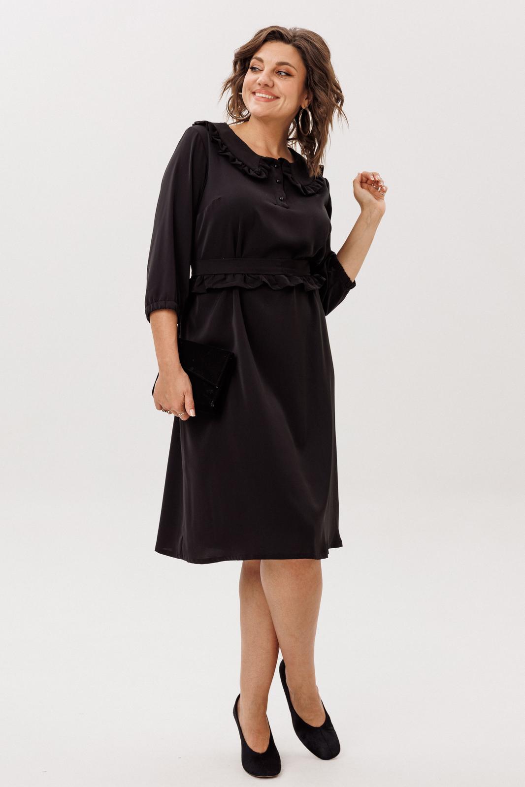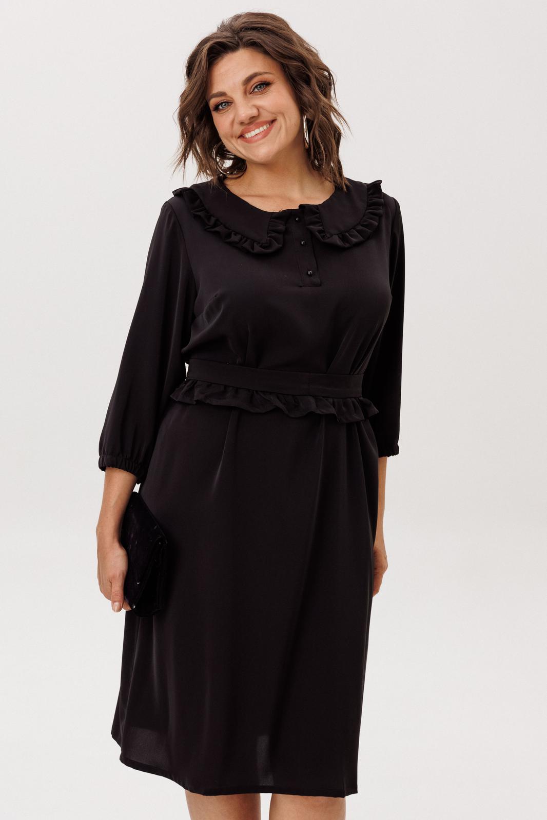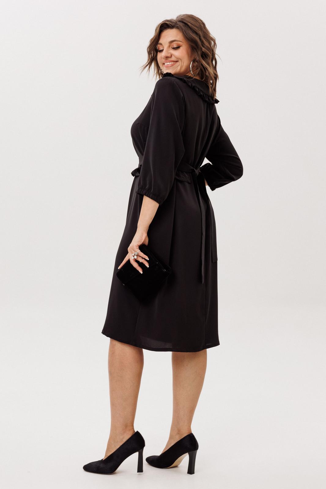 Круглый вырез горловины обработан отложным воротником с рюшем, придающим платью шарм и изысканность.