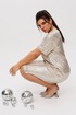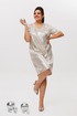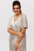 V-образный вырез и мягкий рукав создают изящный силуэт, ведущий к идеальной длине, где скромность встречается с элегантностью. Платье золото на нежной подкладке, не просто украшает - оно ощущается как вторая кожа, даруя забытую свободу движения. В нём чувствуется только лёгкость и уверенность.