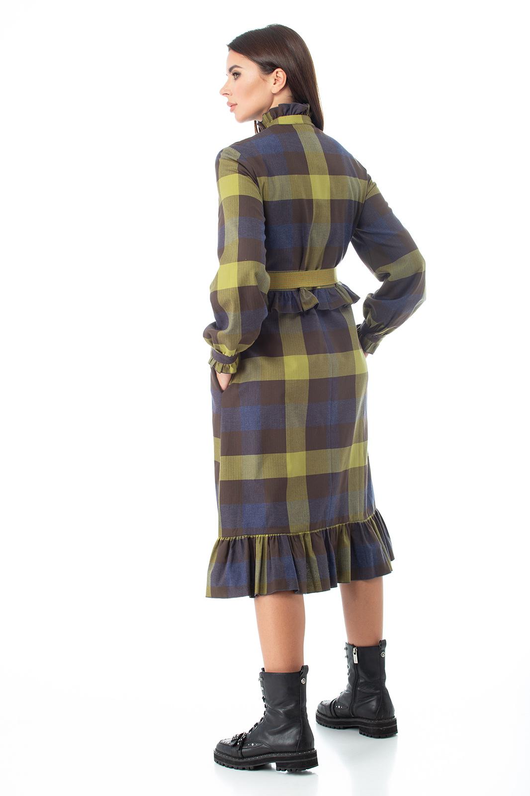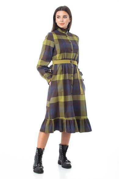 Наше платье в клетку с элементами романтизма: мелкие складочки на полочке, рюша по стойке горловины и по низу манжеты втачного рукава; волан по низу платья и по спинке на уровне талии. Слегка расширенный силуэт, длина миди.
