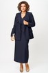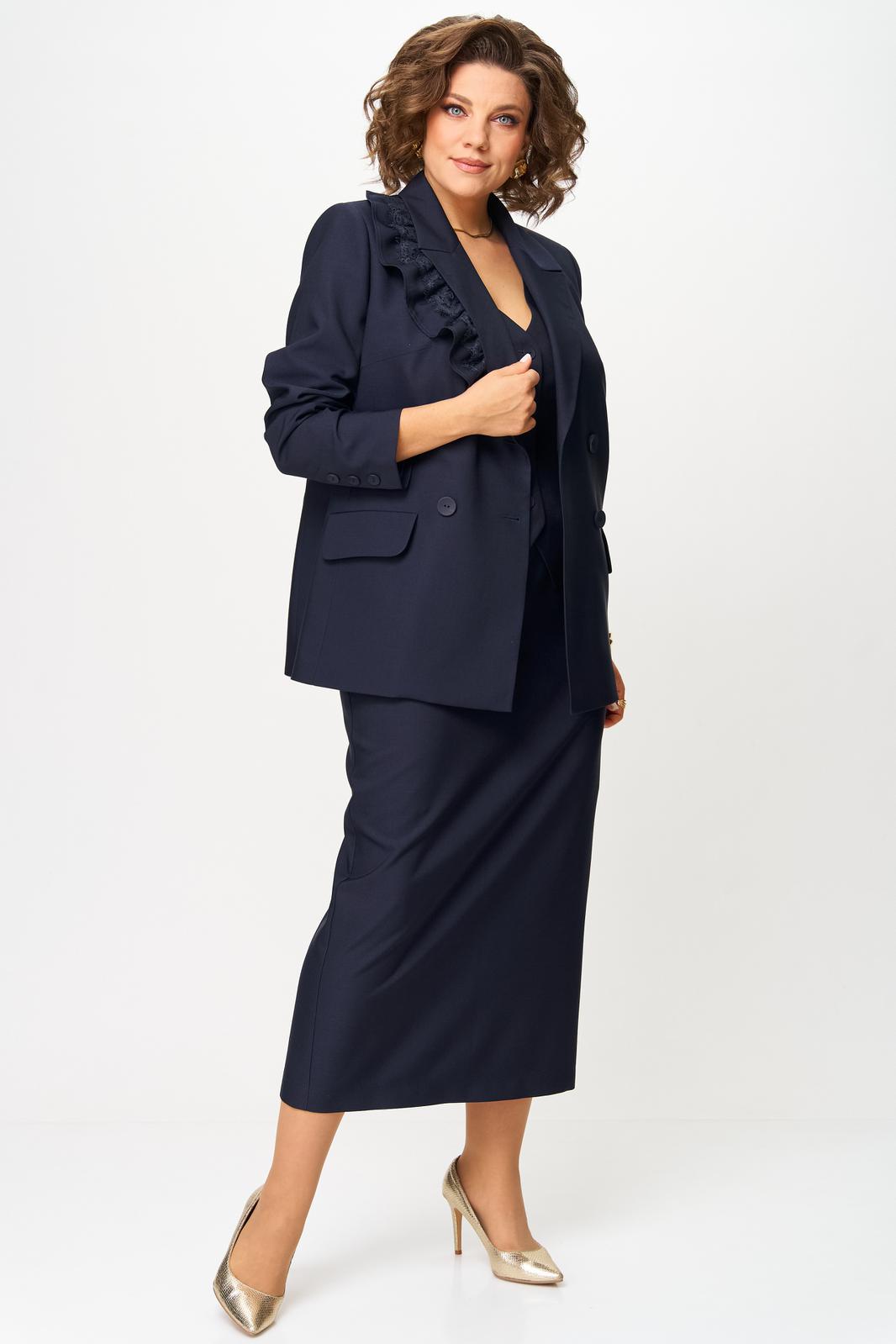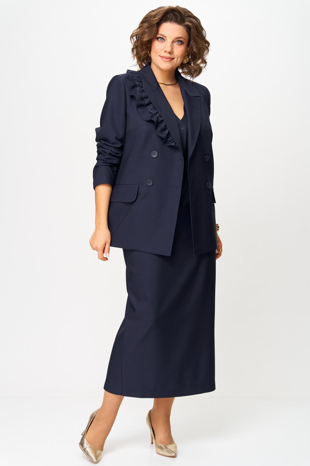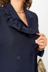 Жакет прямого силуэта, на подкладке, с плечевыми накладками. По переду — центральная двубортная застежка на петли и пуговицы, нагрудные вытачки и функциональные прорезные карманы с клапаном. Полочку жакета украшает съемная (на пуговицах) декоративная рюша с кружевом. Спинка со средним швом. Рукав втачной длинный двухшовный, с имитацией шлицы, декорированной пуговицами.