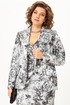 Однобортный жакет полуприталенного силуэта, на подкладке, с плечевыми накладками. Воротник пиджачного типа с отложными лацканами. По переду центральная застежка на петли и пуговицы и прорезные карманы с клапаном, талиевые вытачки и рельефы. Низ бортов закругленной формы. Спинка со средним швом и рельефами. Рукав втачной двухшовный длинный.