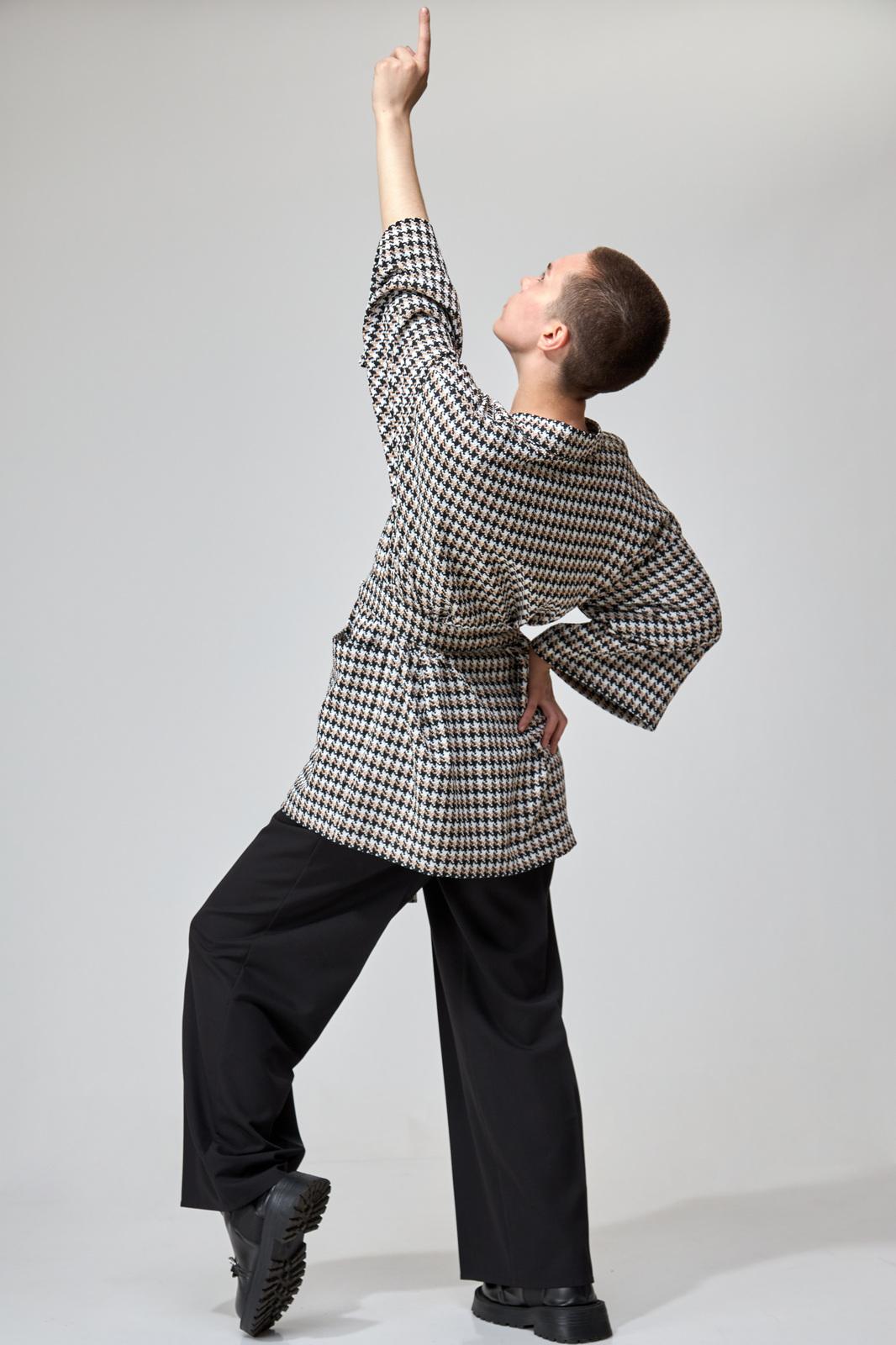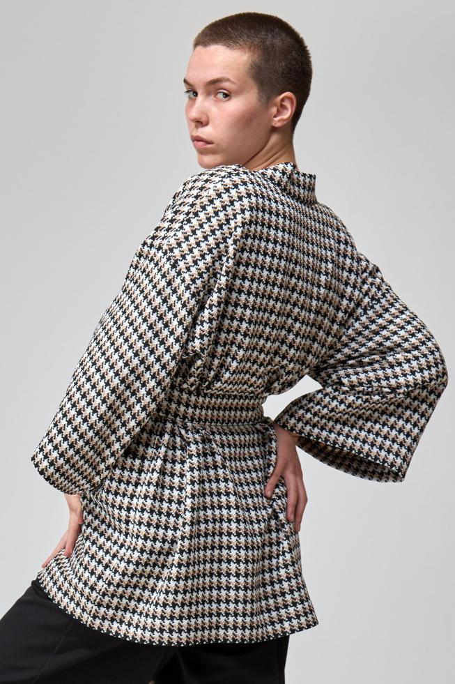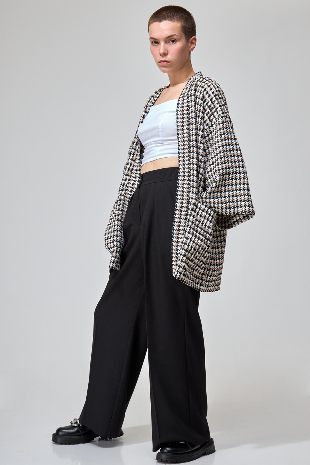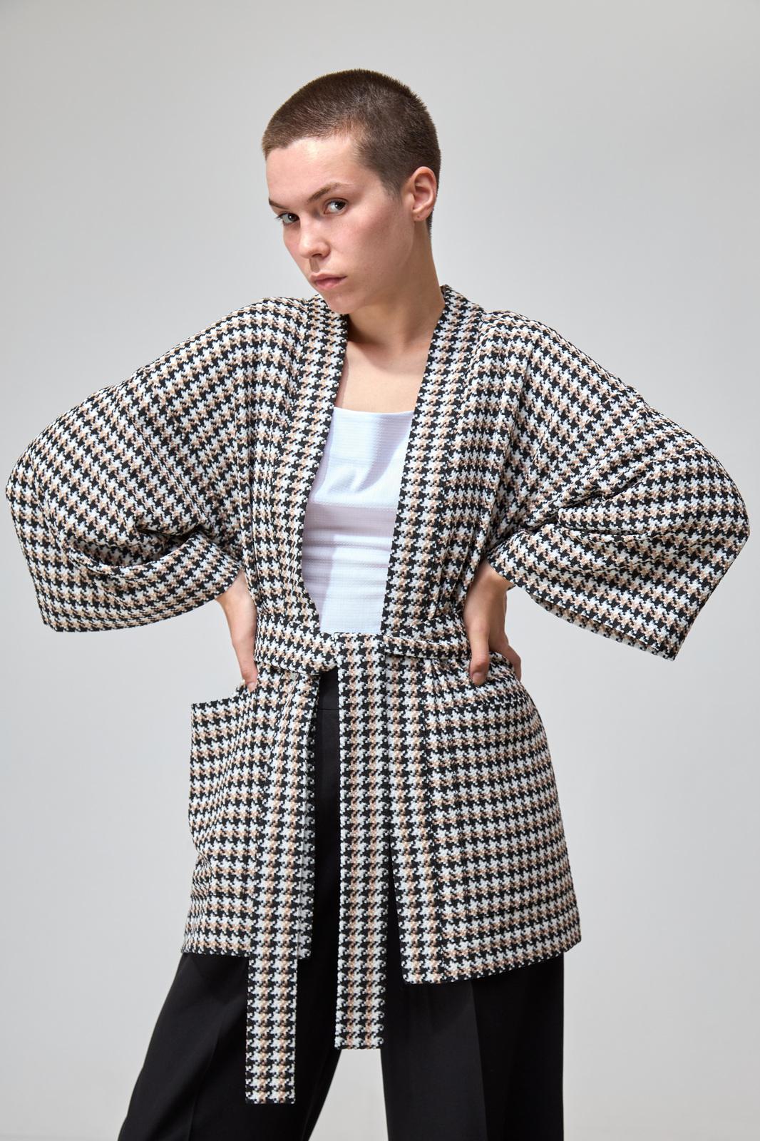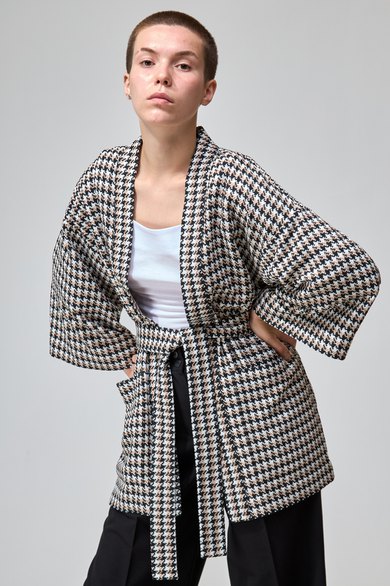 Свободный мягкий жакет-кимоно без подкладки с принтом гусиная лапка отлично впишется в ваш деловой и повседневный гардероб. Лёгкий и удобный жакет не будет сковывать движения и придётся вам по вкусу. Идеально подойдет к любым брюкам, юбкам и джинсам.