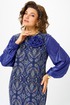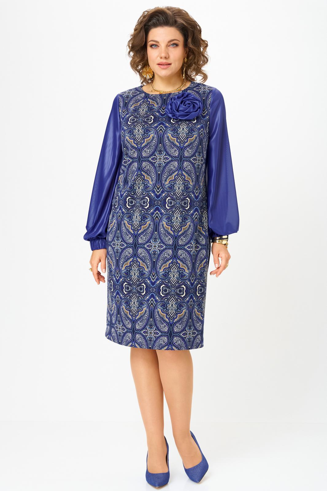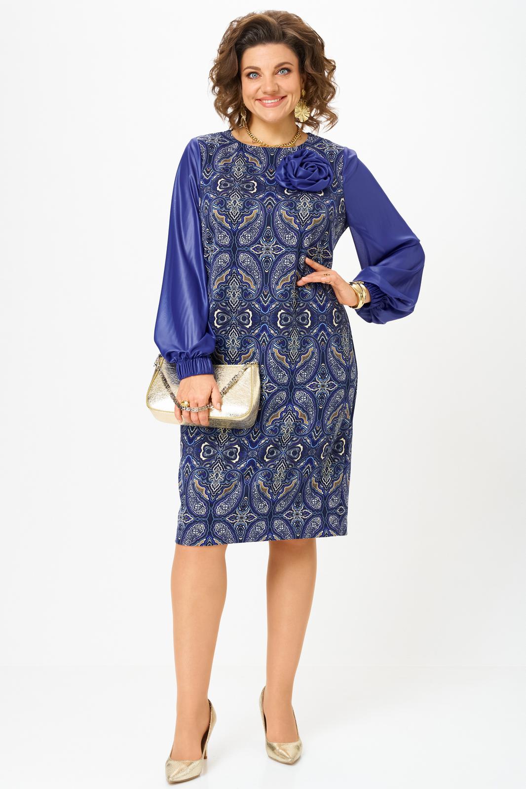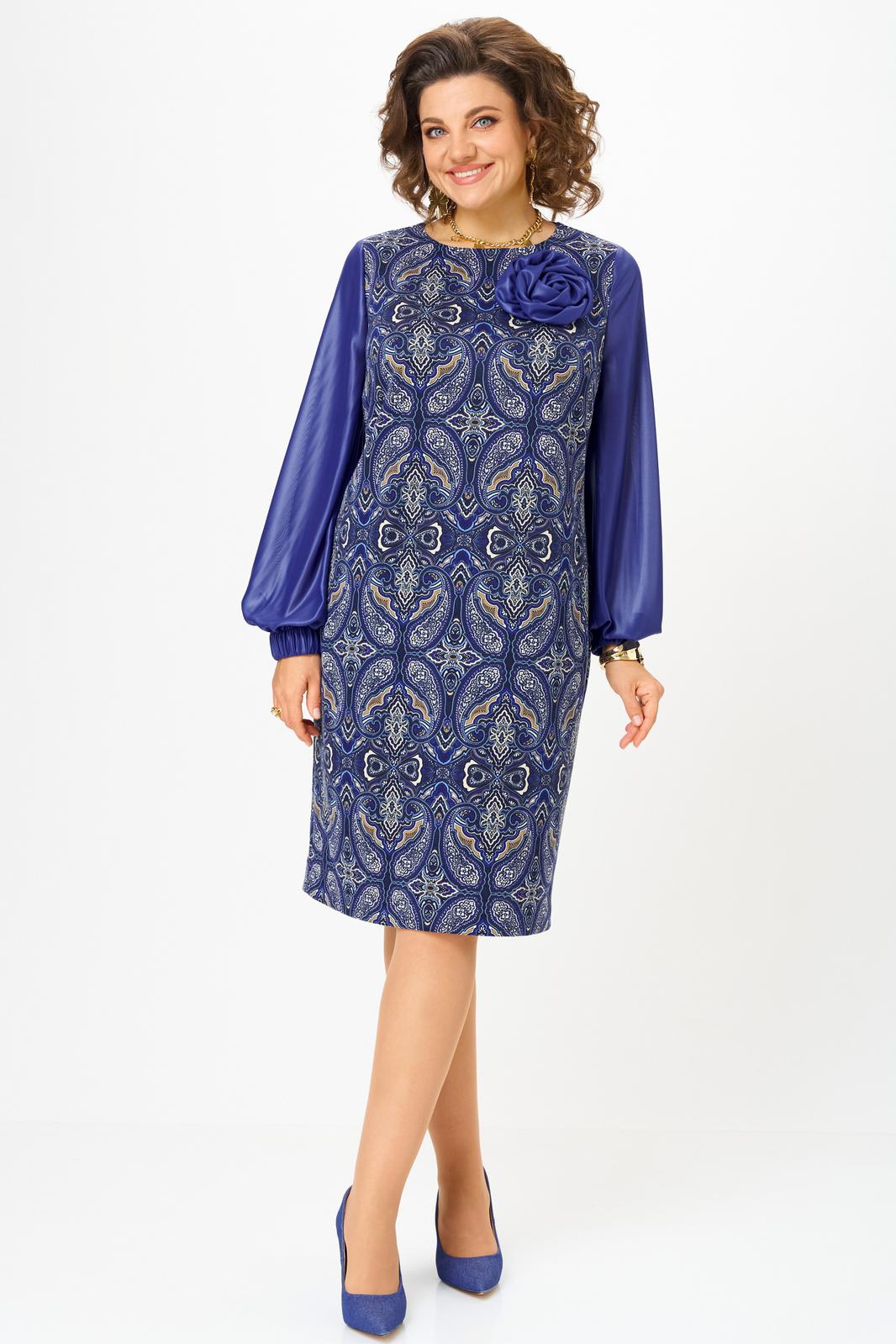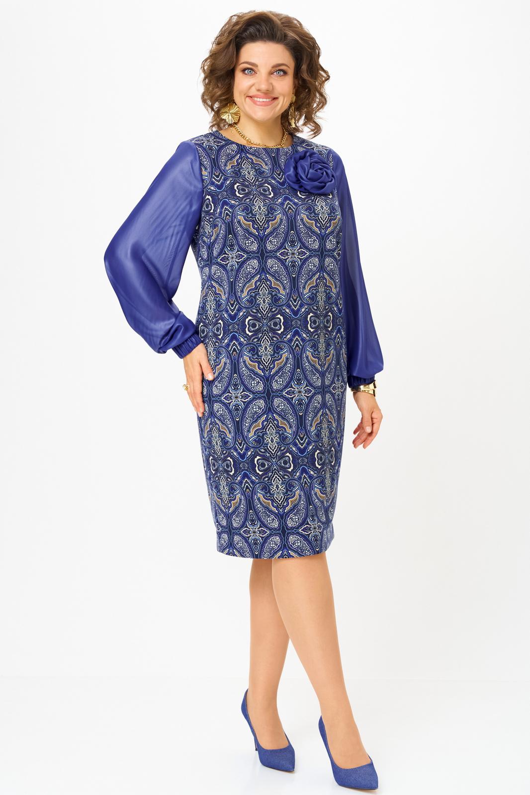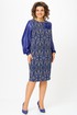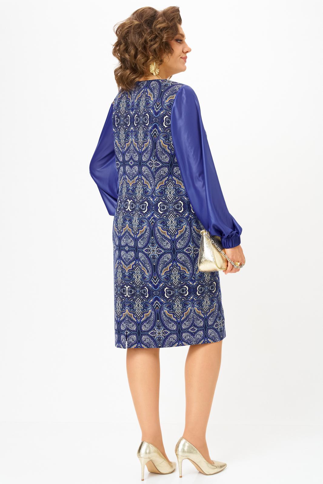 Платье полуприлегающего силуэта с округлой горловиной. Перед с нагрудными вытачками. Спинка с талиевыми вытачками, застежкой молнией и разрезом в среднем шве. Рукав втачной прямой длинный, на резинке по низу.