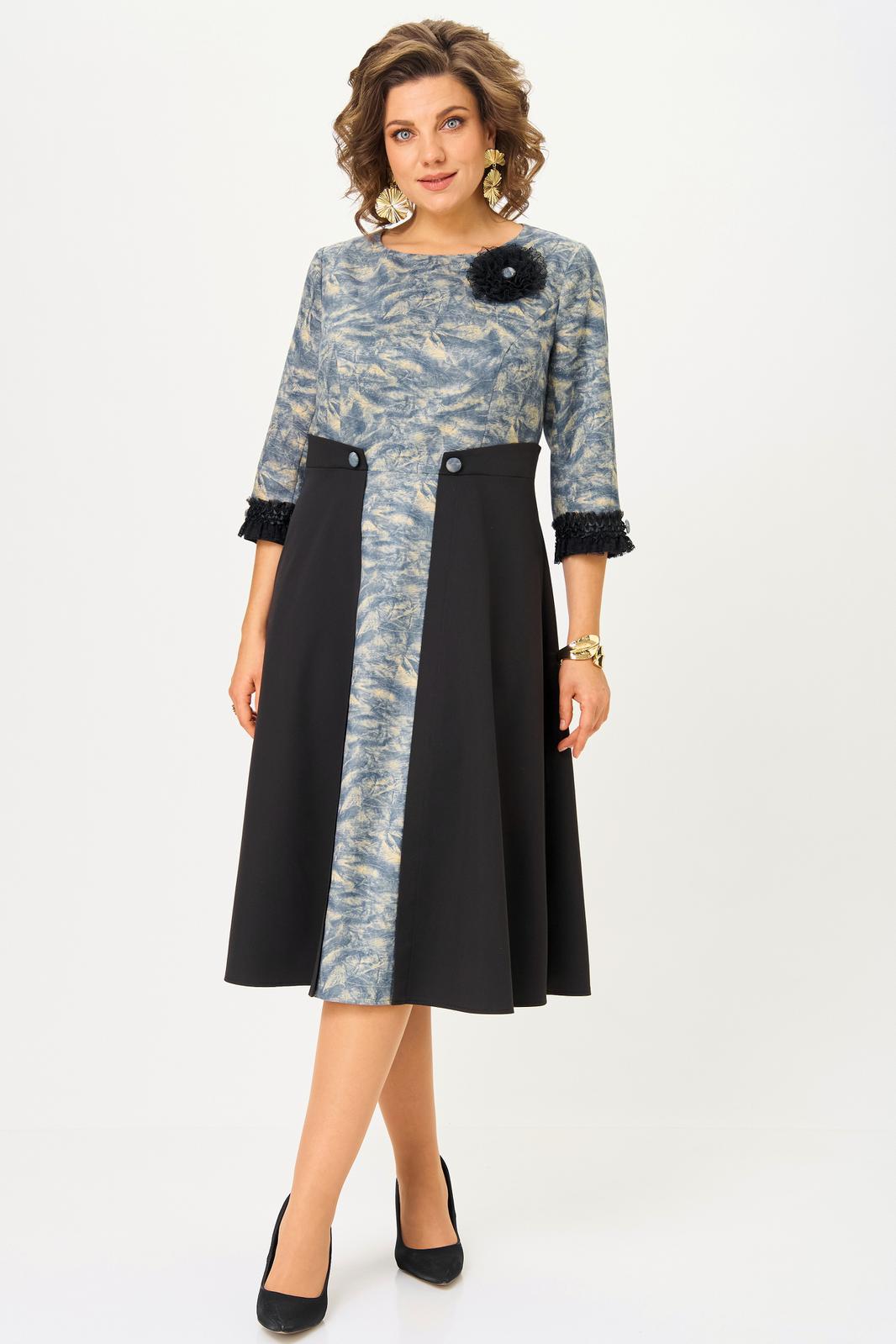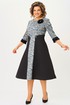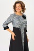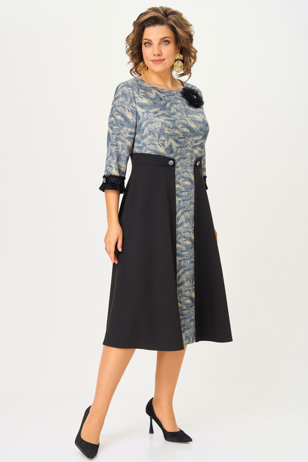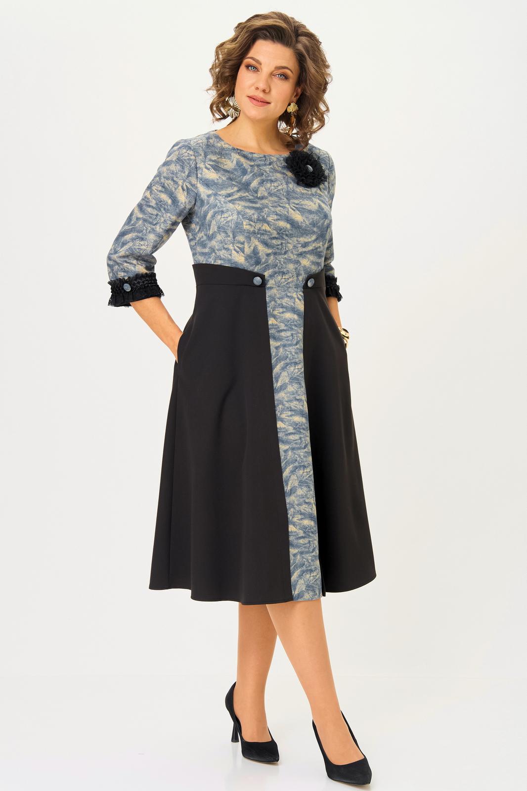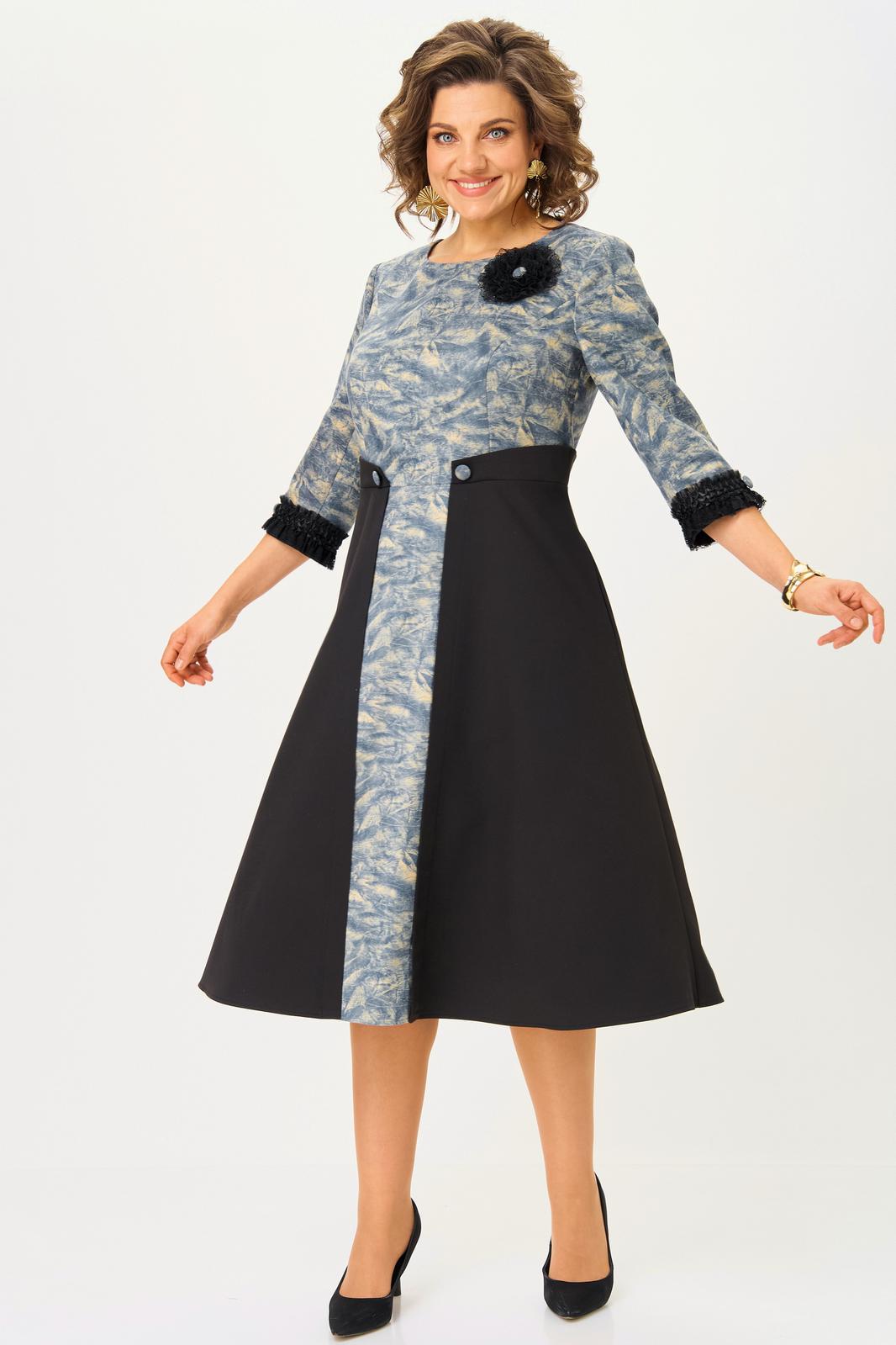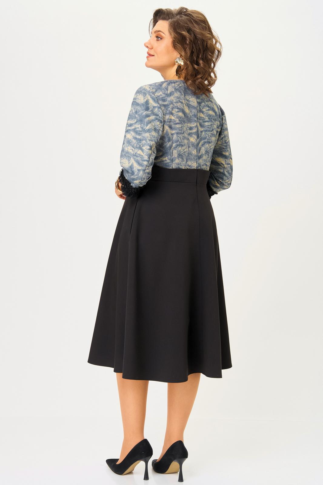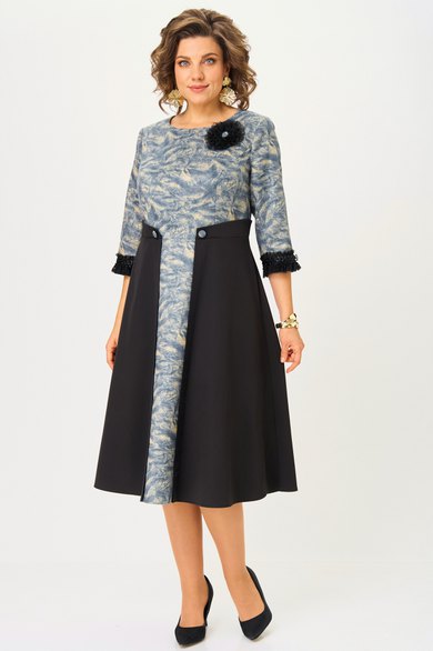 Платье полуприлегающего силуэта, отрезное по линии талии. Горловина округлой формы, обработана обтачкой. По переду лифа — рельефные швы. По спинке лифа талиевые вытачки и средний шов, в котором обработана потайная молния. Юбка платья клеш, с вертикальной вставкой по переду и средним швом по спинке. Подрез по талии закрывается декоративным поясом с пуговицами. Добавят комфорта при носке функциональные карманы в боковых швах. Рукав втачной прямой, длиной ¾, по низу — манжет, декорированный тесьмой и пуговицей. В комплекте к платью прилагается съемное украшение из тесьмы.