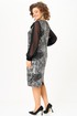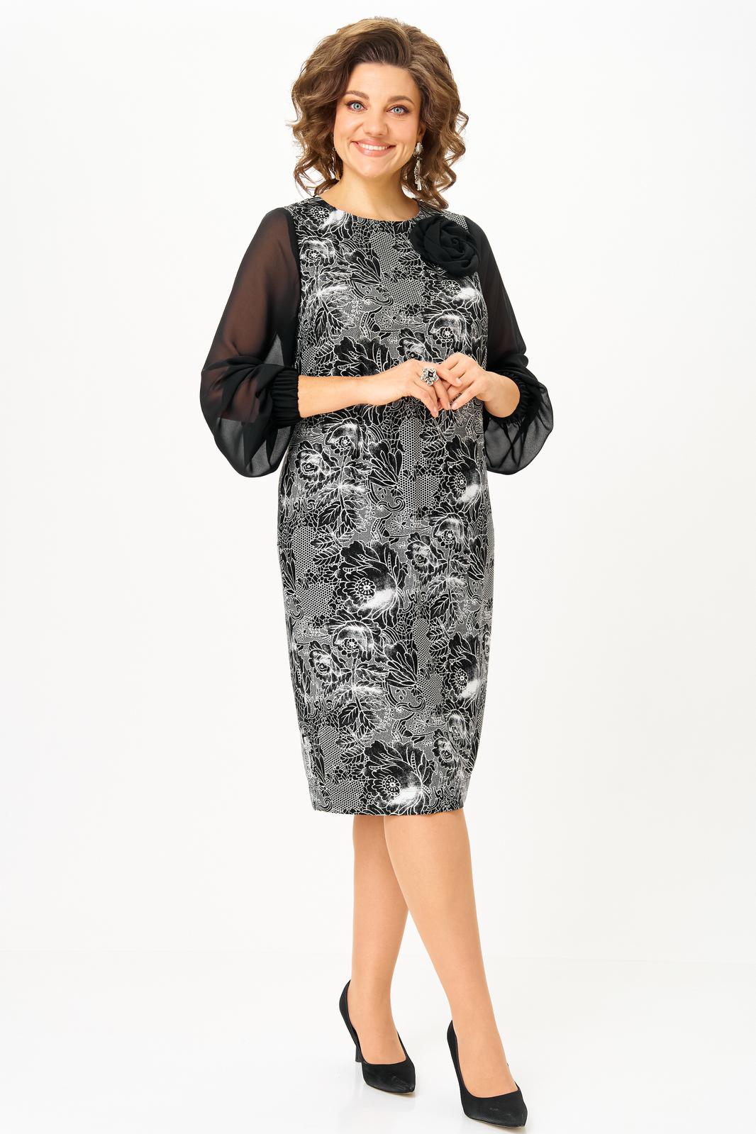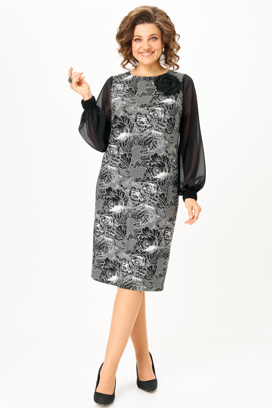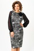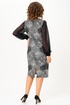 Платье полуприлегающего силуэта с округлой горловиной. Перед с нагрудными вытачками. Спинка с талиевыми вытачками, застежкой молнией и разрезом в среднем шве. Рукав втачной прямой длинный, на резинке по низу.
