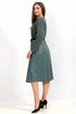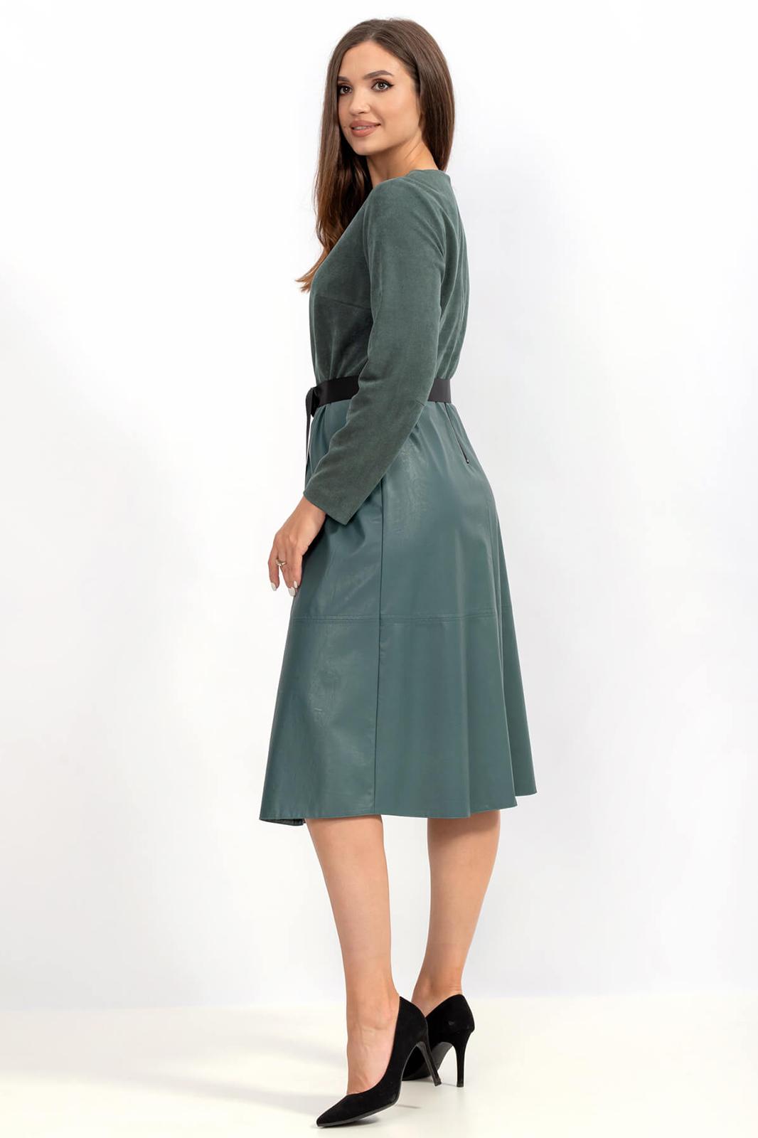 Платье женское отрезное по линии талии, слегка расклешённое, комбинированное из двух различных по фактуре тканей. Лиф платья и рукава выполнены из ткани микровельвет, юбка из ткани эко кожа. По переду нагрудные вытачки и фигурный накладной карман. По спинке талевые вытачки и застёжка молния в центральном шве спинки. Юбка четырёхклинка . Горловина круглая. Рукава двух шовные втачные. Платье без подкладки. Дополнением служит пояс. Украшают платье отделочные строчки.