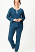 Костюм женский из вискозы для сна и отдыха. Состоящий из блузки и брюк. Блузка прямого силуэта длиной до середины бедра. Перед с короткой планкой, застегивающейся на три петли и пуговицы. Рукава втачные длинные одношовные, заканчивающиеся манжетой с кантом. Горловина обработана бейкой. Брюки прямые, длинные. Пояс на резинке.