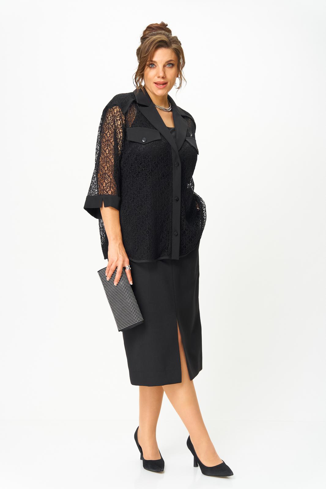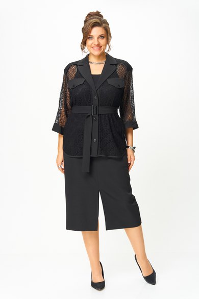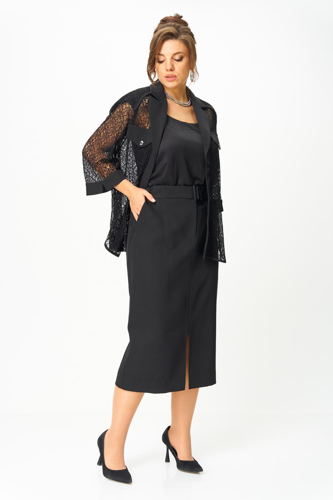 Костюм женский из текстильного полотна состоит из жакета , юбки и топа. Жакет из кружева свободного кроя с центральной застежкой на петли пуговицы . Спинка с горизонтальной кокеткой и складкой по центру . Рукав одношовный втачной с манжетой . Юбка заужена к низу с притачным поясом со шлевками , застегивающимися на пуговицу и молнию . По переду боковые карманы . Топ из вискозного полотна на бретелях .