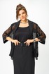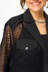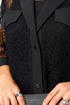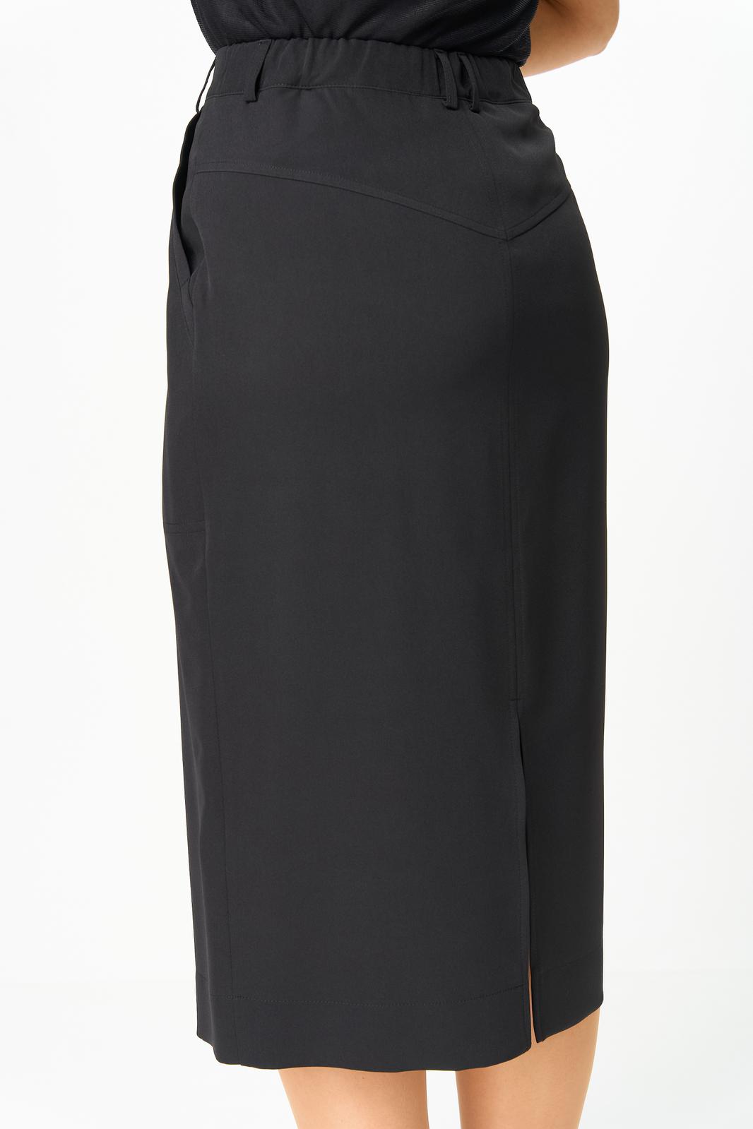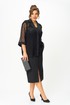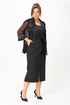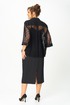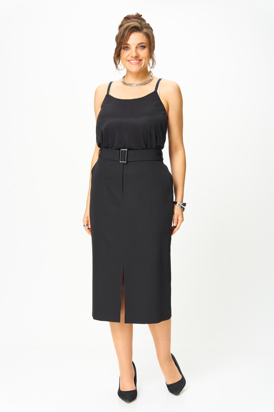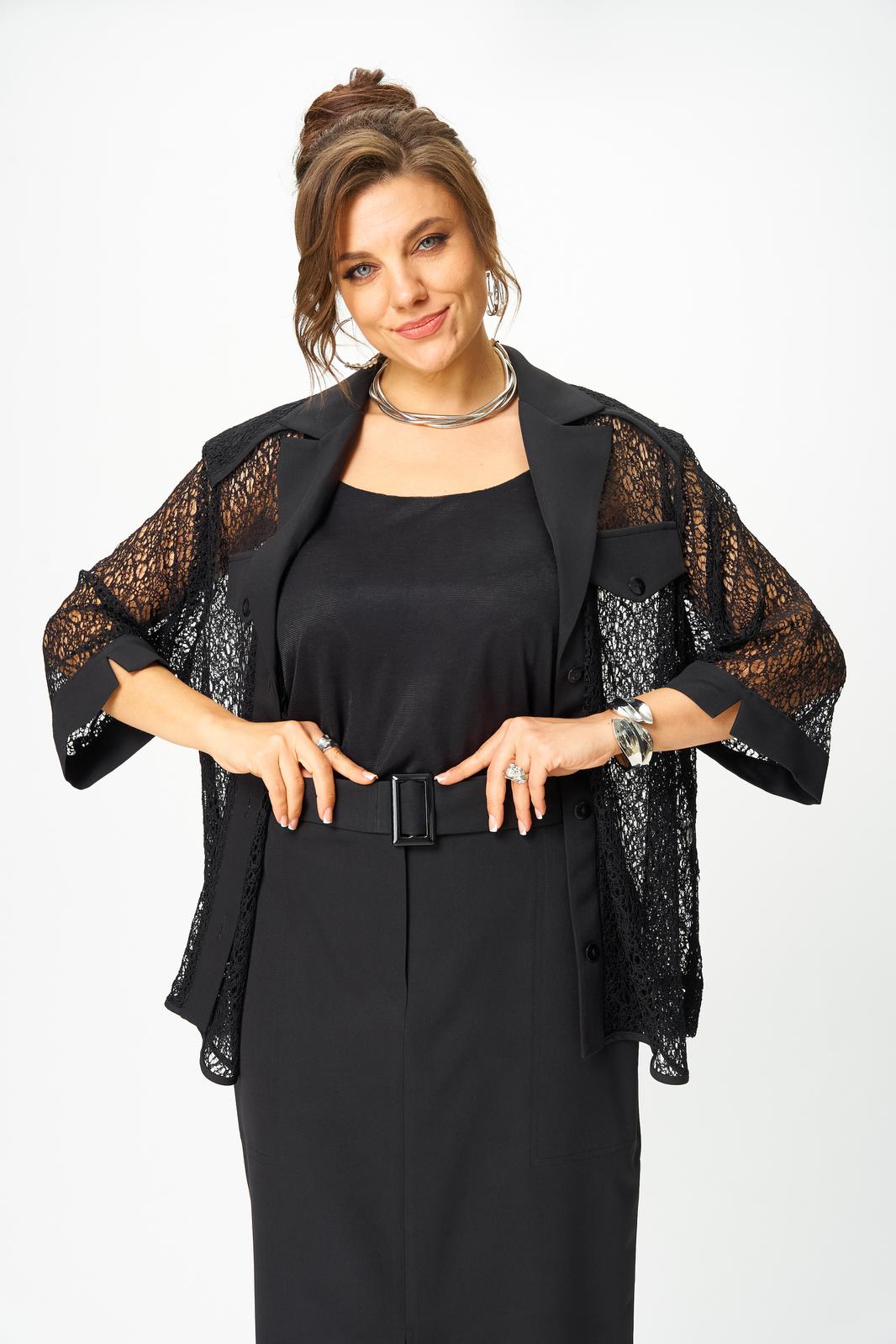 Костюм женский из текстильного полотна состоит из жакета , юбки и топа. Жакет из кружева свободного кроя с центральной застежкой на петли пуговицы . Спинка с горизонтальной кокеткой и складкой по центру . Рукав одношовный втачной с манжетой . Юбка заужена к низу с притачным поясом со шлевками , застегивающимися на пуговицу и молнию . По переду боковые карманы . Топ из вискозного полотна на бретелях .