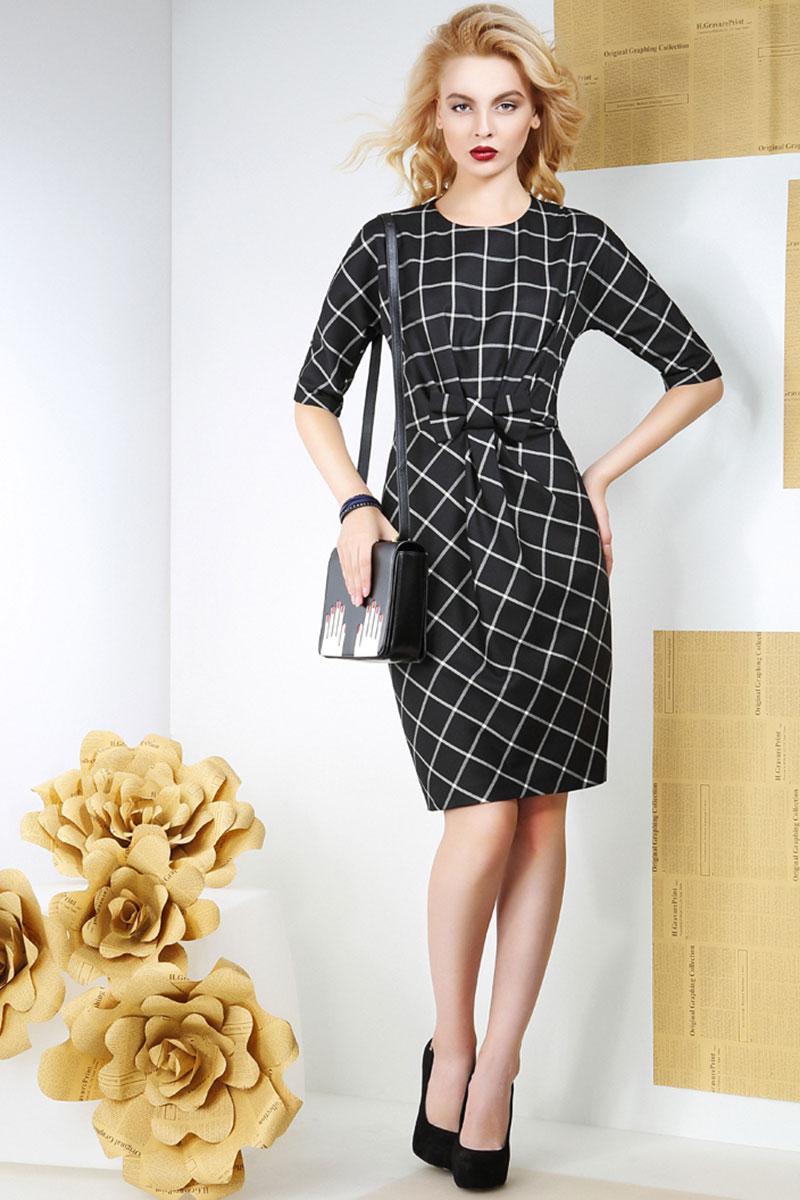 Платье элегантного покроя из текстильной ткани. Рукав цельнокроеный. Юбка ассиметричная. Потайная молния по спинке 50 см. Длина изделия - 98 см. Длина рукава (реглан) - 45 см.