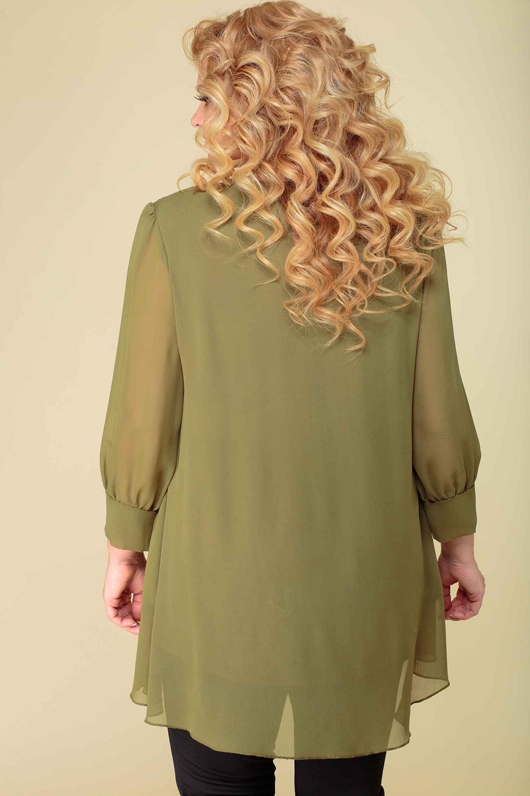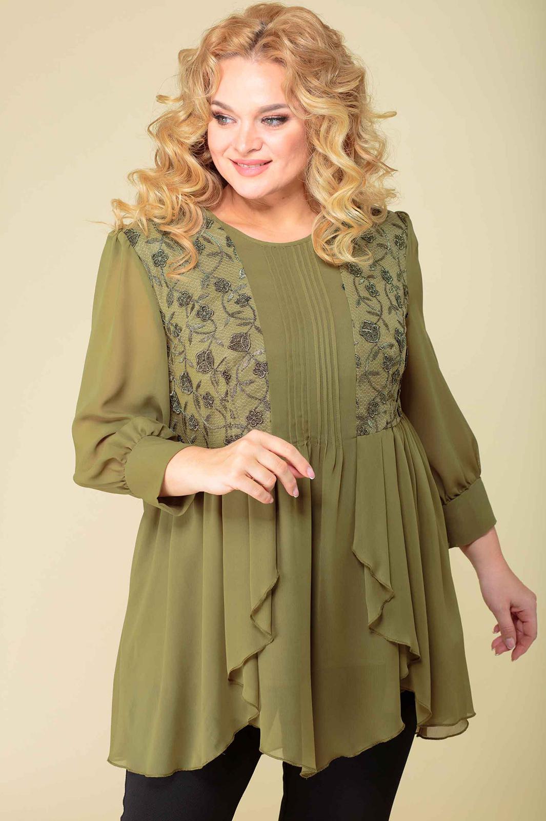 Туника женская нарядная, полуприлегающего силуэта, из шифона и гипюра. Горловина круглая, рукав 3/4 на манжете. Перед с подрезами и защипами по лифу. Из-под подрезов фигурная драпировка. Ни переда двухслойный. Спинка свободная с каплевидным разрезом на петлю и пуговицу. Изделие на подкладке.