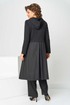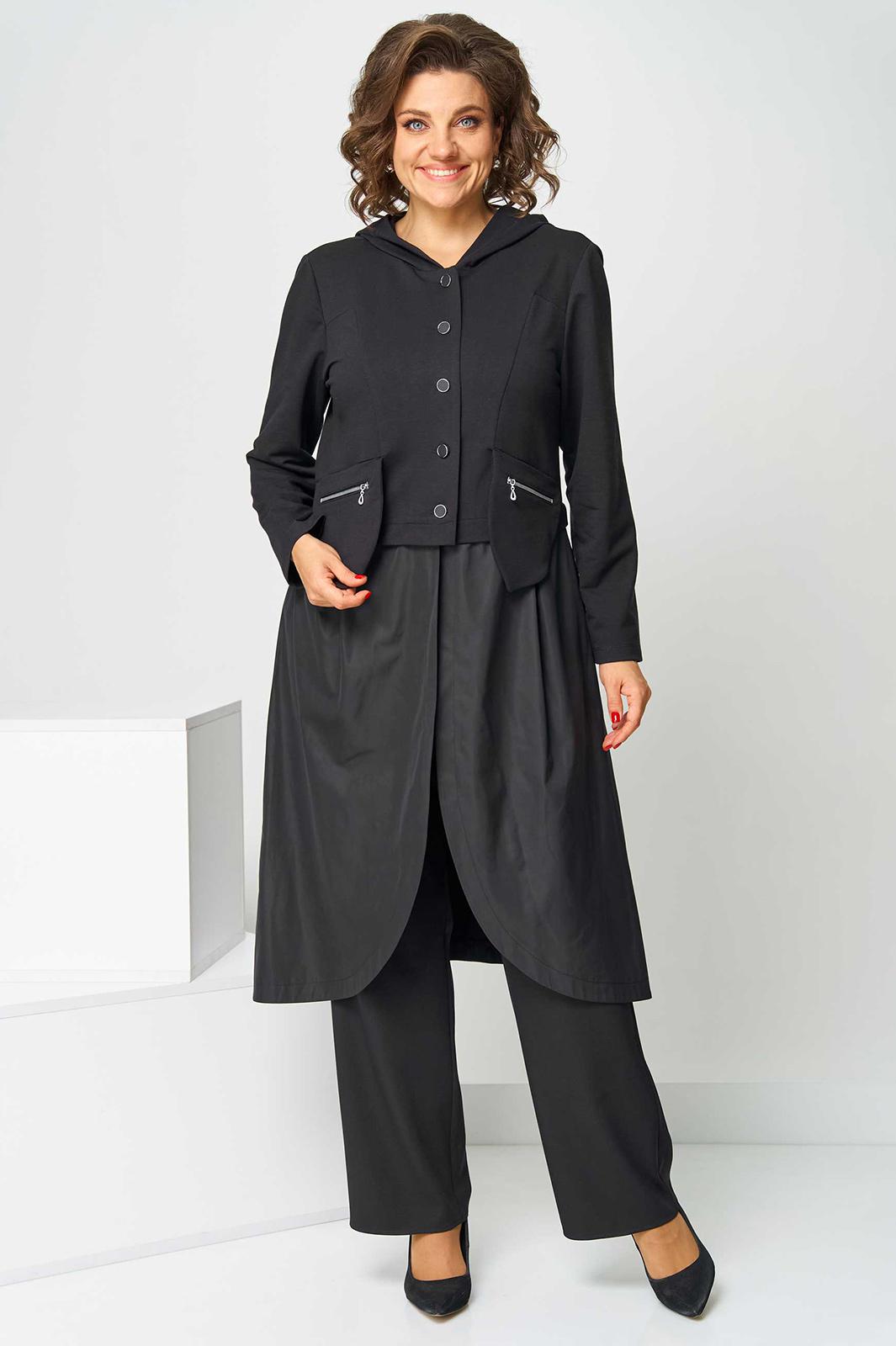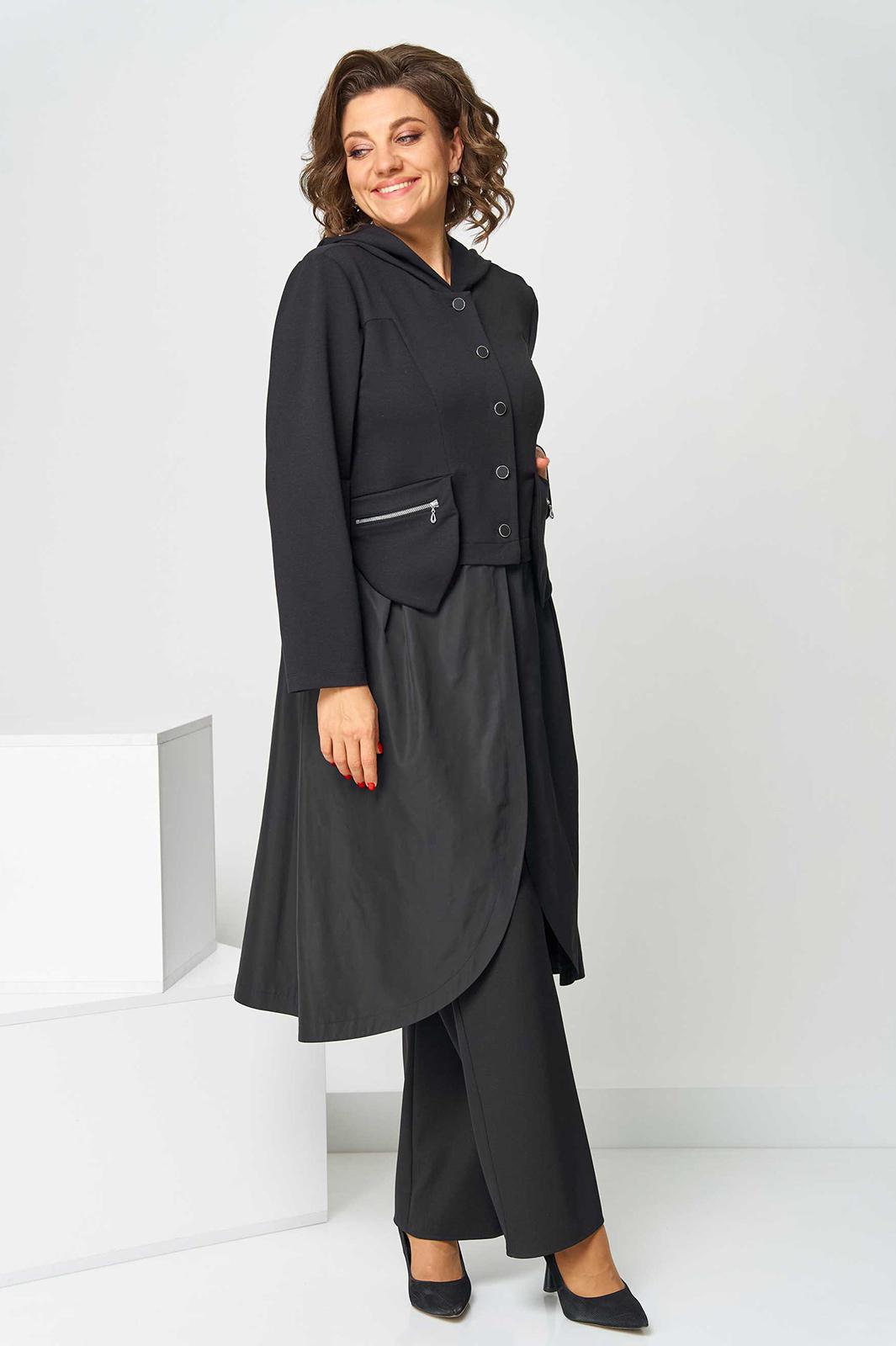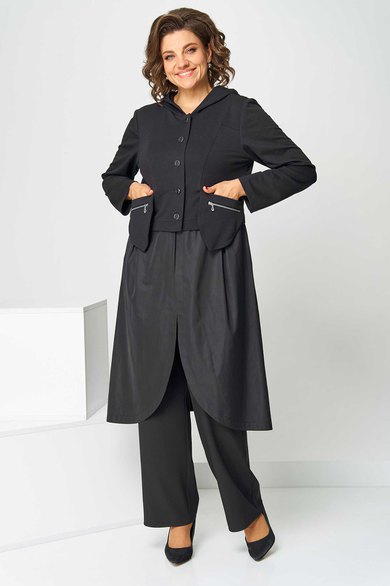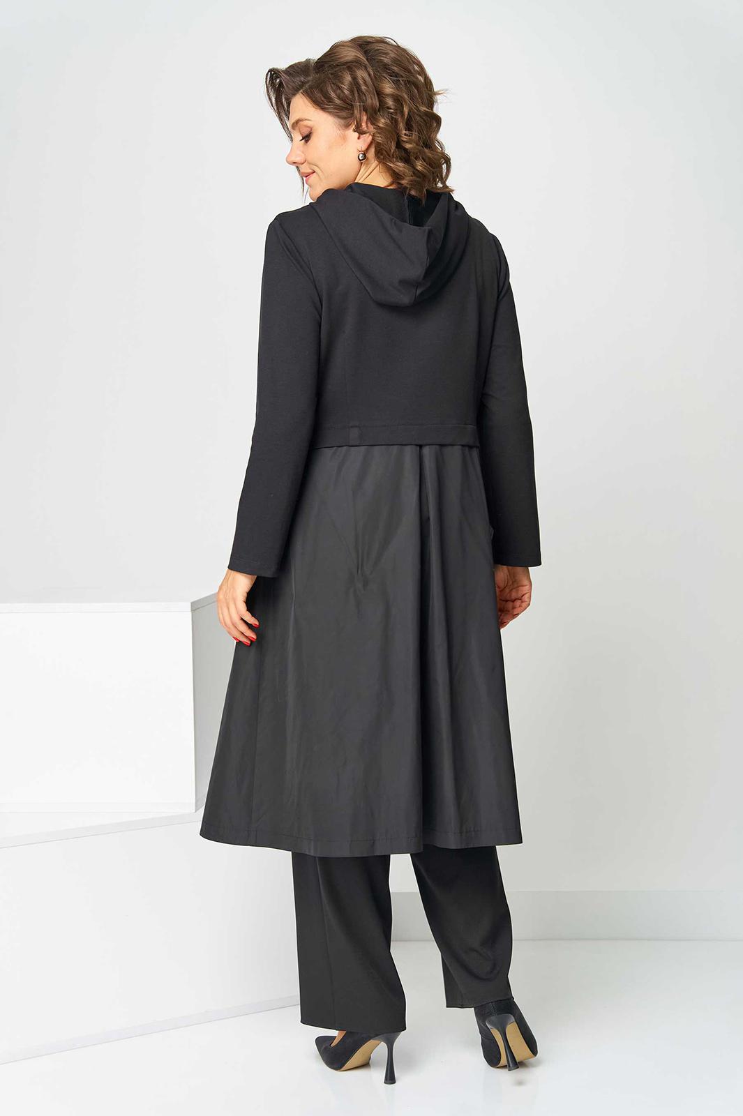 Кардиган комбинированный из трикотажа и плащевой ткани полуприлегающего силуэта, с центральной застежкой на петли-пуговицы. Вверху капюшон. Спинка с талиевыми вытачками. Перед с карманами и тесьмой-молнией, входящими в подрез бочка. Рукав вточной одношовный.