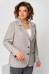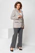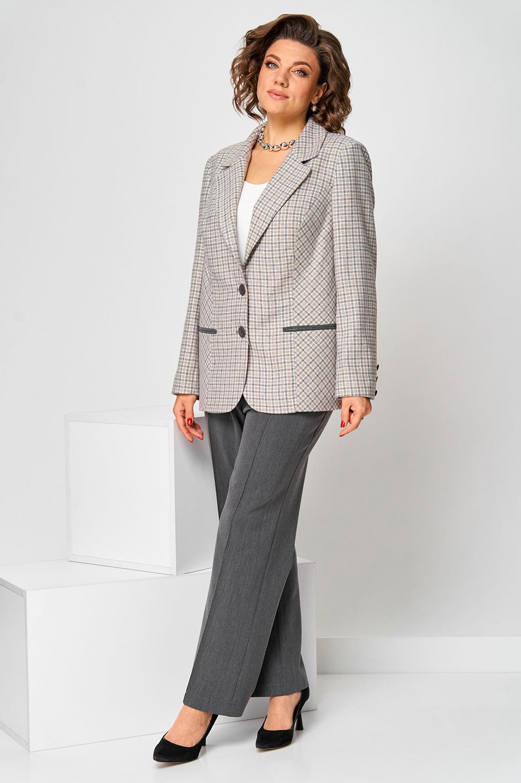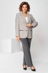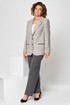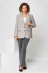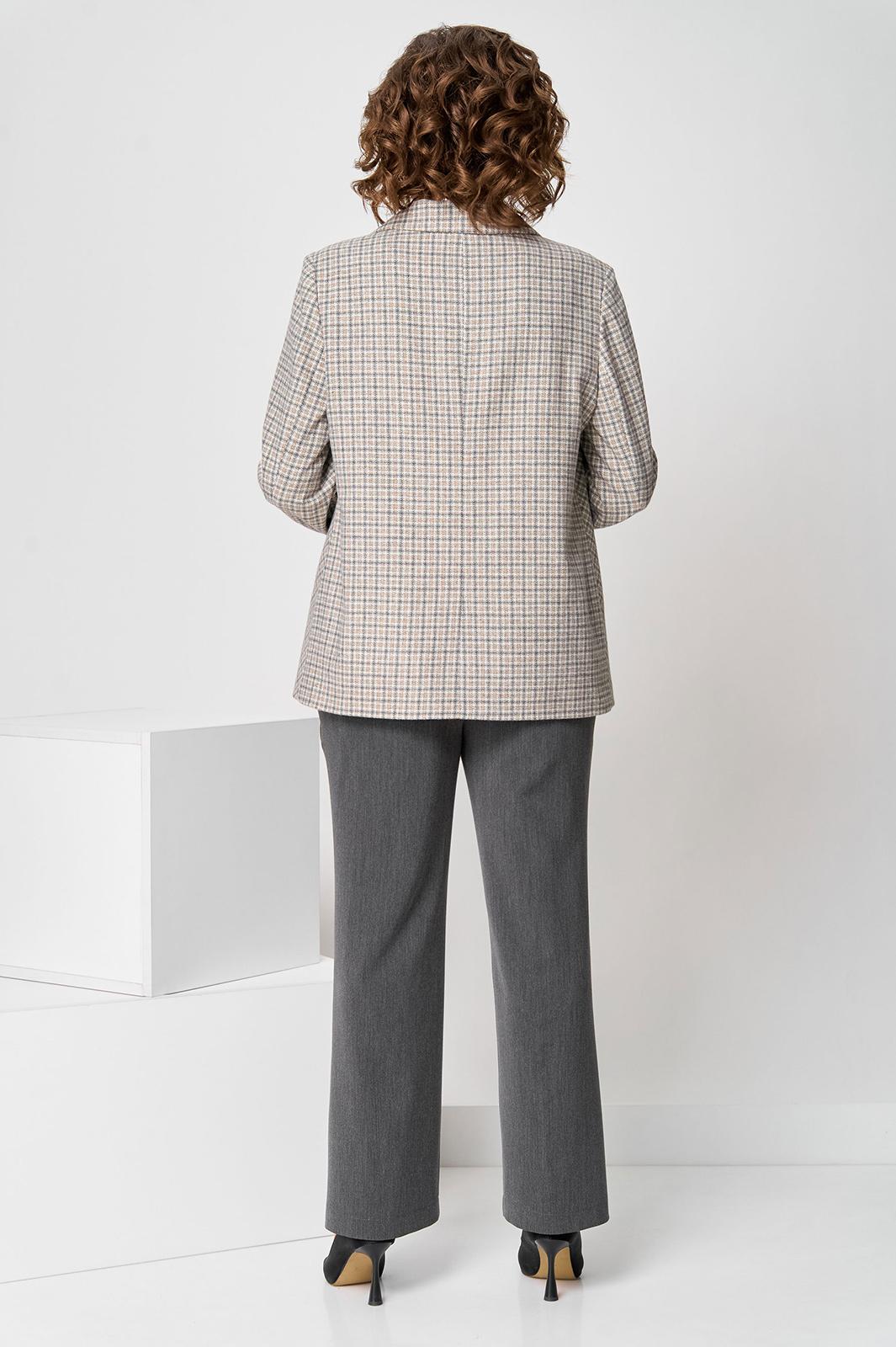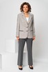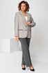 Костюм брючный (двойка) женский полуприлегающего силуэта, состоит из жакета и брюк. Костюм выполнен из костюмной ткани в полоску. Изделие на подкладке. Жакет с бортами и двухшовными рукавами. Внизу рукава имитация шлицы. Перед с центральной застежкой на пуговицы. По переду рельефы с прорезными карманами. По низу переда борта с закруглениями. Спинка с центральным швом. Брюки классические, на поясе с резинкой. Застежка на гульфик, на тесьму-молнию. Вверху косые карманы.