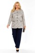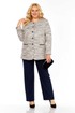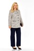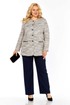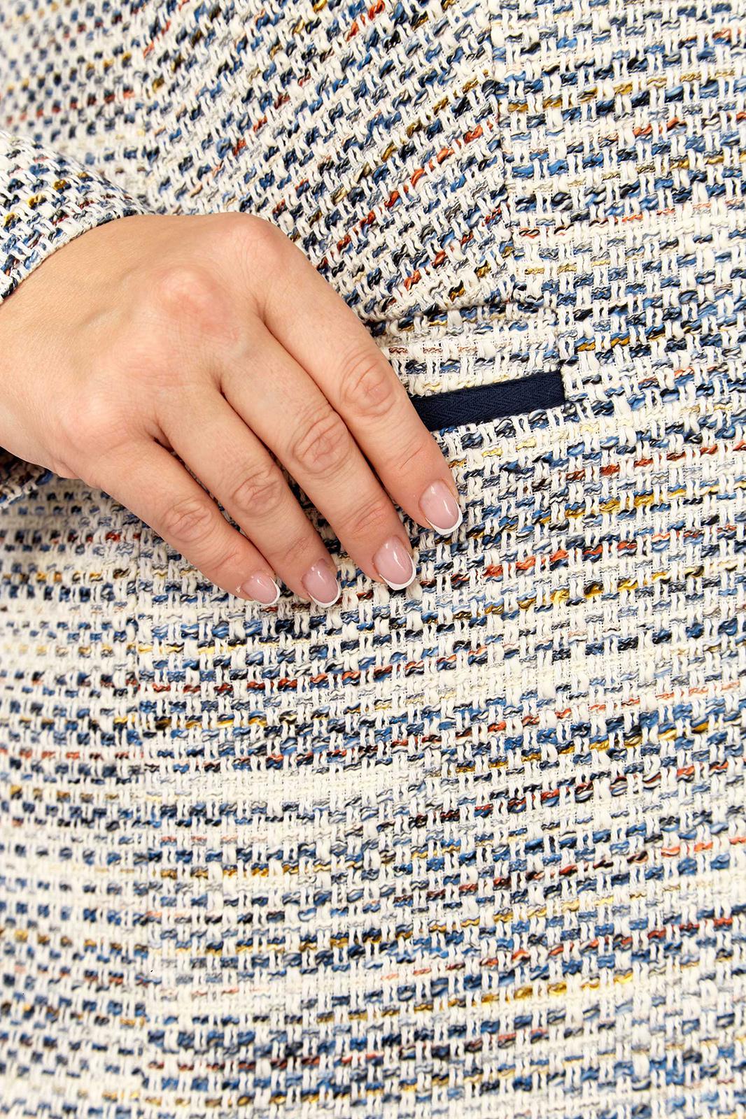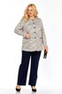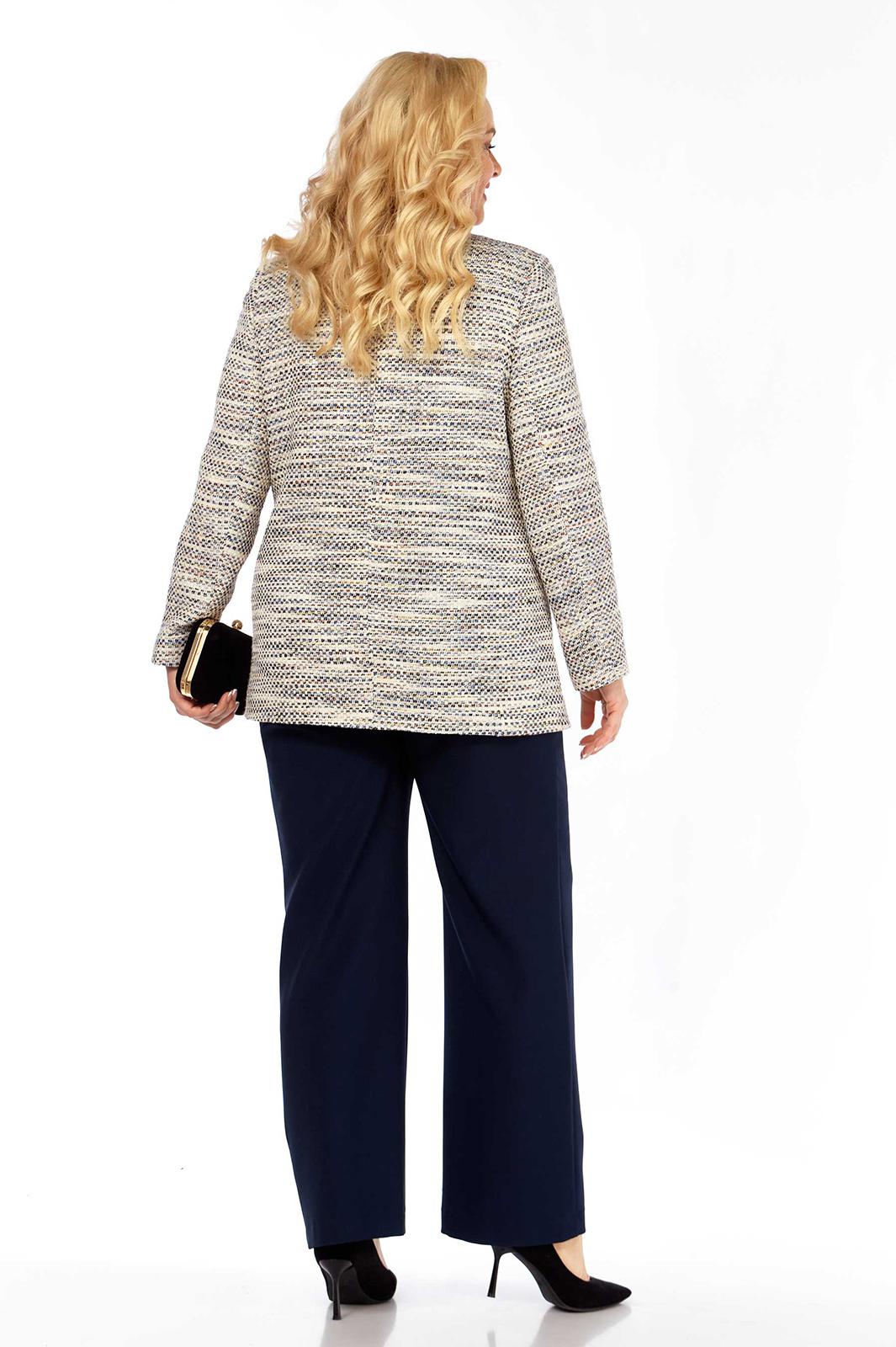 Костюм брючный (двойка) женский полуприлегающего силуэта, состоит из жакета и брюк. Жакет из ткани рогожка на подкладке, без воротника с центральной застежкой на петли-пуговицы. Перед с талиевыми вытачками, карманами, листочкой входящей в подрез бочка и рельефа. Спинка со средним швом. Вырез горловины круглый. Рукава втачные двухшовные. Брюки из костюмной ткани, с карманами в боковых швах. Оформлены притачным поясом, частично на резинке. Застежка на гульфик, на тесьму-молнию.
