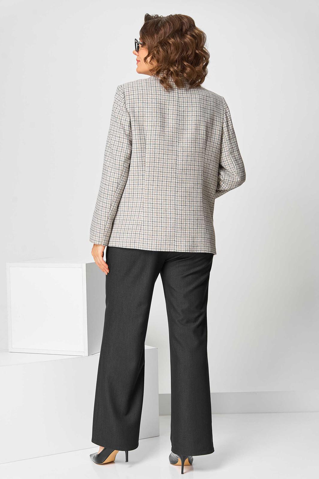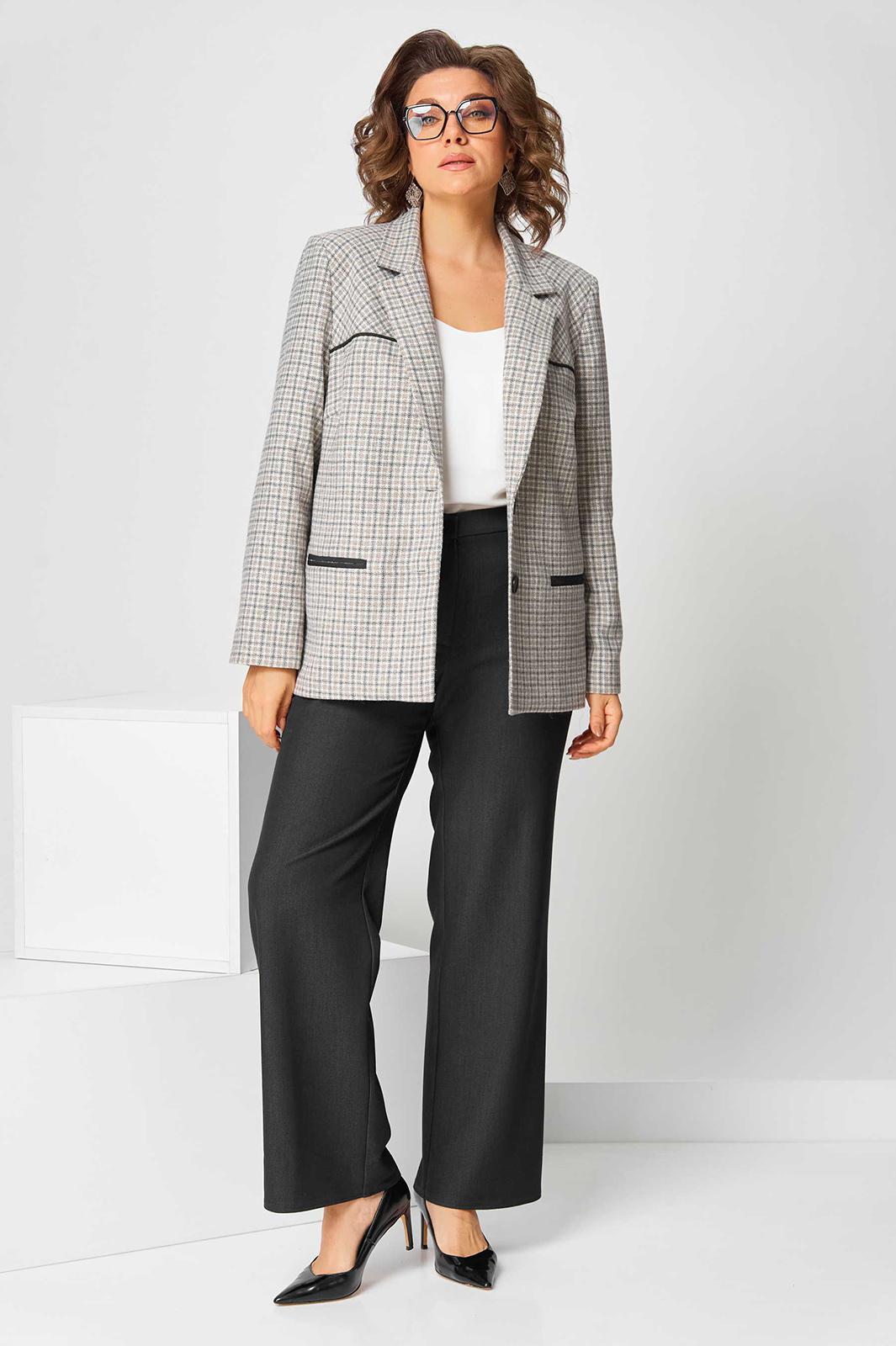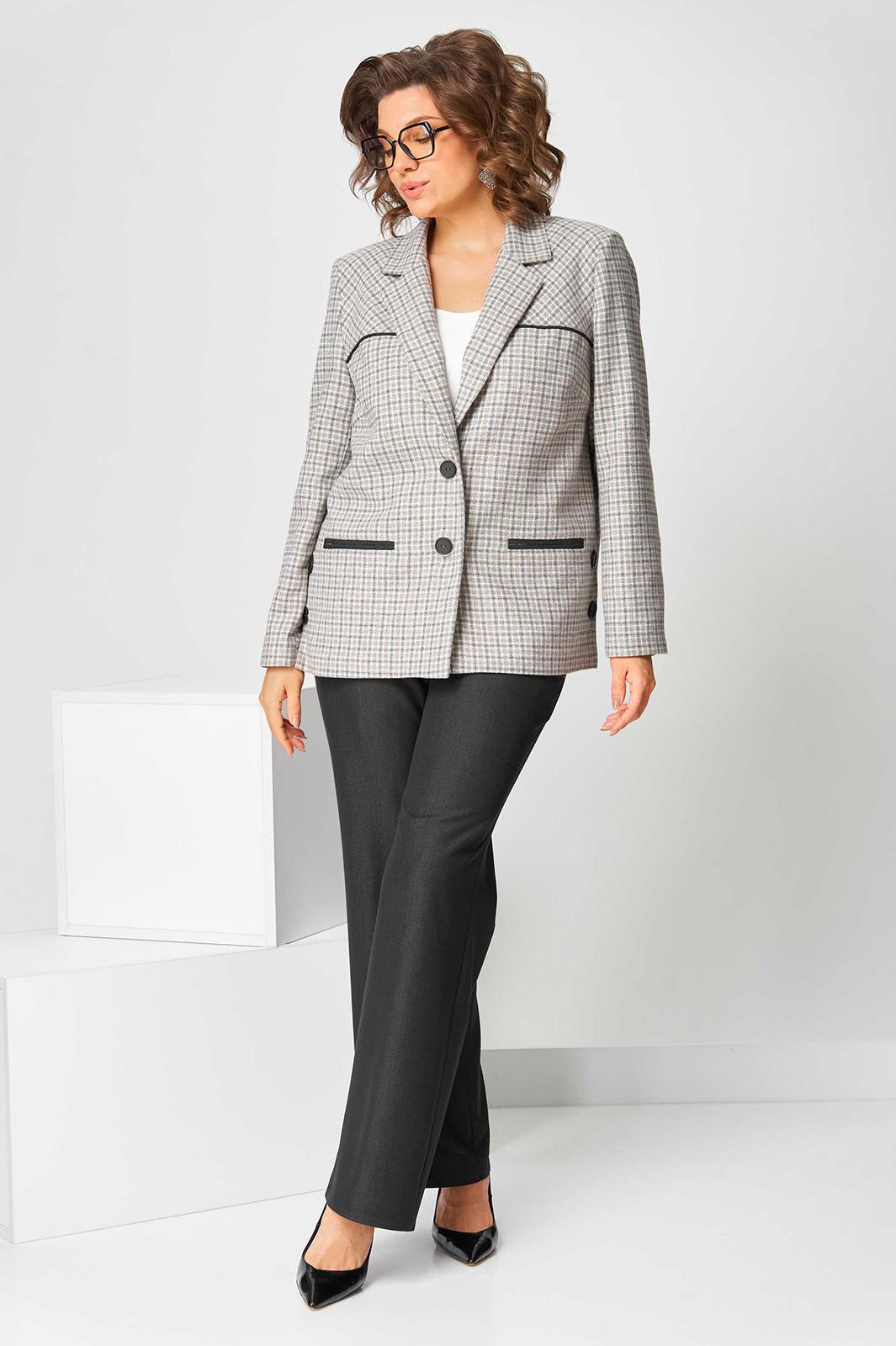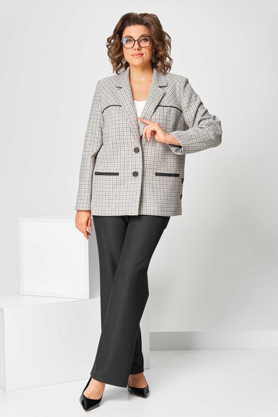 Комплект брючный женский полуприлегающего силуэта состоит из жакета и брюк. Жакет выполнен из полушерстяной ткани в клетку. Жакет на подкладке, с бортом и двухшовными рукавами. Перед с центральной застежкой на пуговицы. По переду выполнены кокетки с кантом и прорезные карманы в рамку. В боковых швах шлицы и застежка на пуговицы. Спинка со средним швом и выточками. Брюки из костюмной ткани, с карманами в боковых швах; оформлены притачным поясом, частично на резинке. Застежка на гульфик, на тесьму-молнию.