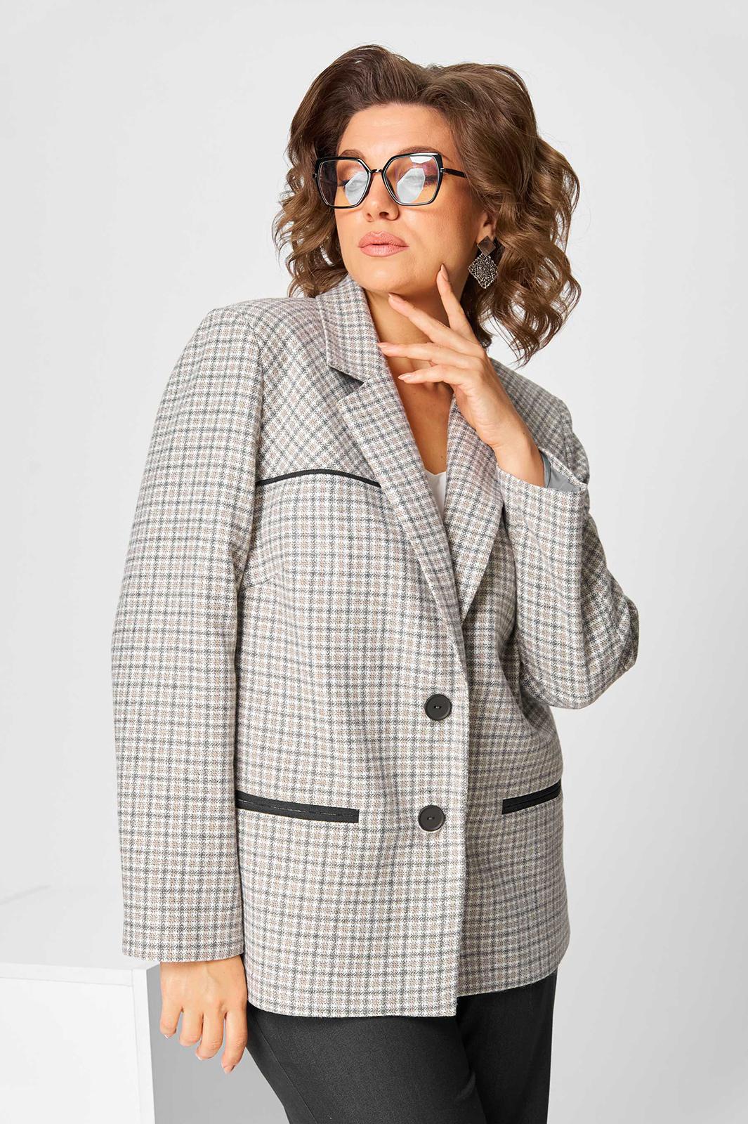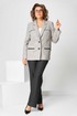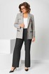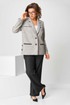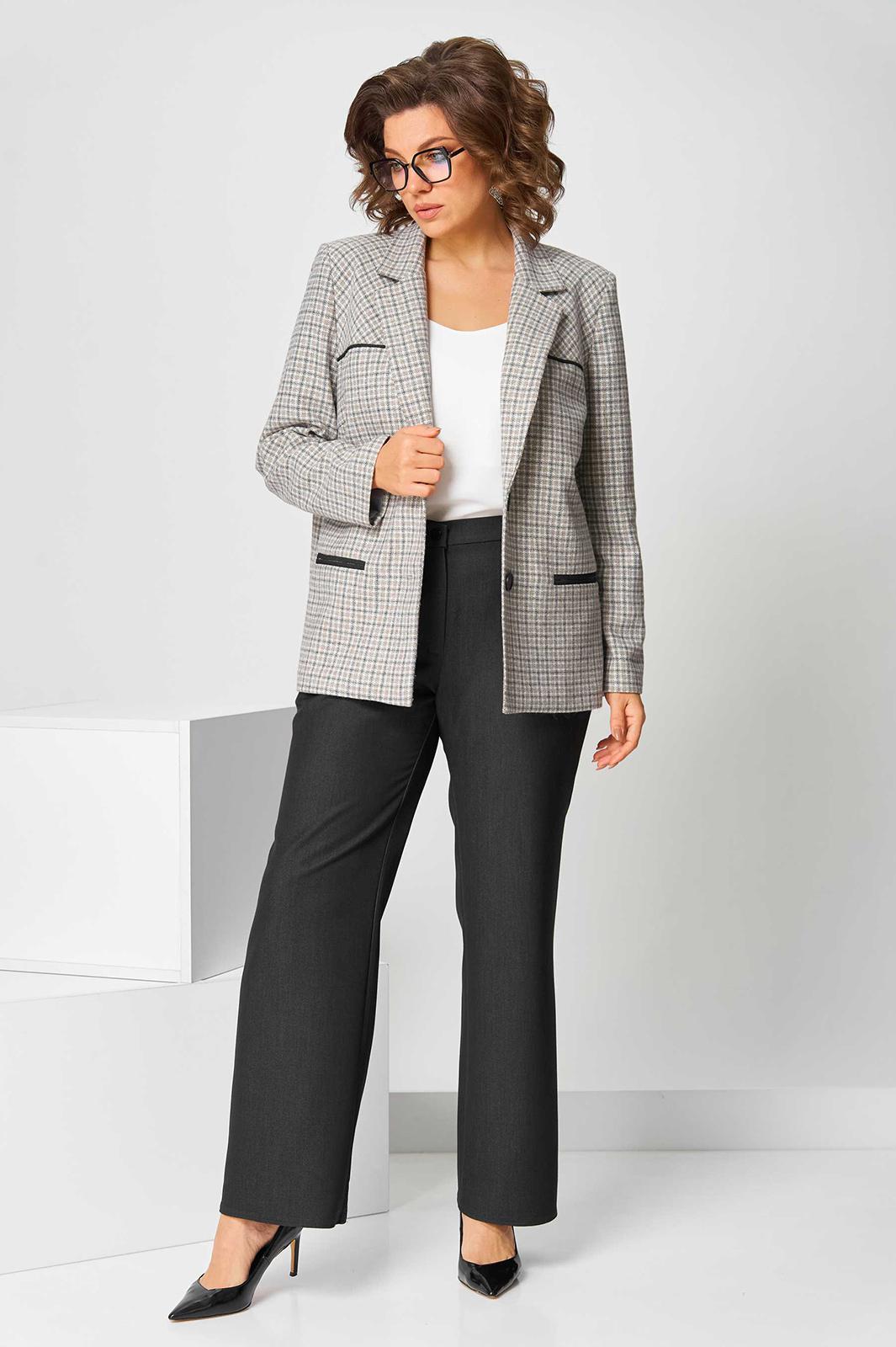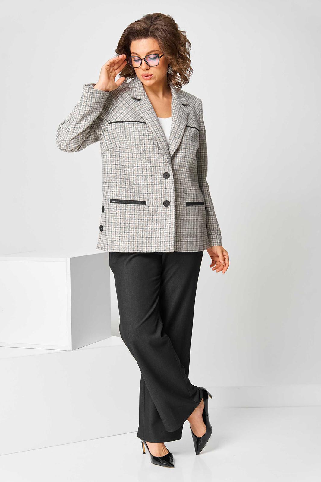 Комплект брючный женский полуприлегающего силуэта состоит из жакета и брюк. Жакет выполнен из полушерстяной ткани в клетку. Жакет на подкладке, с бортом и двухшовными рукавами. Перед с центральной застежкой на пуговицы. По переду выполнены кокетки с кантом и прорезные карманы в рамку. В боковых швах шлицы и застежка на пуговицы. Спинка со средним швом и выточками. Брюки из костюмной ткани, с карманами в боковых швах; оформлены притачным поясом, частично на резинке. Застежка на гульфик, на тесьму-молнию.