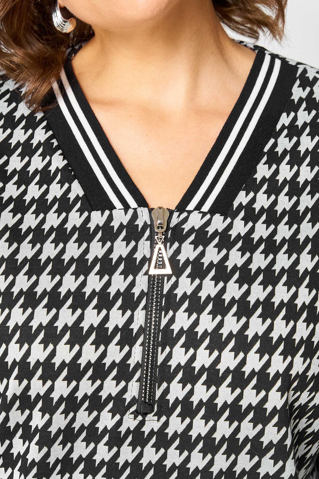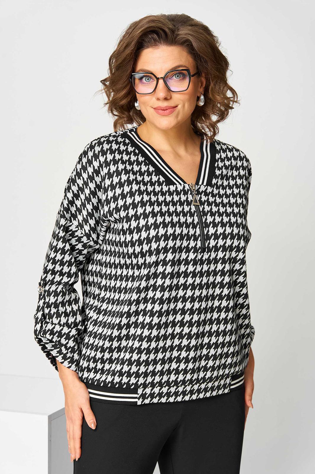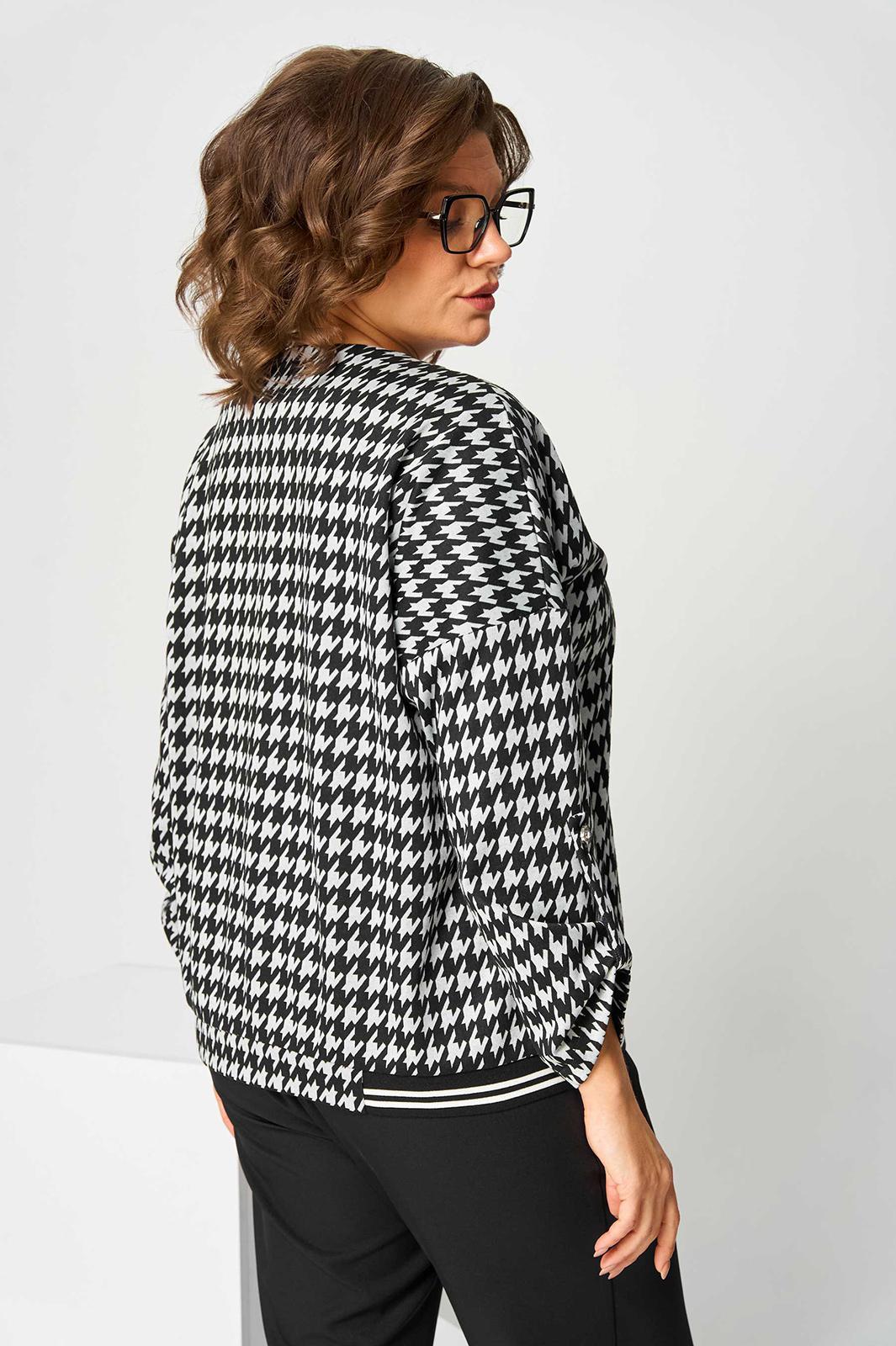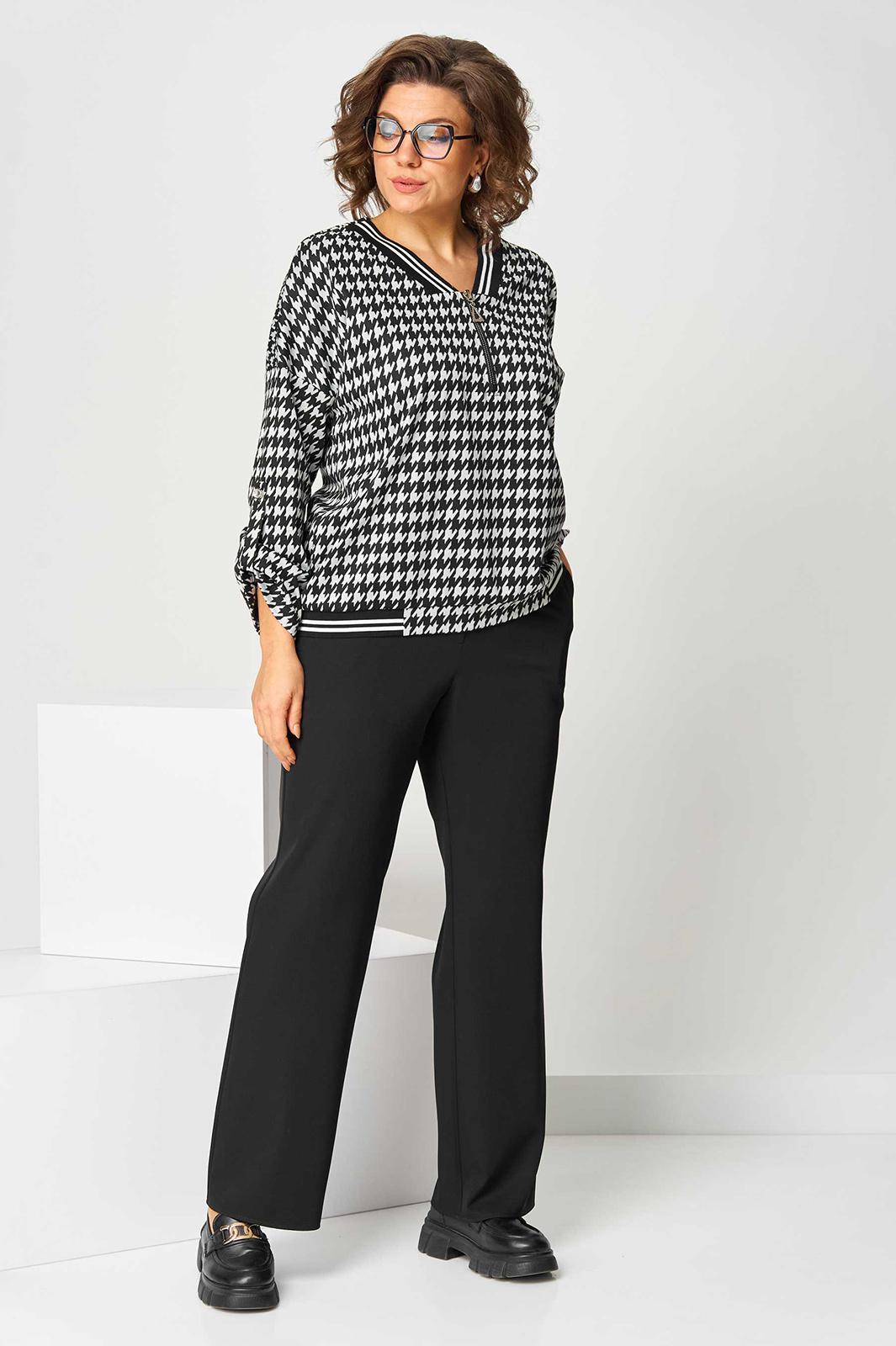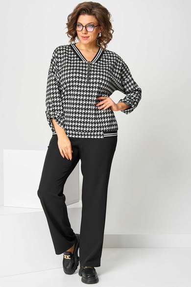 Костюм брючный (двойка) женский полуприлегающего силуэта, состоит из джемпера и брюк. Костюм выполнен и трикотажного полотна и брючной ткани. Джемпер без застежки, рукав длинный с фигурной вставкой. По центру джемпера вставлена молния, по горловине и низу джемпера довяз. Рукав спущенный с патой. Брюки классические, со стрелками на поясе с резинкой. Застежка на гульфик, на тесьму-молнию. Вверху косые карманы.