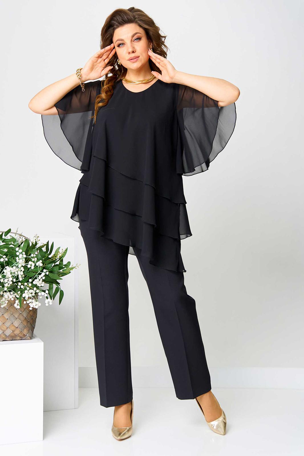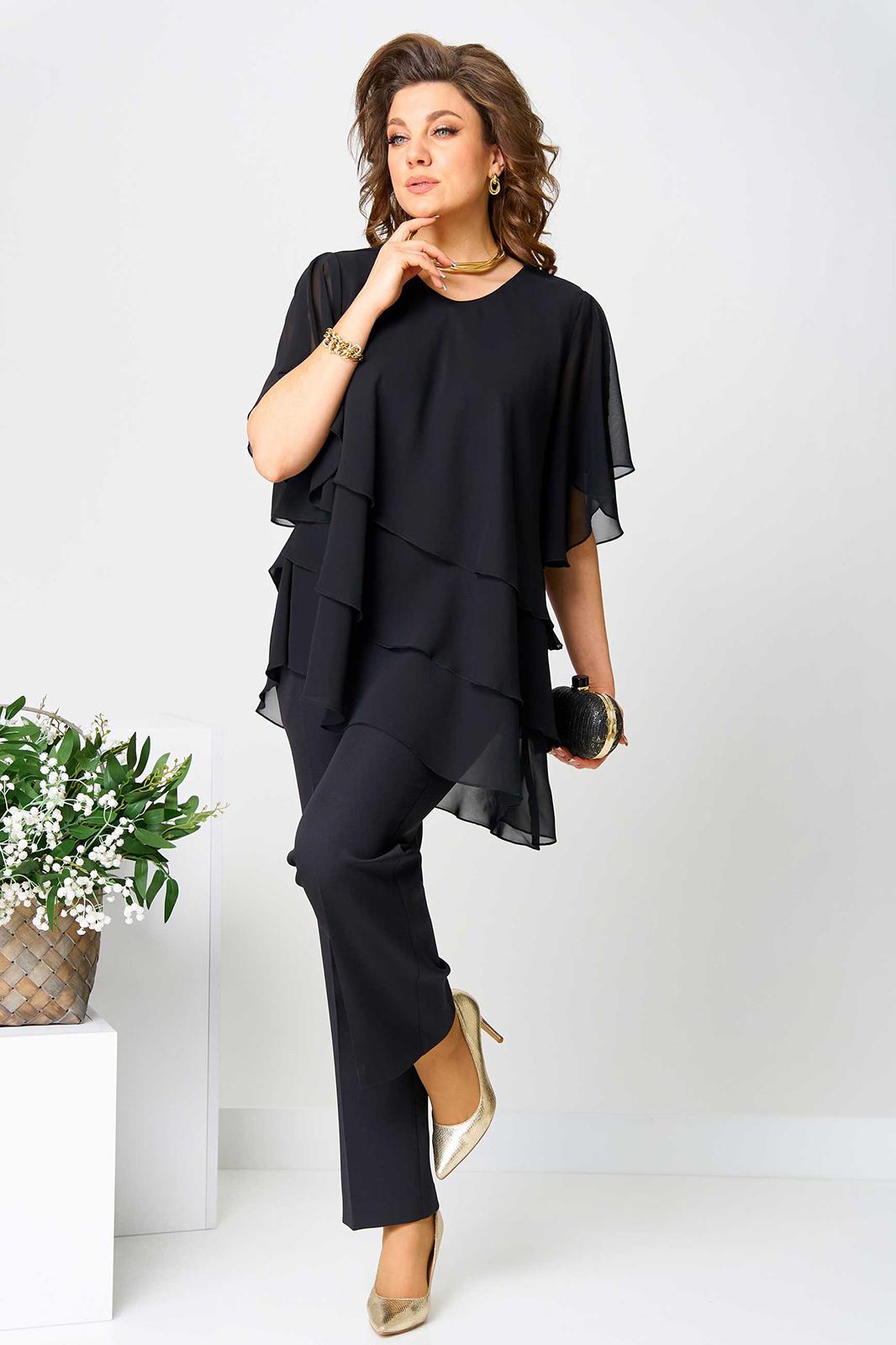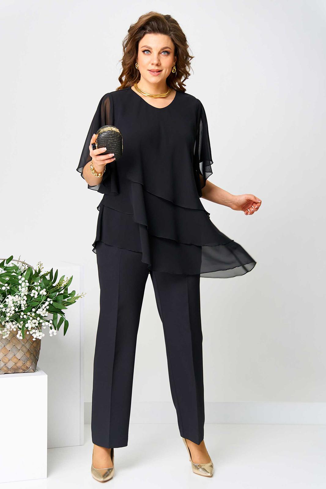 Костюм брючный (двойка) женский свободного силуэта, состоит из блузки и брюк. Блузка с рукавом 3/4 с разрезом и фигурным низом. Изделие (блузка) трехслойное, все слои с асимметричным низом. Застежка-капелька на спинке. Брюки немного расширены к низу, на поясе с резинкой. Застежка на гульфик, на тесьму-молнию.