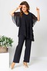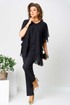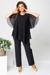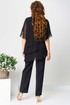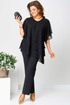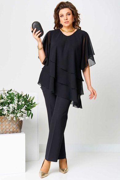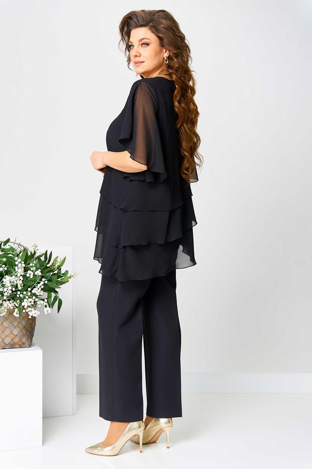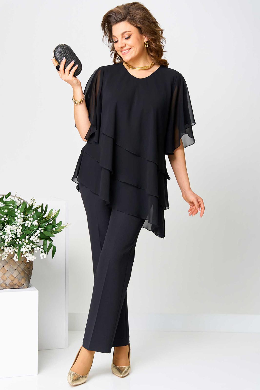 Костюм брючный (двойка) женский свободного силуэта, состоит из блузки и брюк. Блузка с рукавом 3/4 с разрезом и фигурным низом. Изделие (блузка) трехслойное, все слои с асимметричным низом. Застежка-капелька на спинке. Брюки немного расширены к низу, на поясе с резинкой. Застежка на гульфик, на тесьму-молнию.