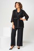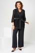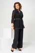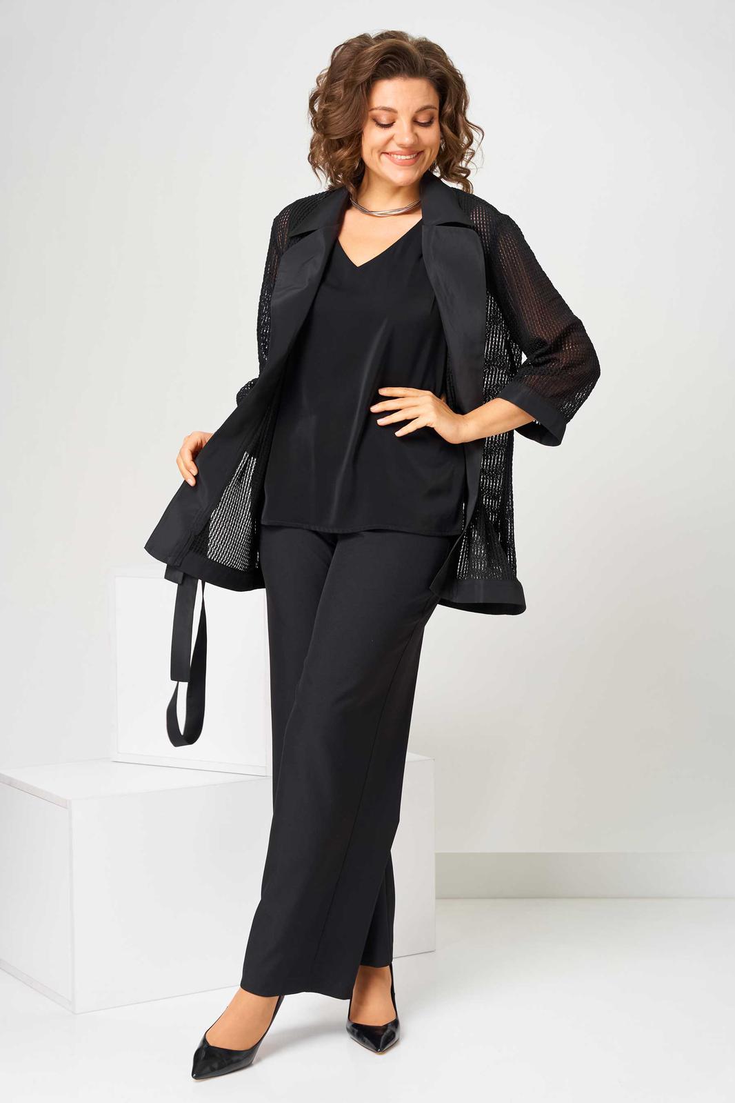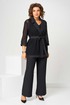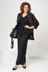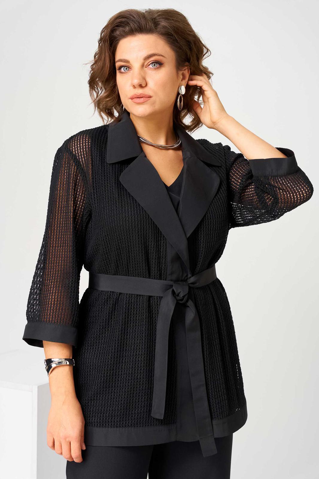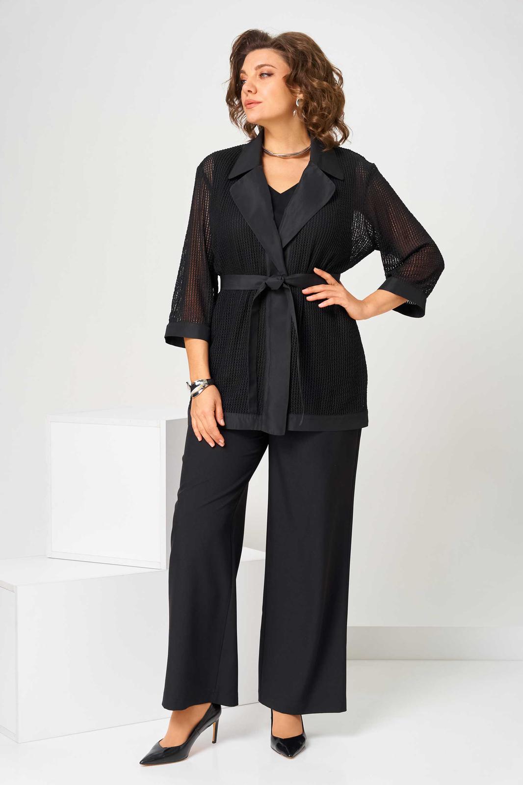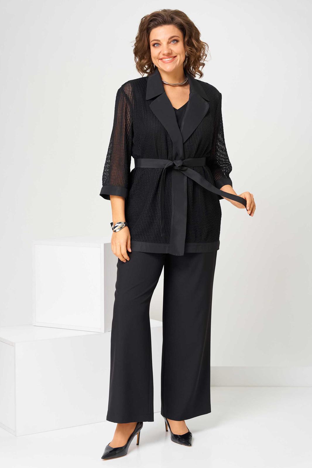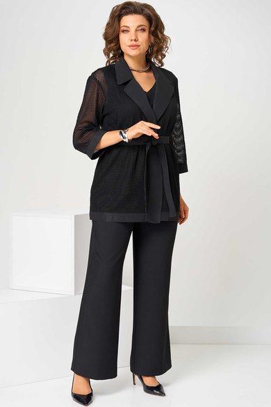 Костюм женский свободного силуэта, состоит из кардигана, брюк и топа. Кардиган свободного силуэта, из ткани сетка. Воротник пиджачного типа. Рукав втачной с манжетом, длиной 3/4. Кардиган со съемным поясом, без застежки. Брюки на поясе с резинкой, с карманами в боковых швах, с застежкой на гульфик-молнию. По передней половинке топа складки, выходящие из кокетки.