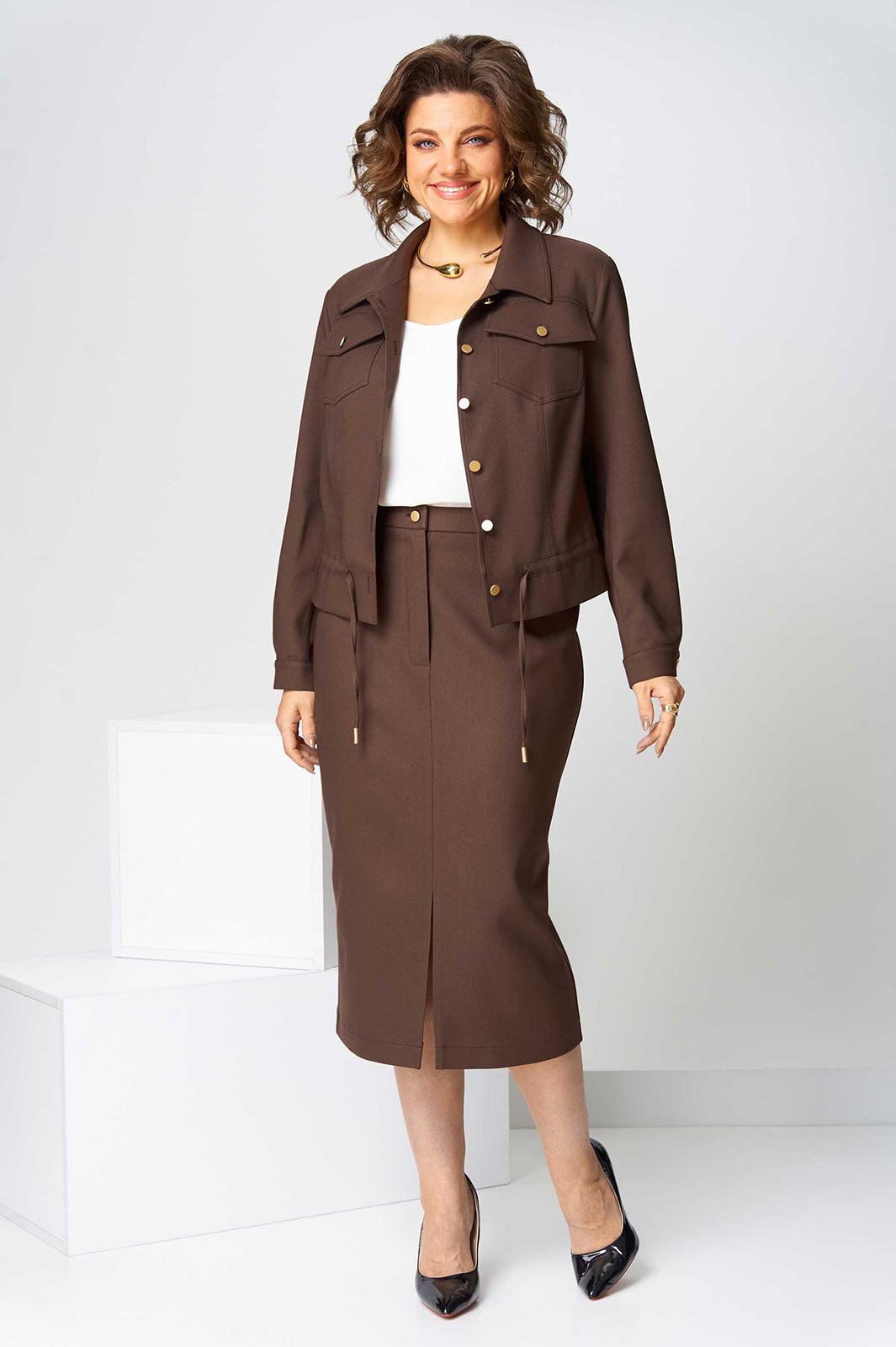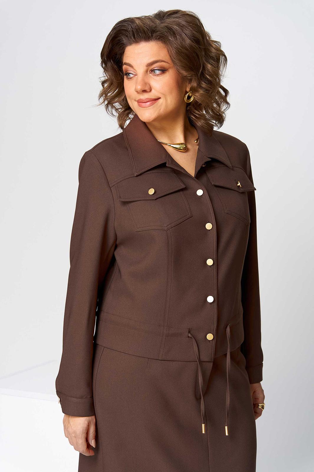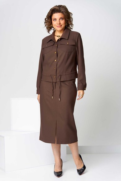 Костюм юбочный (двойка) женский свободного силуэта, состоит из жакета и юбки. Жакет без подкладки с центральной застежкой на петли и пуговицы, воротник отложной, рукав длинный с манжетом, застегивающимся на петлю. По спинке - кокетка. По переду кокетка и рельефы, выходящие из нее, накладные нагрудные карманы с клапанами. По низу жакета кулиска со шнуром и наконечниками.
